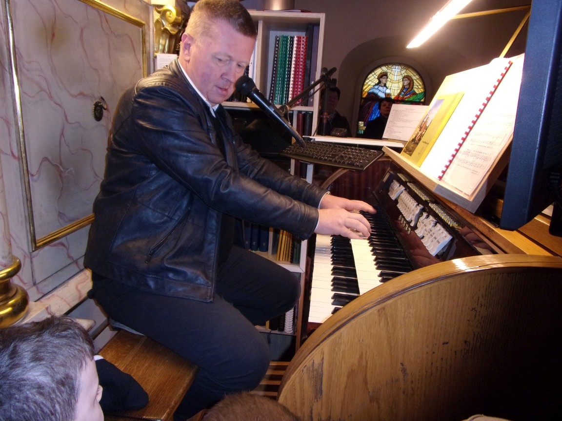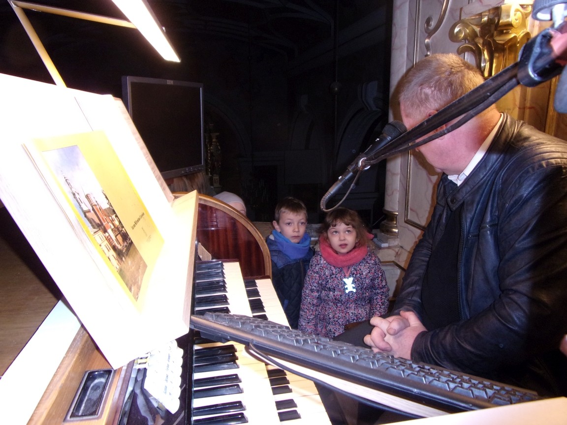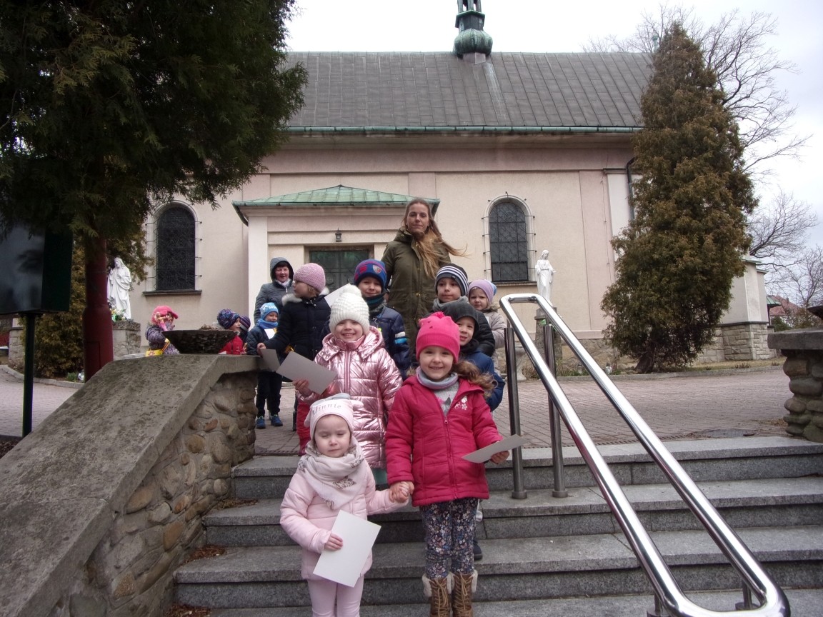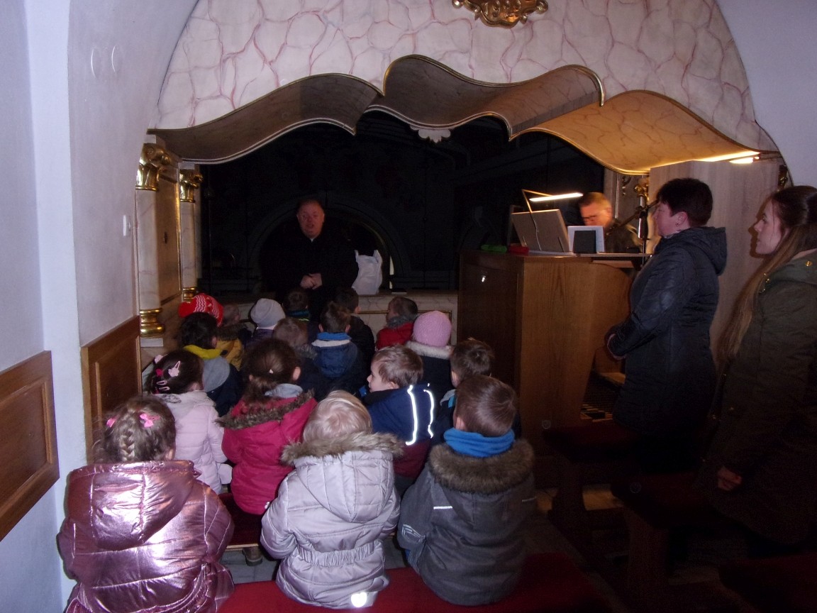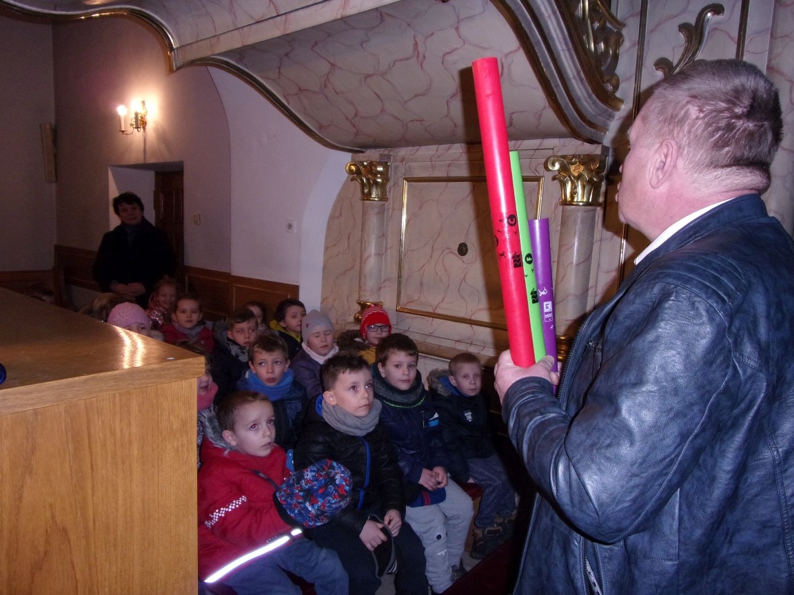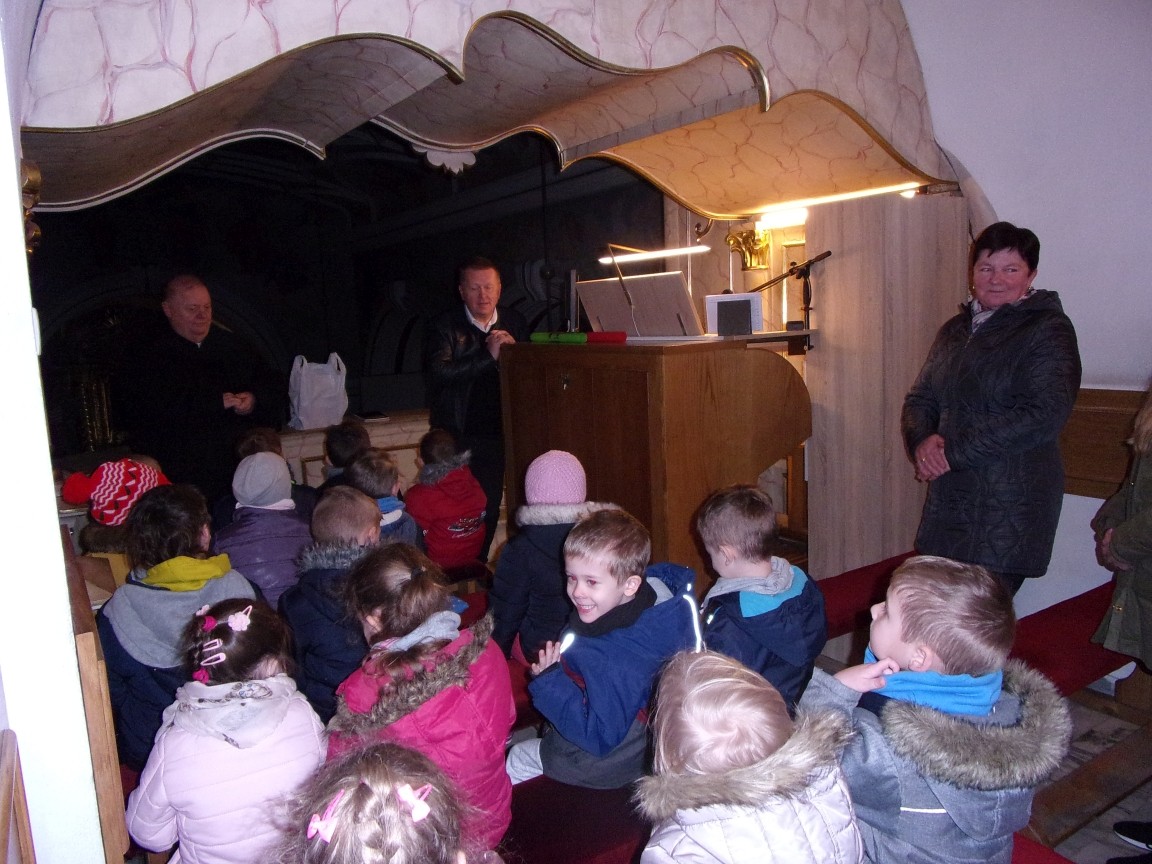 Organista Pan Jerzy Greń w niezwykle przystępny sposób przybliżył przedszkolakom i ich wychowawczyniom wszystkie tajniki królewskiego instrumentu. Z zapartym tchem dzieci słuchały granych przez niego utworów Jana Sebastiana Bacha. Entuzjazm wzbudził fragment  etiudy zagrany przez Pana Jerzego… nogami! Dzieci podziwiały imponującą konstrukcję organów kościelnych. Dowiedziały się, że przepiękna fasada organów widoczna dla wszystkich odwiedzających Kościół, to zaledwie niewielka część królewskiego instrumentu. Pan Jerzy opisał  działanie piszczałek organowych (osiągających nawet  5 m wysokości), wentylatora i pulpitu z trzema klawiaturami. Zaprezentował też historyczną już dzisiaj funkcję „kalikanta”, mechanicznie napełniającego miechy organowe powietrzem. Zachwyt dzieci wzbudziło malowidło na stropie chóru, o którym Ks. Jan Kracik napisał w swoim opracowaniu „Radziechowy. Parafia z jagiellońskich czasów” : „Na chórze- malowana na platformie muzykalna św. Cecylia patronuje pracy pana organisty, a szyba o zachodzie słońca przepuszcza promienie przez czerwone i niebieskie szaty Barbary i Katarzyny”.  Z całego serca dziękujemy Księdzu Dziekanowi oraz Panu Jerzemu Greniowi za niezwykle wartościowe spotkanie.