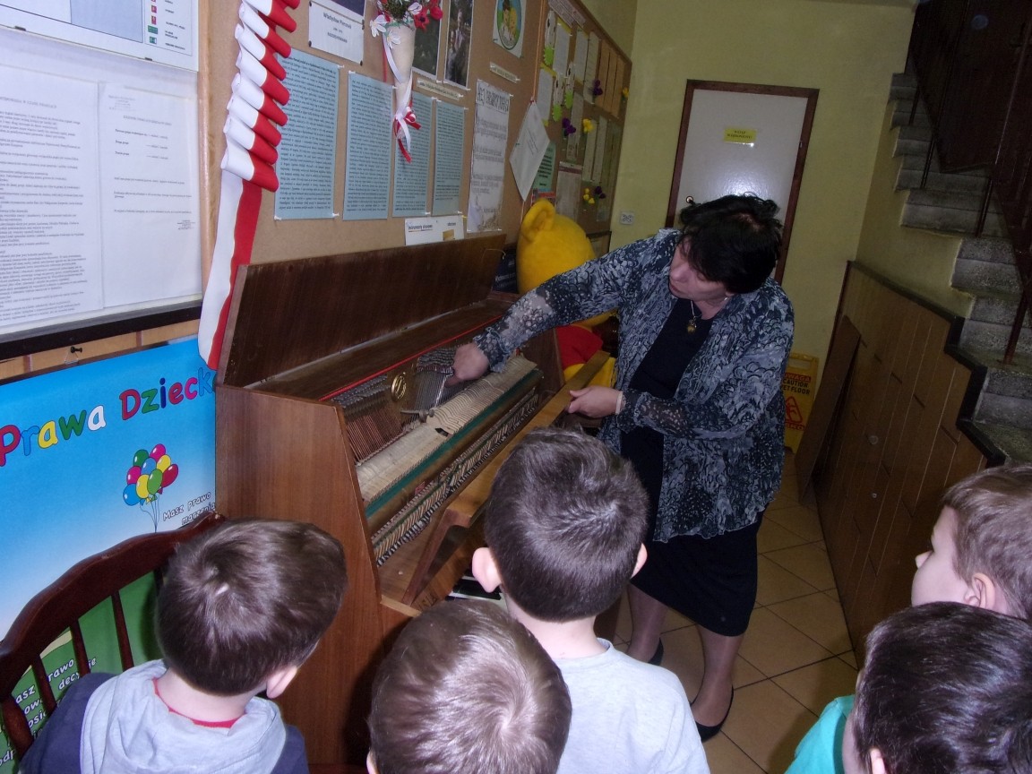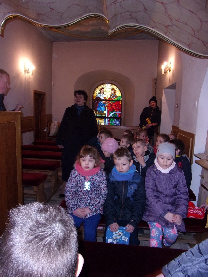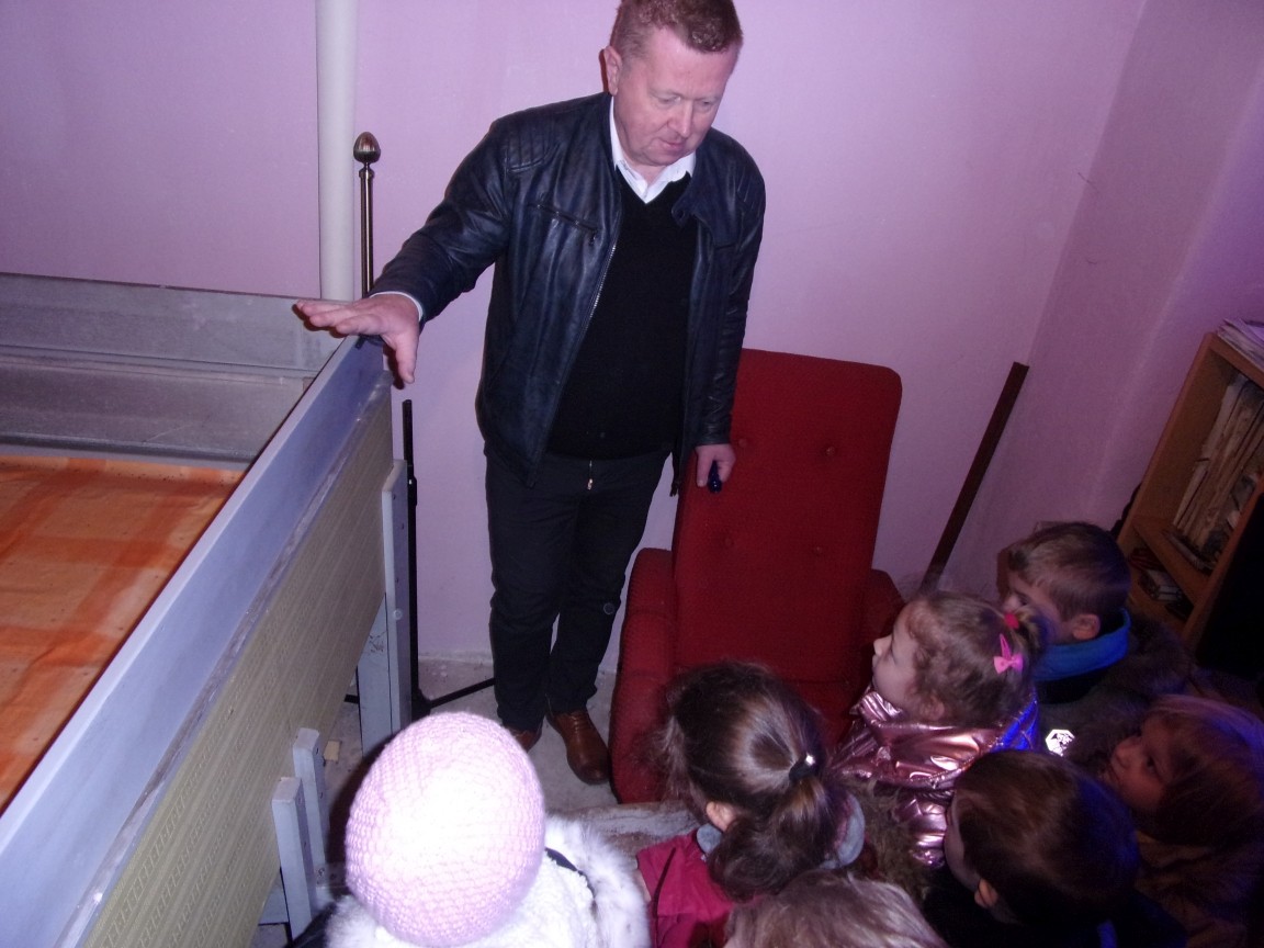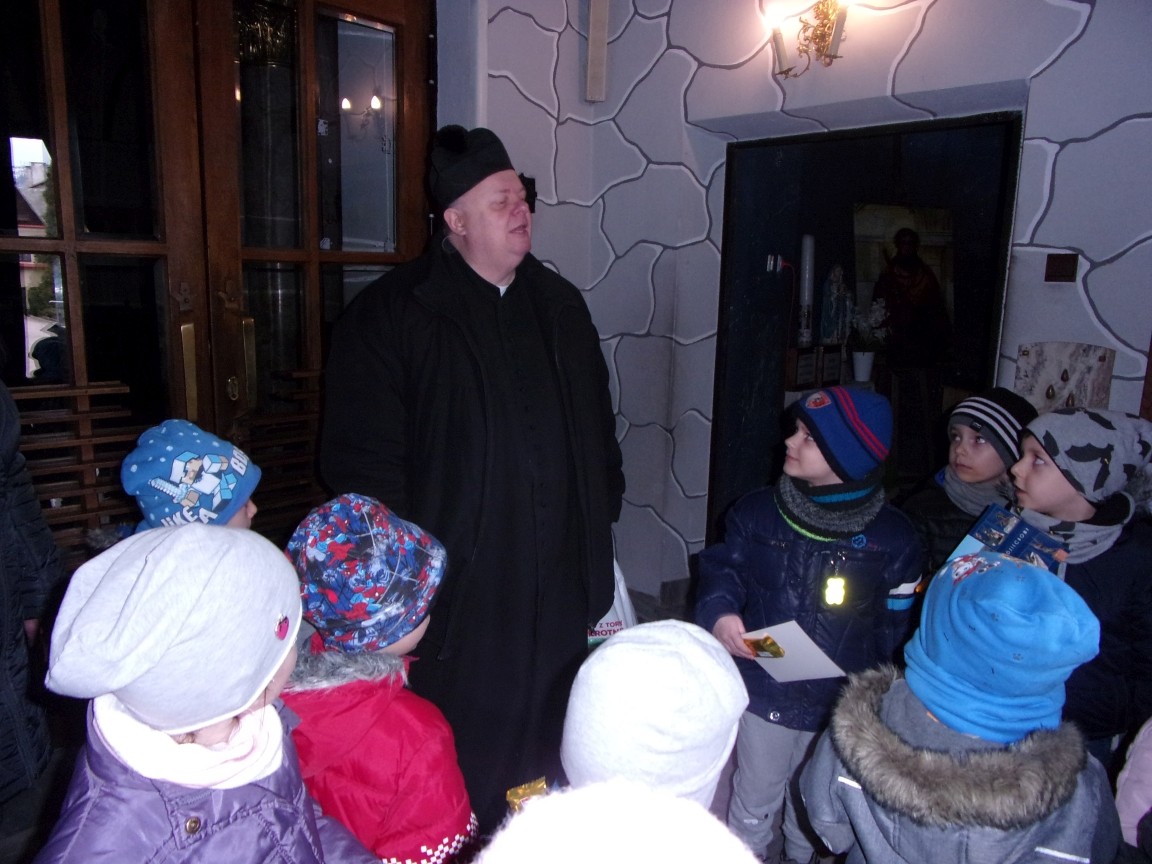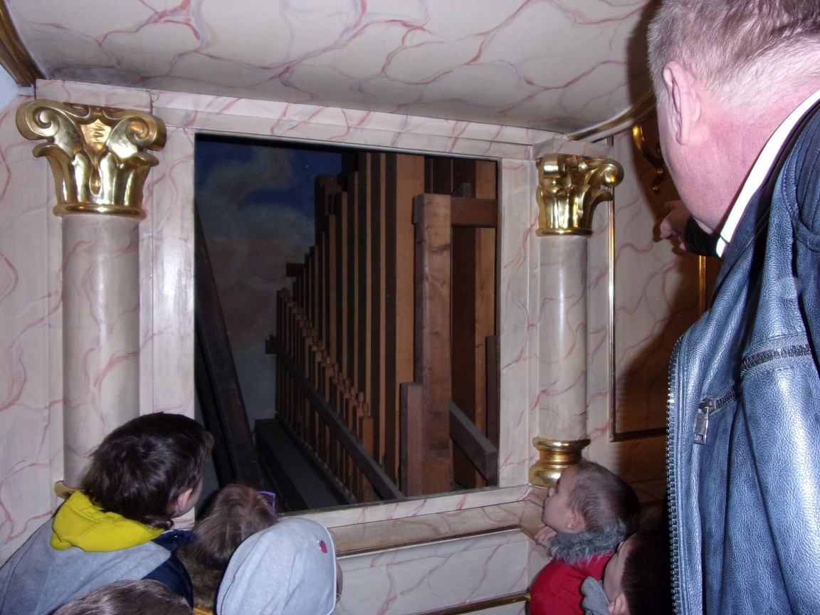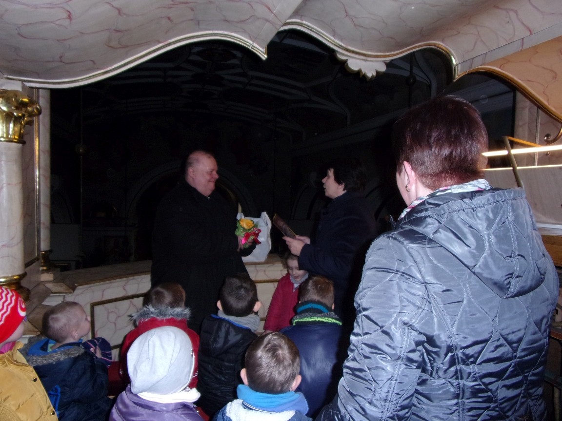 Organista Pan Jerzy Greń w niezwykle przystępny sposób przybliżył przedszkolakom i ich wychowawczyniom wszystkie tajniki królewskiego instrumentu. Z zapartym tchem dzieci słuchały granych przez niego utworów Jana Sebastiana Bacha. Entuzjazm wzbudził fragment  etiudy zagrany przez Pana Jerzego… nogami! Dzieci podziwiały imponującą konstrukcję organów kościelnych. Dowiedziały się, że przepiękna fasada organów widoczna dla wszystkich odwiedzających Kościół, to zaledwie niewielka część królewskiego instrumentu. Pan Jerzy opisał  działanie piszczałek organowych (osiągających nawet  5 m wysokości), wentylatora i pulpitu z trzema klawiaturami. Zaprezentował też historyczną już dzisiaj funkcję „kalikanta”, mechanicznie napełniającego miechy organowe powietrzem. Zachwyt dzieci wzbudziło malowidło na stropie chóru, o którym Ks. Jan Kracik napisał w swoim opracowaniu „Radziechowy. Parafia z jagiellońskich czasów” : „Na chórze- malowana na platformie muzykalna św. Cecylia patronuje pracy pana organisty, a szyba o zachodzie słońca przepuszcza promienie przez czerwone i niebieskie szaty Barbary i Katarzyny”.  Z całego serca dziękujemy Księdzu Dziekanowi oraz Panu Jerzemu Greniowi za niezwykle wartościowe spotkanie.