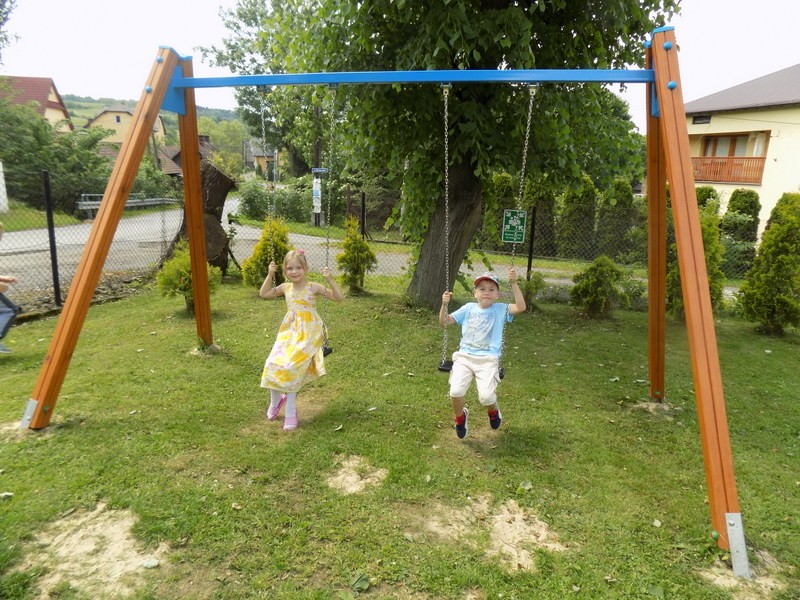 Huśtawki wkomponowane są w piękne otoczenie zieleni naszego ogrodu oraz wspaniale komponują się ze ścieżką sensoryczną powstałą w ramach realizacji projektu „Ścieżka Małego Badacza”.