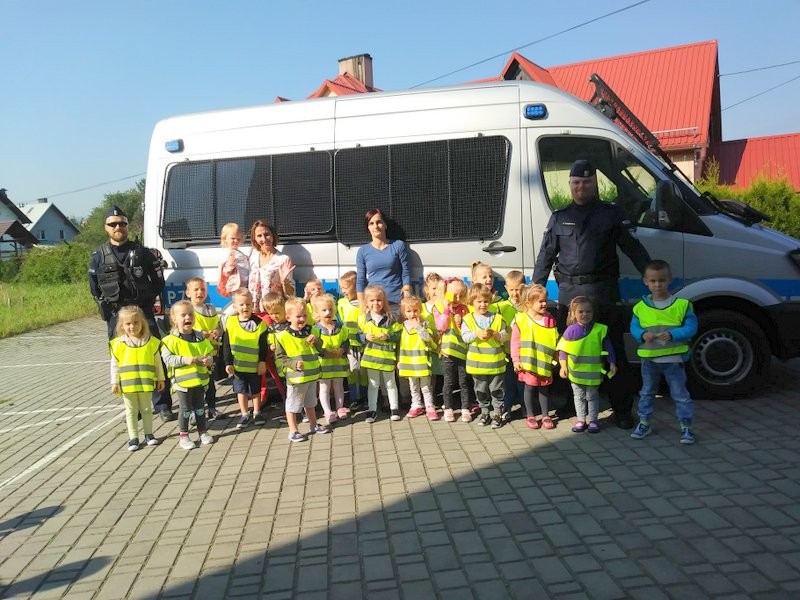 Dlatego też, w tym celu co roku w Publicznym Przedszkolu w Wieprzu realizowane są projekty związane z szeroko pojętym bezpieczeństwem przedszkolaków. W tym roku szkolnym 21.09.2018 r gościliśmy we wszystkich oddziałach naszego przedszkola funkcjonariuszy Samodzielnego Pododdziału Prewencji Policji w Bielsku Białej. Spotkanie zostało zrealizowane w ramach projektu edukacyjnego „Jesteśmy bezpieczni”, a jego celem było poruszenie bardzo ważnych aspektów dotyczących bezpieczeństwa przedszkolaków takich jak: kształtowanie postaw odpowiedzialnego zachowania się na drodze, uświadomienie przedszkolakom zagrożeń, jakie płyną ze strony kontaktów z nieznanymi osobami i zwierzętami oraz zabaw niebezpiecznymi przedmiotami, a także wzbogacenie wiedzy dzieci na temat sposobów uniknięcia w/w niebezpieczeństw. Spotkanie przebiegło w przyjemnej i serdecznej atmosferze. Przedszkolaki z zaciekawieniem oglądały prezentację multimedialną dotyczącą bezpieczeństwa na drogach, chętnie poruszały się w rytm piosenek o tematyce bezpieczeństwa na jezdni. Prowadzący przypominał również o korzyści noszenia ubrań i obuwia posiadającego elementy odblaskowe. Każdy przedszkolak otrzymał od funkcjonariuszy naklejkę odblaskową. Największą atrakcją dla naszych podopiecznych był pokaz sprzętów wykorzystywanych do utrzymania bezpieczeństwa na drodze oraz w trakcie służby. Przedszkolaki chętnie przymierzały stroje oraz oglądały przedmioty codziennej pracy. Warto wspomnieć, iż dużą niespodziankę sprawiło im zwiedzanie radiowozu oraz pokaz syren i użytkowanie megafonu. Uśmiechom i radości nie było końca.