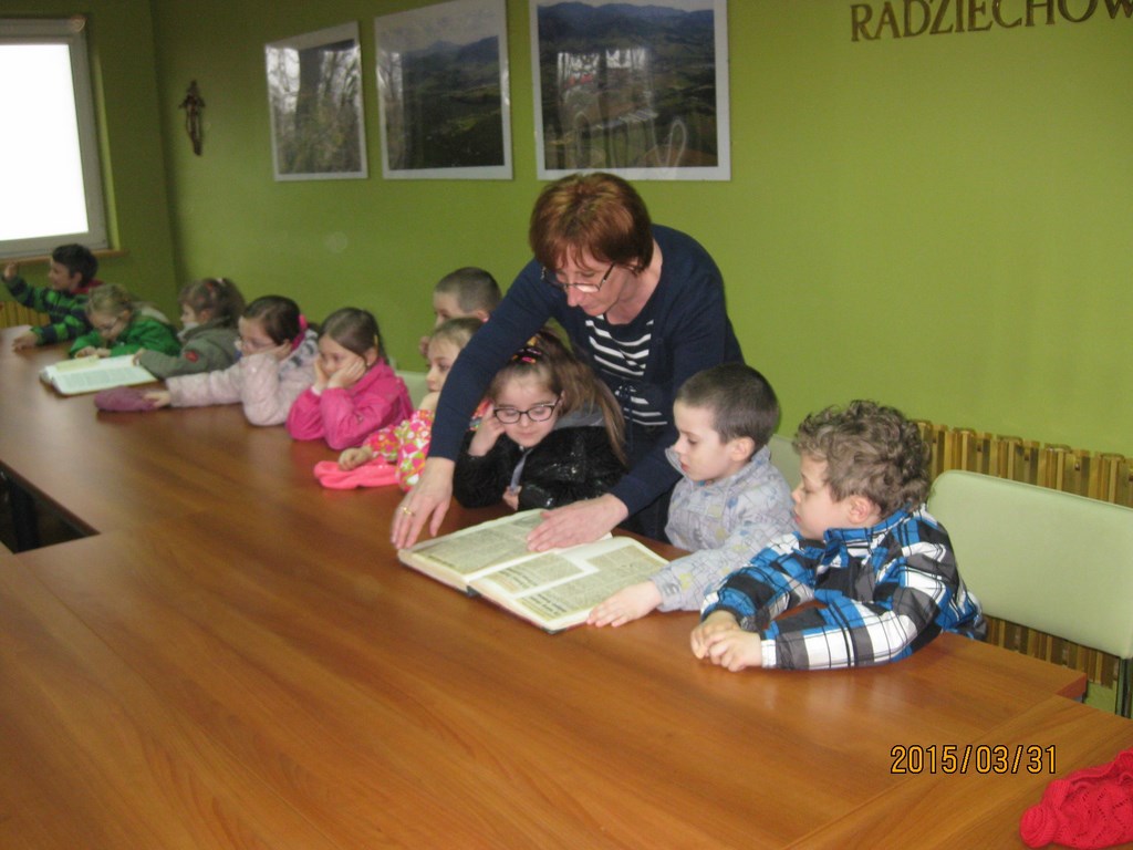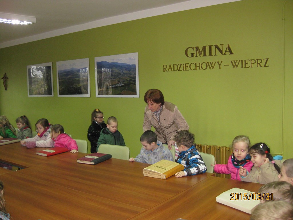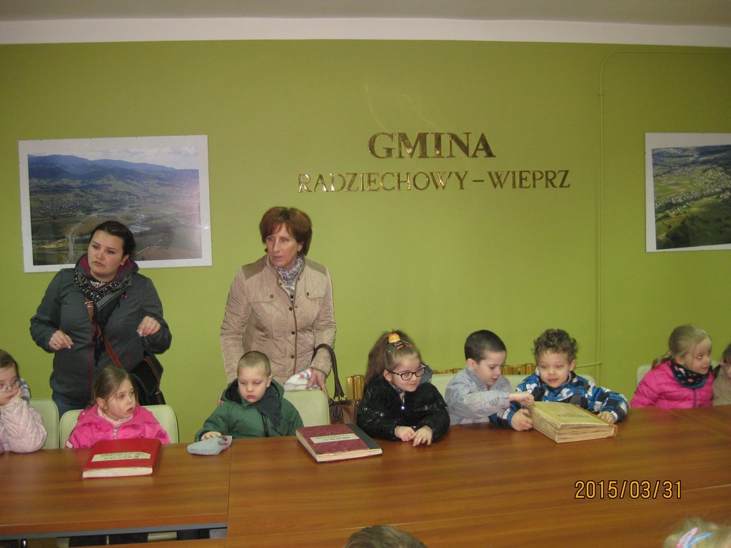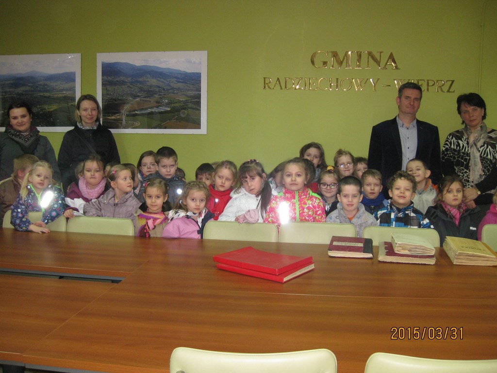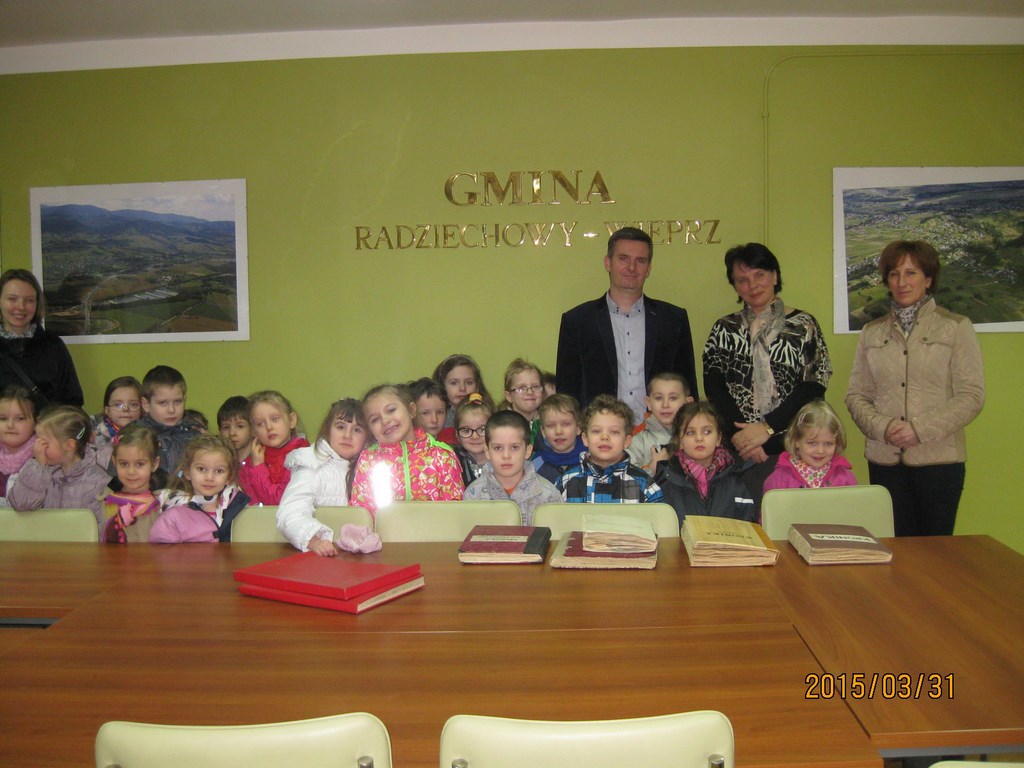 31 marca 2015r. dzieci z Publicznego Przedszkola w Radziechowach pod opieką wychowawczyń odwiedziły Urząd Gminy Radziechowy-Wieprz i spotkały się z Panem Wójtem Maciejem Miką. Po serdecznym powitaniu dzieci w swoim gabinecie, Pan Wójt zaprosił gości do sali sesyjnej, gdzie oczekiwały przygotowane do wglądu kroniki gminne. Większość tomów stworzona została przez Franciszka Ozimińskiego- byłego dyrektora szkoły i kronikarza Radziechów. Podczas, gdy przedszkolaki przeglądały z zainteresowaniem zgromadzone zbiory, Pan Maciej Mika w dostępny dla małego odbiorcy sposób przybliżył dzieciom historię gminy Radziechowy-Wieprz oraz rolę osób pracujących w urzędzie.