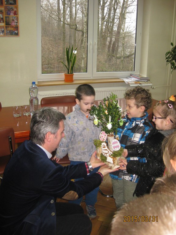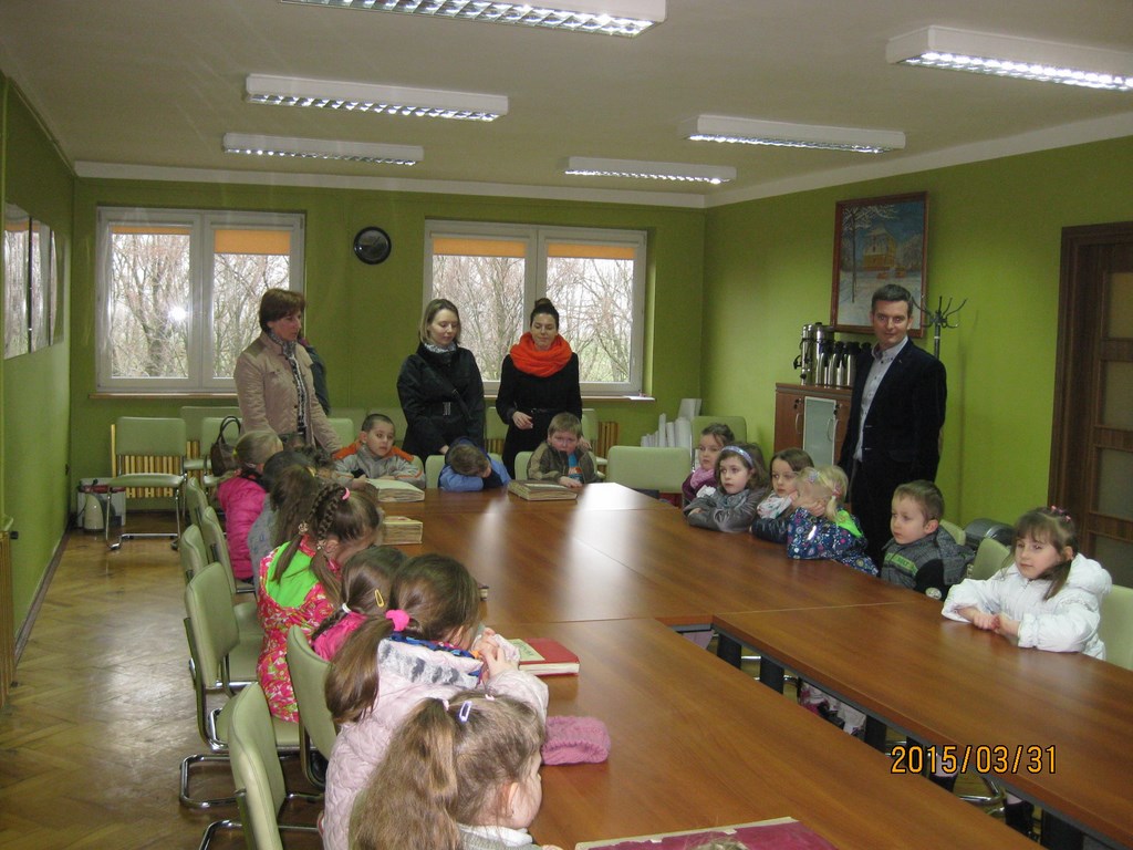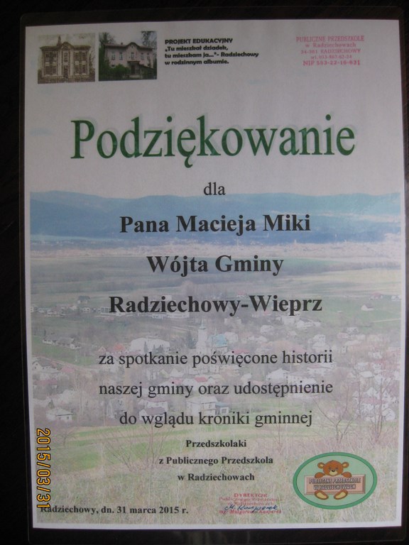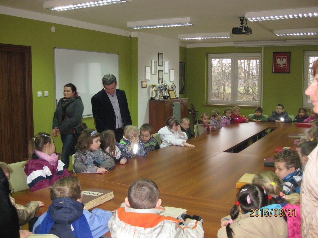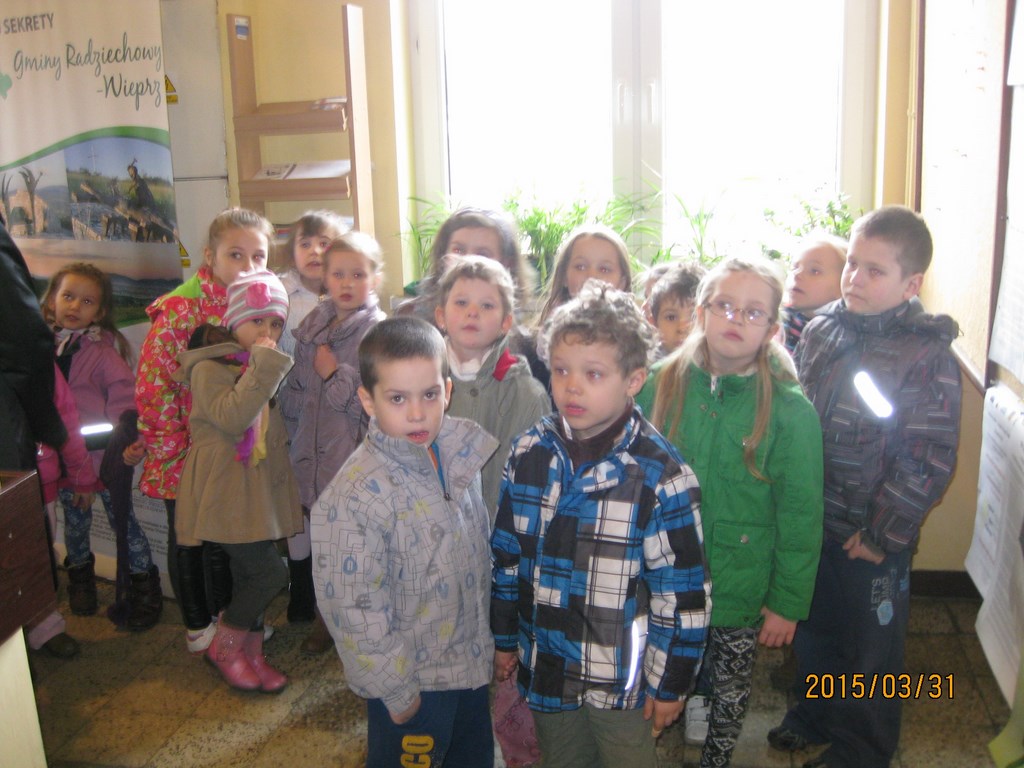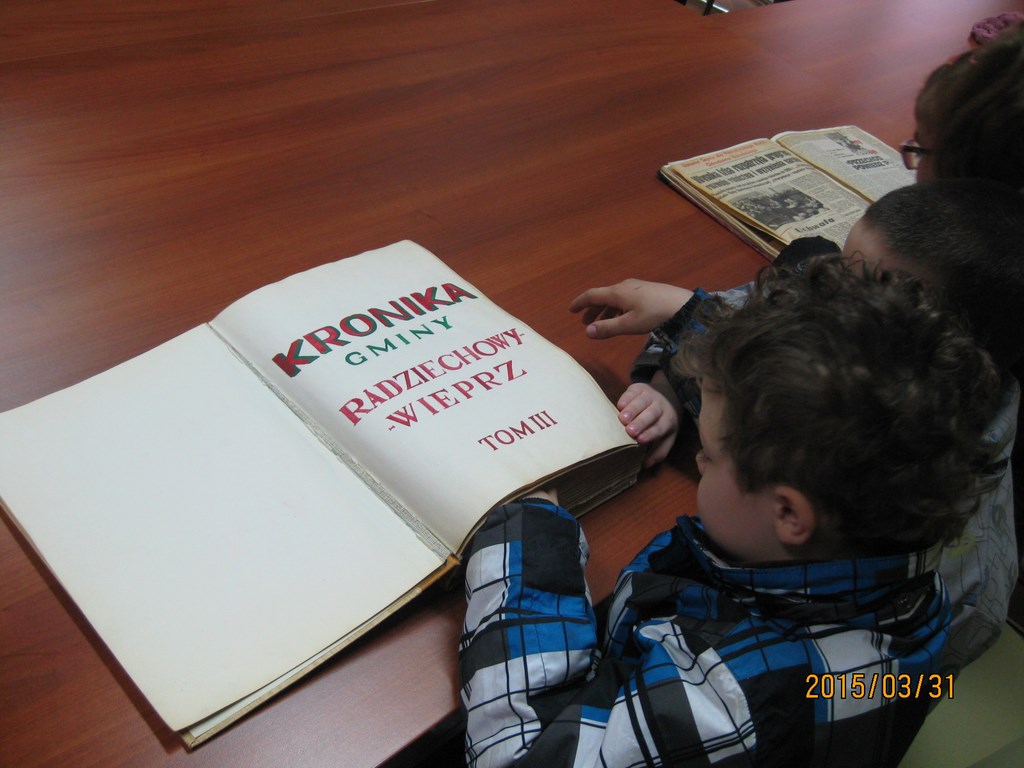 31 marca 2015r. dzieci z Publicznego Przedszkola w Radziechowach pod opieką wychowawczyń odwiedziły Urząd Gminy Radziechowy-Wieprz i spotkały się z Panem Wójtem Maciejem Miką. Po serdecznym powitaniu dzieci w swoim gabinecie, Pan Wójt zaprosił gości do sali sesyjnej, gdzie oczekiwały przygotowane do wglądu kroniki gminne. Większość tomów stworzona została przez Franciszka Ozimińskiego- byłego dyrektora szkoły i kronikarza Radziechów. Podczas, gdy przedszkolaki przeglądały z zainteresowaniem zgromadzone zbiory, Pan Maciej Mika w dostępny dla małego odbiorcy sposób przybliżył dzieciom historię gminy Radziechowy-Wieprz oraz rolę osób pracujących w urzędzie.