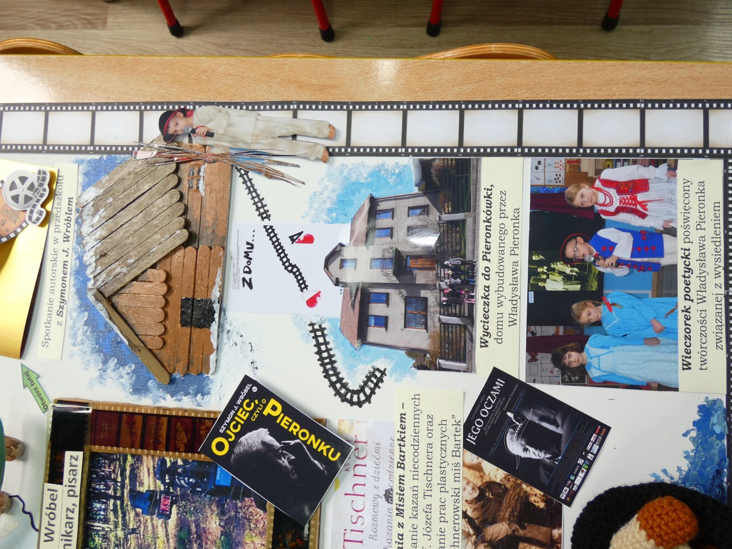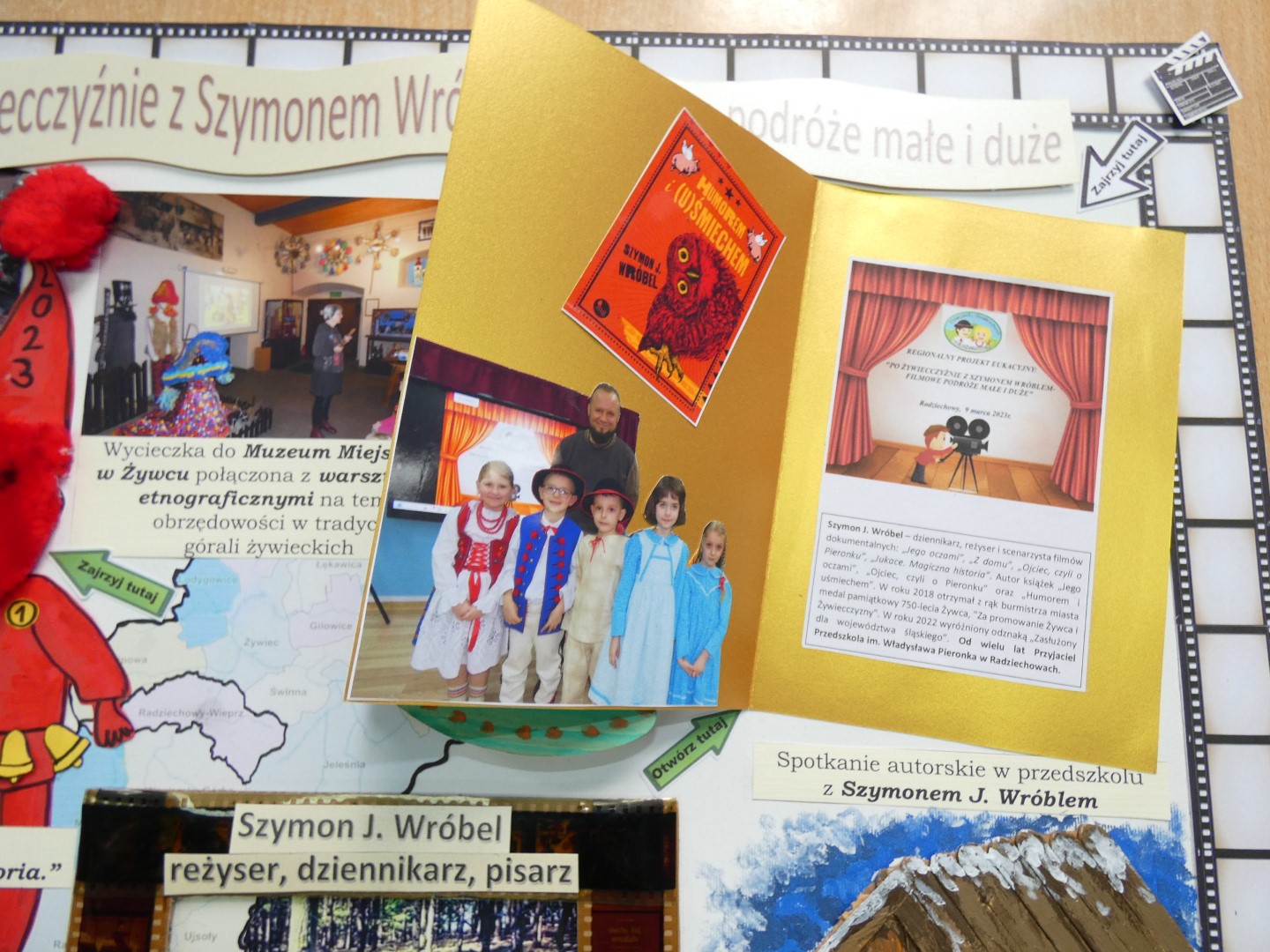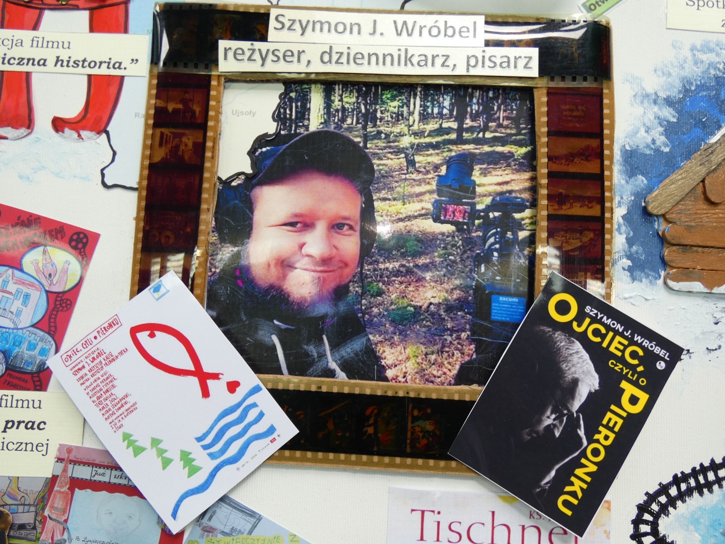 Teraz kilka zdań o osobie, której twórczość stała się motywem przewodnim naszego projektu edukacyjnego. Szymon J. Wróbel- reżyser filmów dokumentalnych, dziennikarz i pisarz urodzony w 1986 r. w Żywcu, należy do grona znamienitych przyjaciół naszego przedszkola. Pochodzi z Jeleśni na Żywiecczyźnie. W swoim dorobku ma filmy dokumentalne: „Jego oczami” (2012), „Z domu” (2016), „Ojciec, czyli o Pieronku” (2017), „Jukace. Magiczna historia” (2022). Jest autorem trzech książek: „Jego oczami” (2014), „Ojciec, czyli o Pieronku” (2018) oraz „Humorem i uśmiechem” (2021). Jego twórczość została wielokrotnie doceniona: zwycięstwo w plebiscycie „Osobowość roku 2017” w kategorii „Kultura”; odznaczenie medalem pamiątkowym 750-lecia Żywca w 2018 r. za promowanie Żywca i Żywiecczyzny; wyróżnienie odznaką „Zasłużony dla województwa śląskiego” w 2022 r.