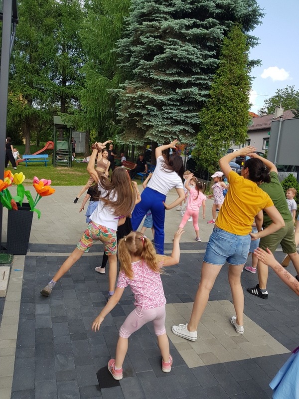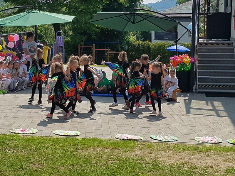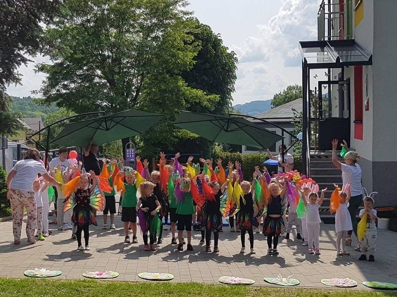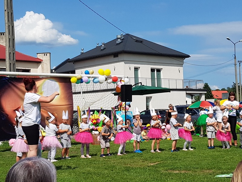 Podczas uroczystości dzieci przedstawiły swoim rodzicom piękny montaż słowno-muzyczny, przepełniony pięknymi tekstami wierszy i piosenek, również w języku angielskim oraz energicznymi tańcami w wykonaniu każdej grupy przedszkolnej. Całość uzupełniały bardzo kolorowe kostiumy i rekwizyty przygotowane dla występujących, a także piękna tematyczna scenografia. Dzięki temu wydarzenie to było niezwykle emocjonujące oraz kolorowe, przepełnione pozytywnymi emocjami. Po występach wszyscy rodzice zostali zaproszeni do przygotowanych przez nauczycieli zabaw sportowych z udziałem dzieci. Następnie profesjonalna trenerka Pani Karolina Jasek prowadziła zajęcia fitness dla pań i dziewczynek, a tatusiowie mieli okazję sprawdzić swoje siły w grupowym przeciąganiu liny. W tle imprezy cały czas trwały zabawy bańkami mydlanymi, malowanie twarzy, zaplatanie warkoczyków i wykonywanie tatuaży. Ponadto po 17.00 do dzieci przyjechała postać z bajki Psi Patrol – Chase, który razem z dziećmi brał udział w zabawach tanecznych, a kolejną atrakcją dla dzieci była wizyta funkcjonariuszy Policji z Samodzielnego Oddziału Prewencji z Bieska-Białej, którzy umożliwili dzieciom wraz z ich rodzicami zwiedzanie samochodu policyjnego. Dzieci były bardzo radosne i szczęśliwe. Po tak wielu atrakcjach i zabawach można było odpocząć na kocyku piknikowym, w cieniu rozłożystych drzew, a także smacznie zjeść i ugasić pragnienie, bo o stronę kulin arną imprezy zadbali rodzice przedszkolaków oraz pracownicy kuchni przedszkolnej. To był piękny dzień, pełen wzruszeń, dobrej zabawy, radości i uśmiechu, który widoczny był na twarzy każdego uczestnika pikniku.