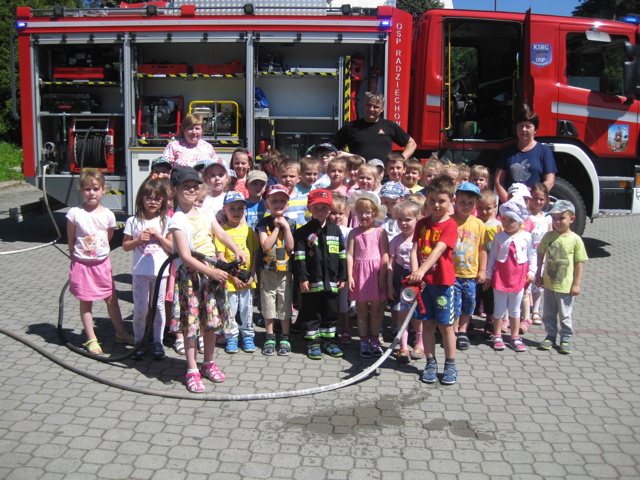 Za sprawą strażaków z OSP Radziechowy tegoroczne świętowanie Dnia Dziecka w Przedszkolu im. Władysława Pieronka w Radziechowach różniło się od wszystkich poprzednich. 2 czerwca 2017r. wychowankowie obydwu naszych przedszkoli mieli okazję uczestniczyć w bardzo atrakcyjnych zajęciach edukacyjnych zorganizowanych przez grupę strażaków OSP: prezesa Tomasza Klisia, sekretarza Pawła Płonkę oraz druha Stanisława Tracza. Druhowie przybyli nowoczesnym wozem strażackim i zaprezentowali dzieciom jego wyposażenie. Prezentacja możliwości sprzętu uzupełniona została o pokazy z zakresu udzielania pierwszej pomocy. Entuzjazm dzieci wywołała możliwość zwiedzenia wnętrza wozu strażackiego oraz własnoręczna obsługa pompy strażackiej. Swoistym zwieńczeniem strażackich atrakcji było obdarowanie przedszkolaków słodyczami. Długoletnia współpraca z Ochotniczą Strażą Pożarną w Radziechowach wpisała się już w tradycję radziechowskiego przedszkola. Niezaprzeczalne są też zasługi naszego Patrona Władysława Pieronka dla rozwoju OSP w latach międzywojennych i późniejszych. Jako oddany służbie społecznej druh, kronikarz oraz wieloletni naczelnik Rejonu Straży Pożarnych w 1966r. Władysław Pieronek został odznaczony Złotym Medalem za Zasługi dla Pożarnictwa. O wielkim zaangażowaniu Władysława Pieronka w służbę strażacką świadczą również zachowane w kronikach listy pochwalne oraz wiersze jego autorstwa. Wiersz napisany w 1955r. na okoliczność 50-lecia OSP w Radziechowach mimo upływu czasu nie stracił nic ze swej aktualności. Dzisiaj przypominając jego treść składamy strażakom z radziechowskiej OSP najserdeczniejsze życzenia i podziękowania: