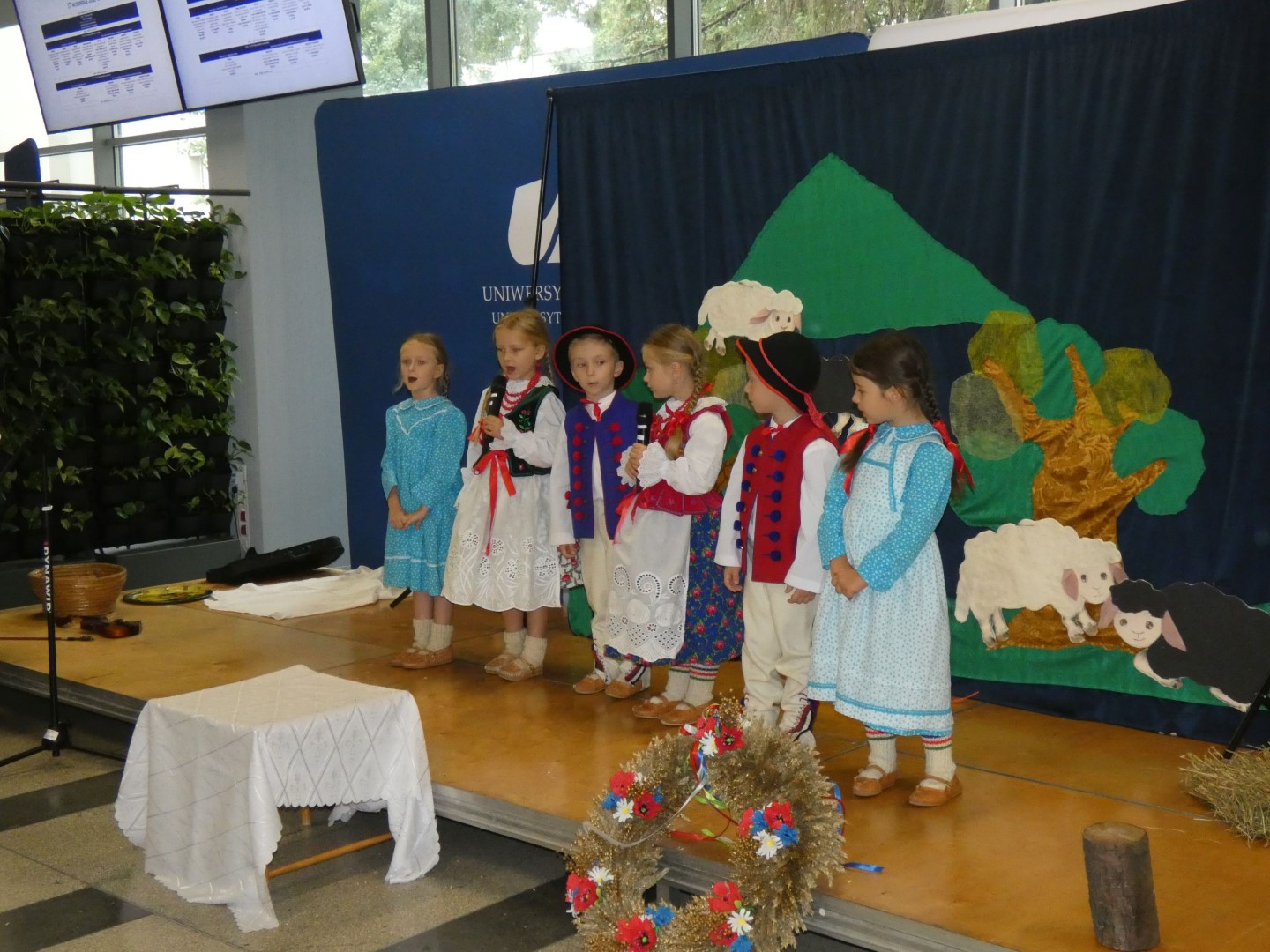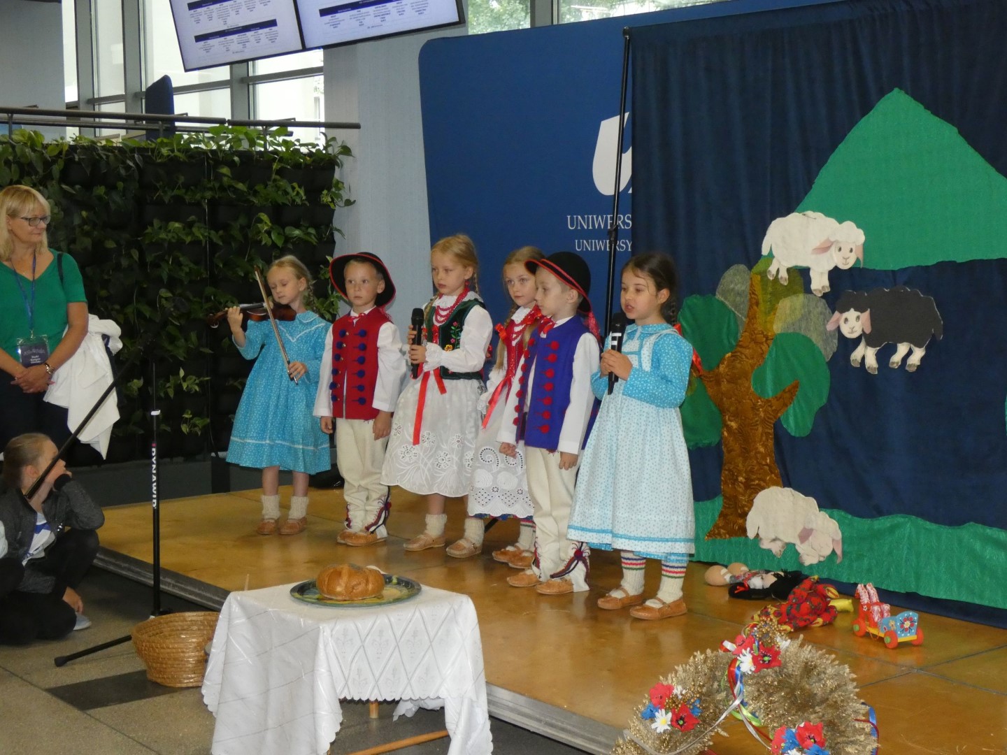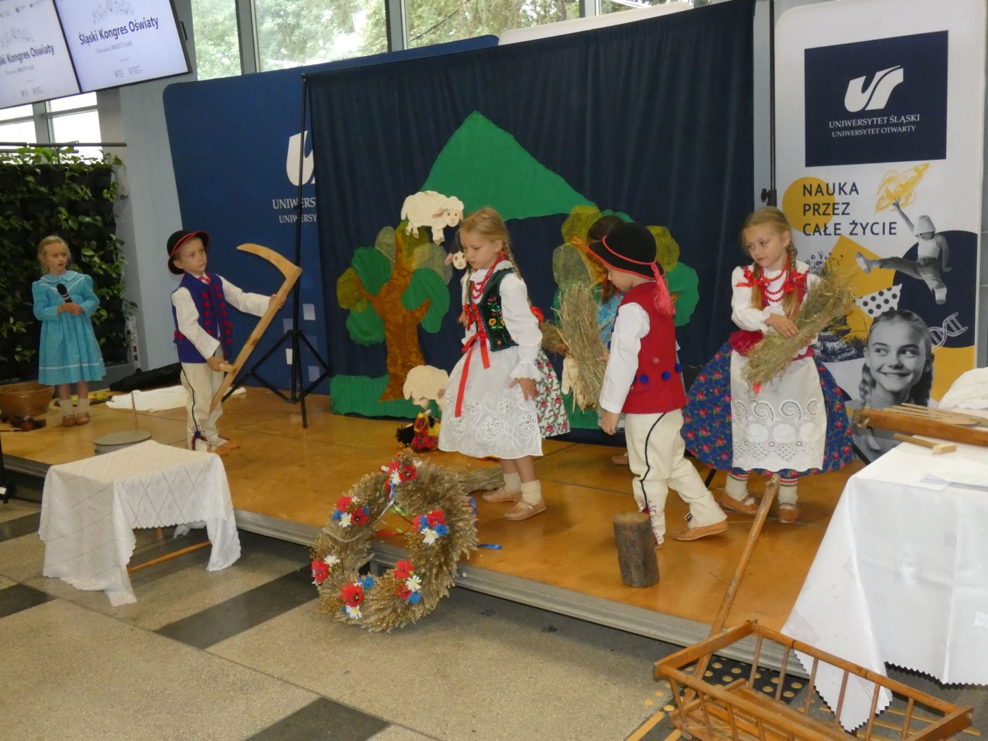 Podczas Kongresu przedszkolaki z naszej placówki przedstawiły dla zgromadzonych gości scenkę dożynkową inspirowaną wierszem Brygidy Murańskiej „Kiela zrobij trzeba, by miej konsek chleba” oraz piosenkę o redyku. Zaprezentowany program artystyczny spotkał się z bardzo ciepłym przyjęciem i uznaniem uczestników wydarzenia. Występ dzieci w tradycyjnych strojach regionalnych, pełen radości, muzyki i symboliki dożynkowej, był nie tylko pięknym akcentem artystycznym, ale również okazją do podkreślenia znaczenia edukacji przedszkolnej w pielęgnowaniu dziedzictwa kulturowego i tożsamości lokalnej.