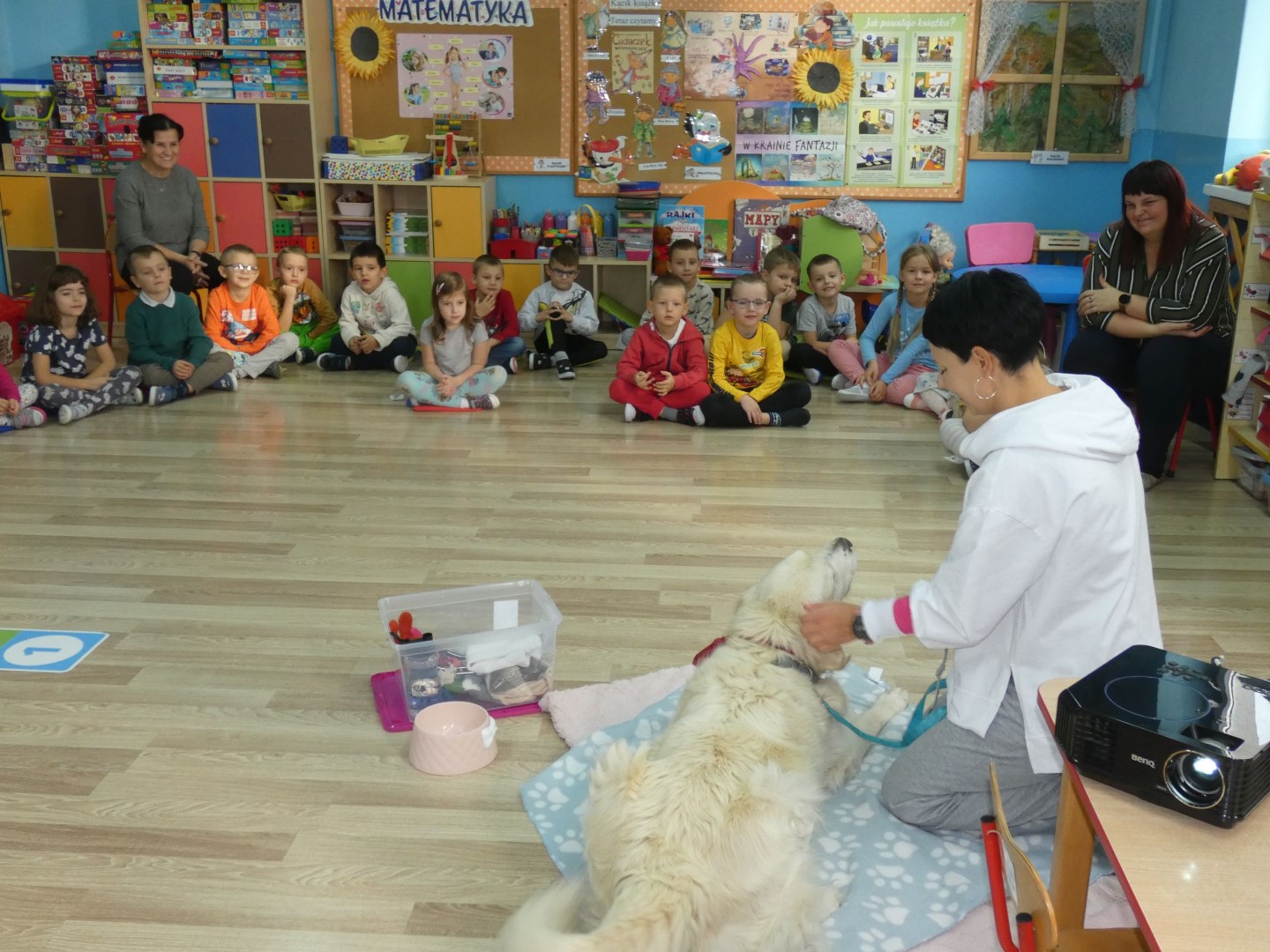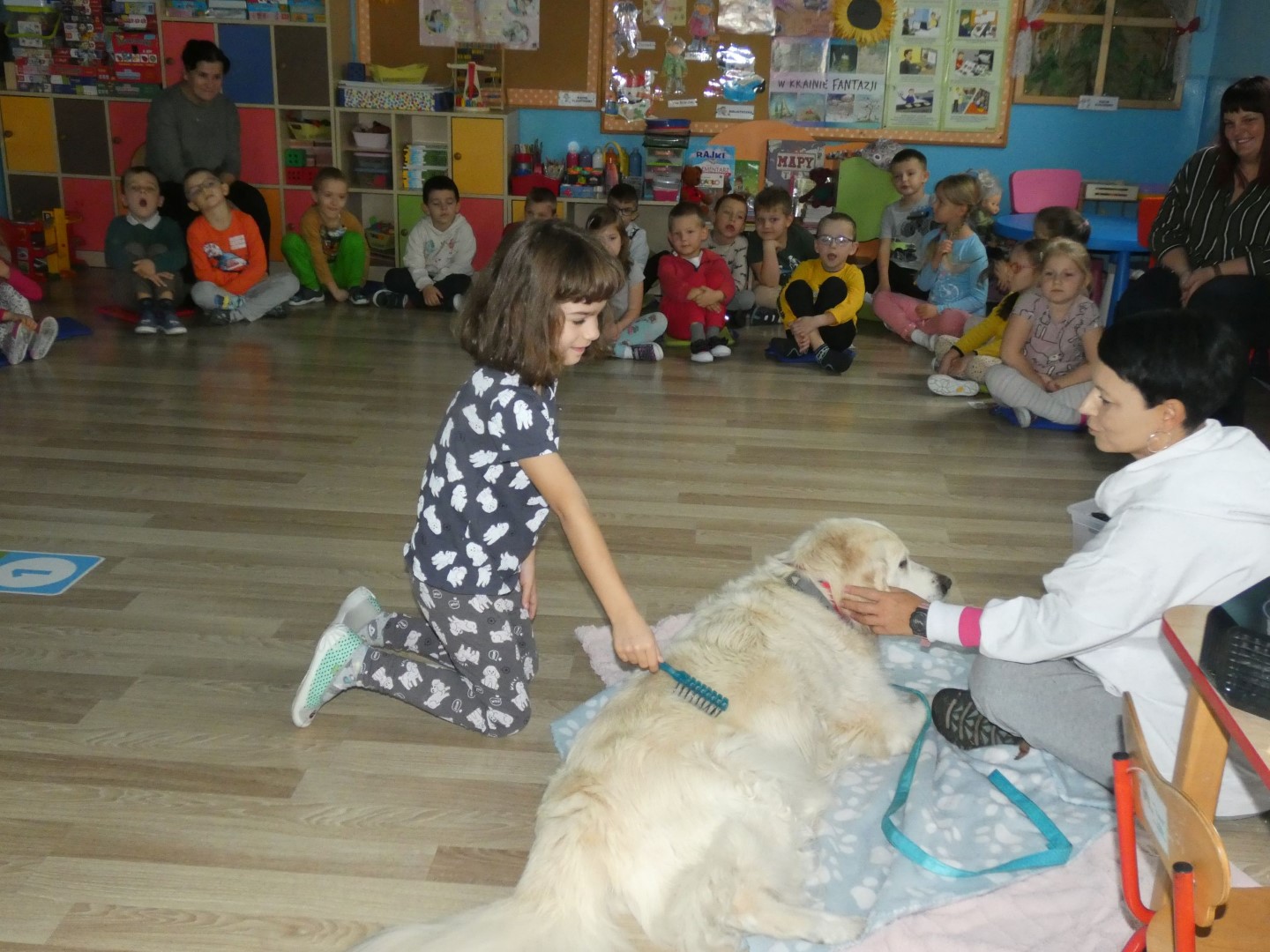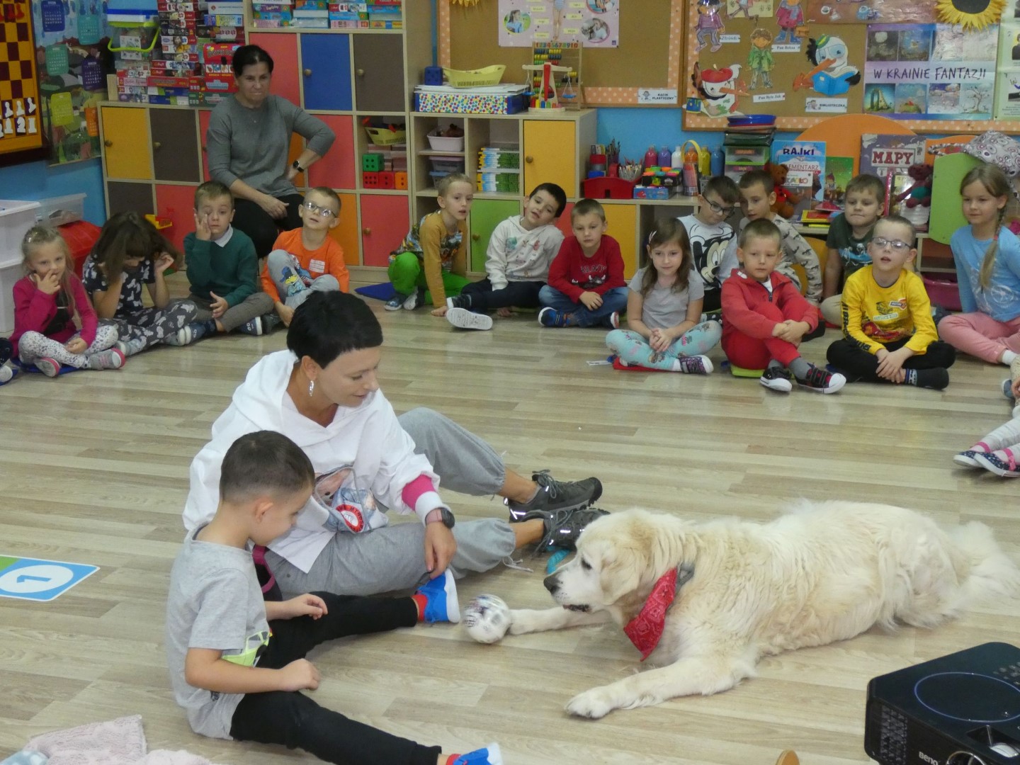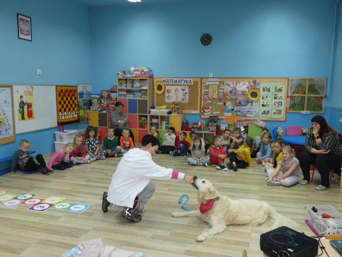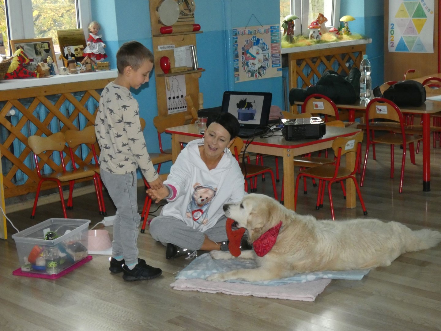 W dniu 19 października 2022r. w Przedszkolu im. Władysława Pieronka w Radziechowach odbyły się zajęcia edukacyjne pt. „Dzieciaki poznają psiaki”. Warsztaty przeprowadzone z dziećmi przez Panią Annę Kwaśny, szkoleniowca i behawiorystę psów, miały na celu przede wszystkim kształtowanie właściwych postaw dzieci w relacjach z psem. Przedszkolaki uczyły się interpretować emocje i zachowania psa. Poznały też wiele przykładów nieprawidłowych reakcji w kontakcie z czworonogami. W spotkaniu uczestniczył przepiękny pies rasy golden retriever o imieniu Wafel. Dzieci w toku interaktywnych zabaw z psem uczyły się prawidłowo interpretować stany emocjonalne psa, z którymi związany jest określony sposób postępowania wobec czworonoga. Pies Wafel wykazał się wielką wyrozumiałością i cierpliwością. Dla wszystkich uczestników spotkania było to niezwykle cenne doświadczenie. Już niebawem kolejne grupy przedszkolne będą miały okazję spotkania z Panią Anią i Wafelkiem, aby wspólnie uczyć się bezpiecznych relacji z czworonogami. Serdecznie dziękujemy Pani Barbarze Lizak, pracownikowi Urzędu Gminy w Radziechowach za inspirację i pomoc w realizacji tych niezwykle wartościowych dla bezpieczeństwa najmłodszych mieszkańców gminy warsztatów.