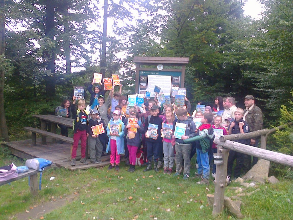 Następnie Organizatorzy wręczyli wszystkim uczestnikom piękne książki i ołówki. Zrobiliśmy pamiątkowe zdjęcie, a potem Panowie z Nadleśnictwa częstowali dzieci łakociami.