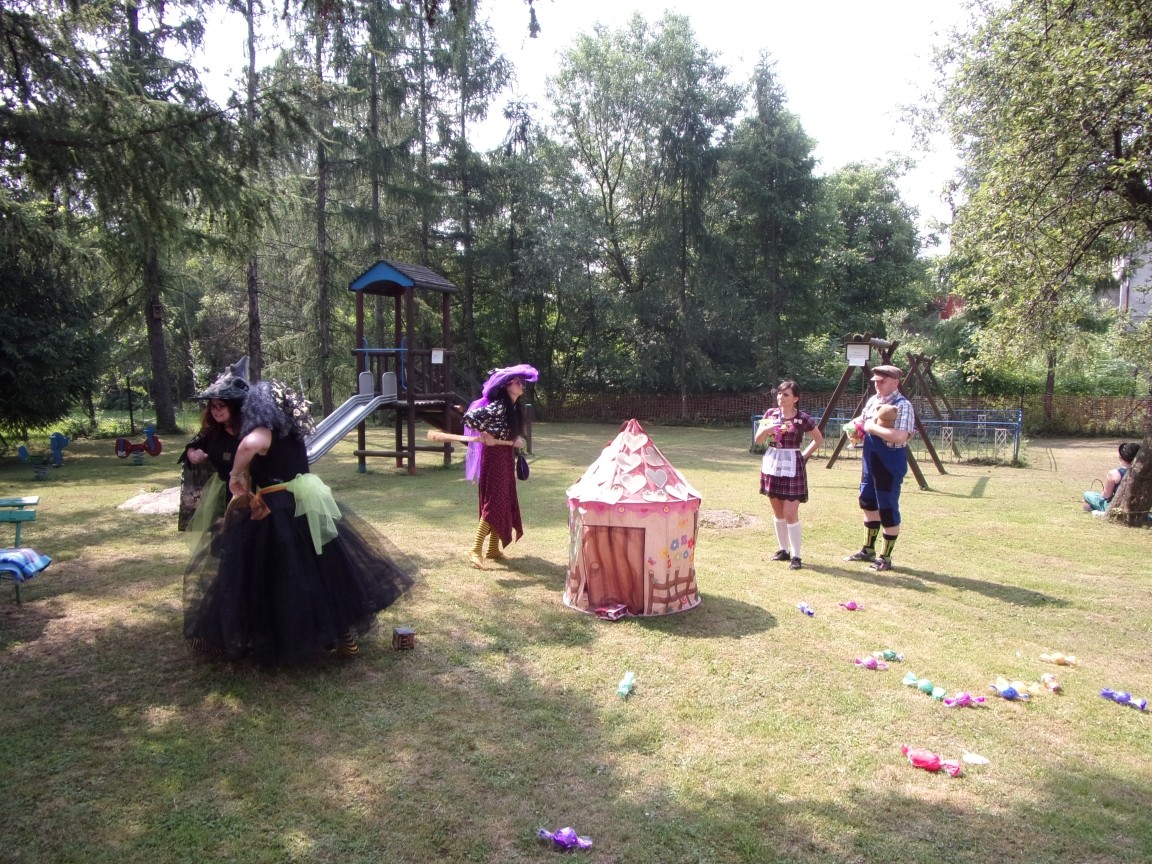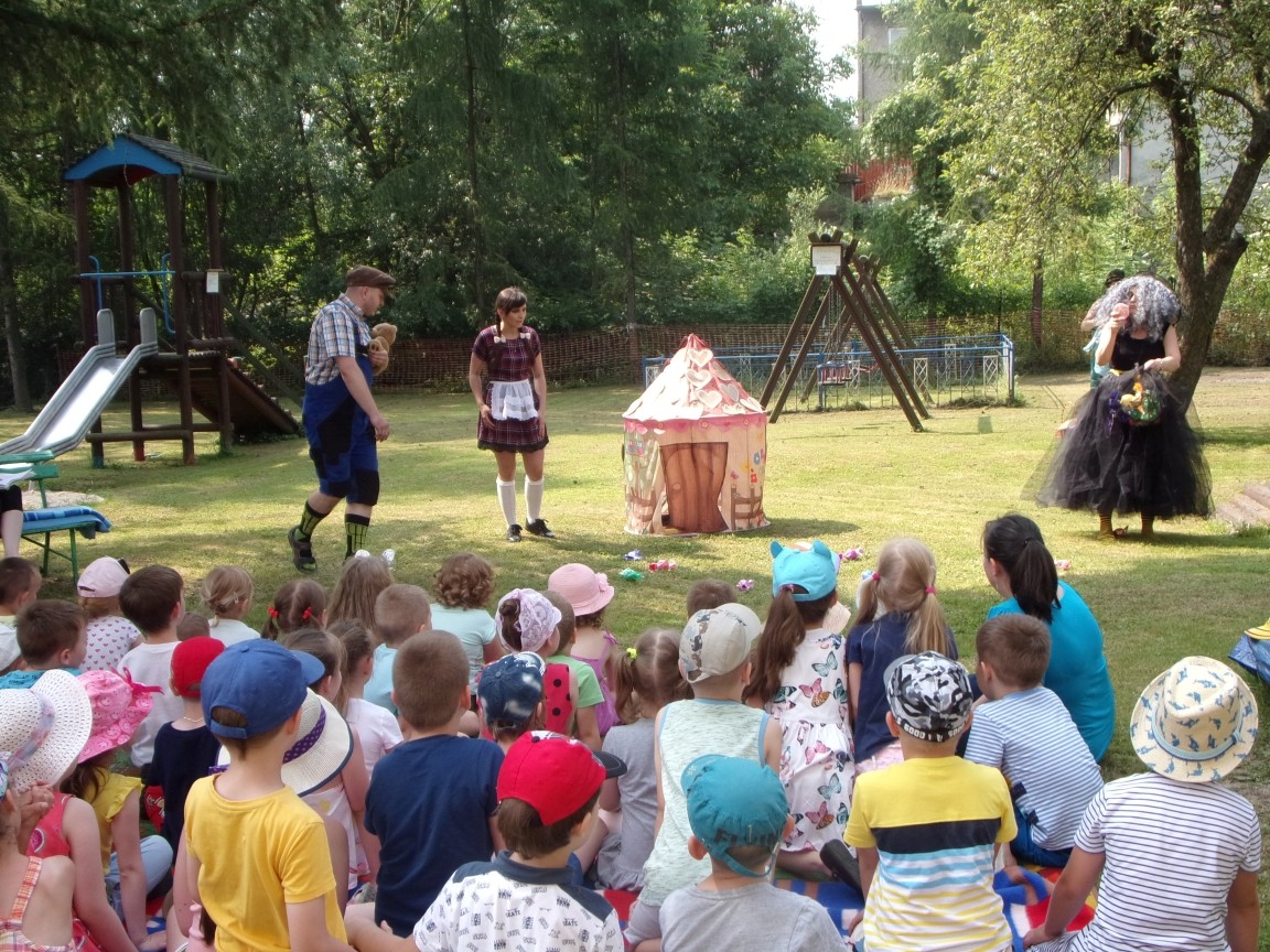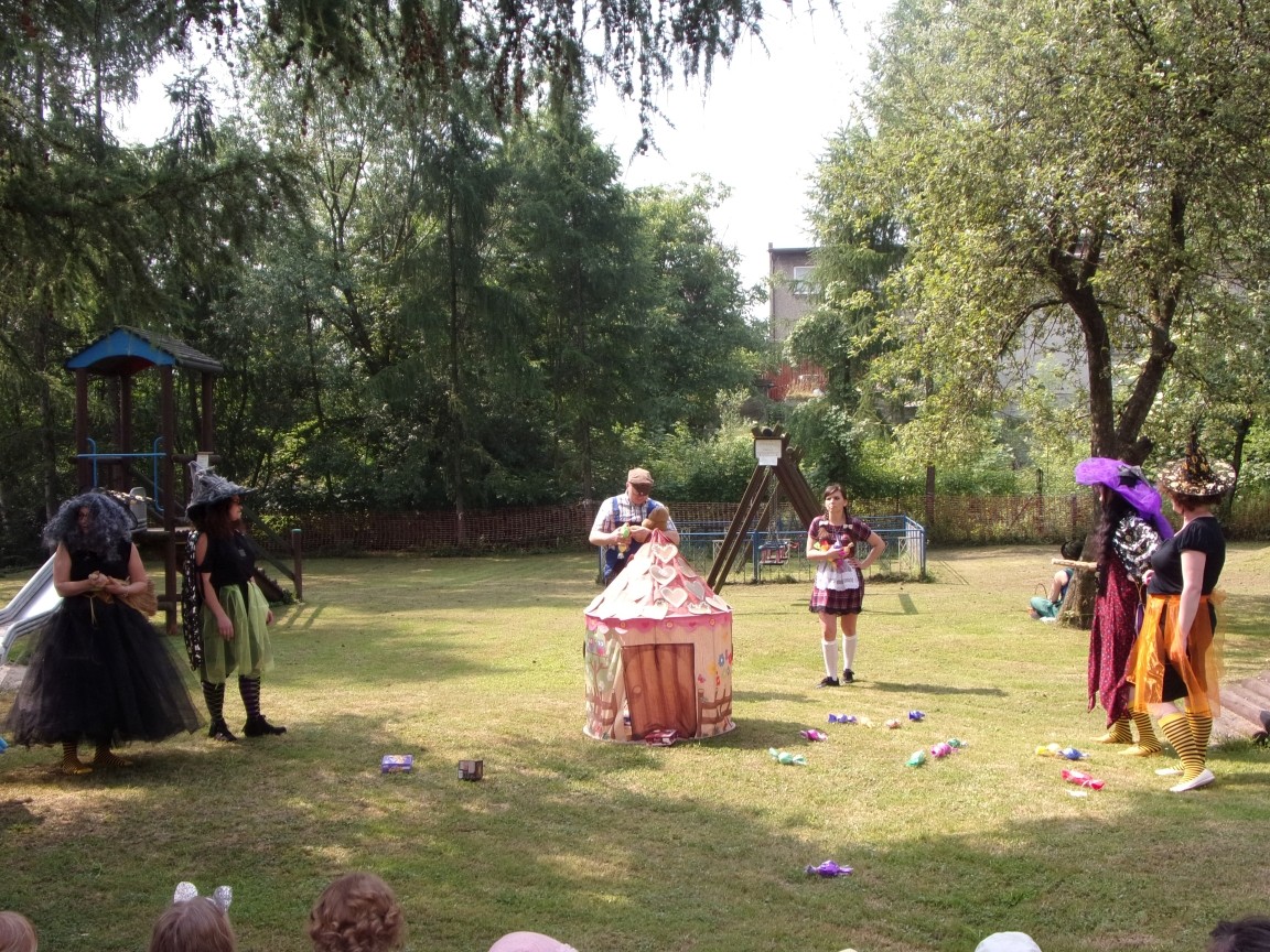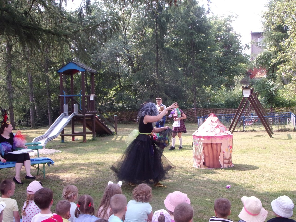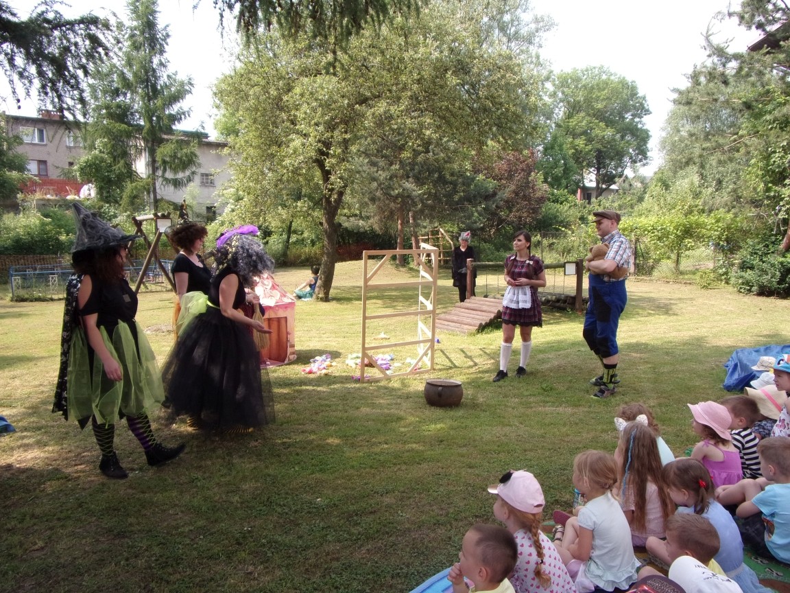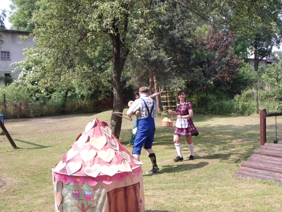 A co działo się później? Tego ani Jan Brzechwa, ani nawet Bracia Grimm nie mogli przewidzieć w swoich wersjach bajki o Jasiu i Małgosi. Nie jedna ale cztery czarownice wirowały w złowrogim tańcu wokół klatki z uwięzionymi głównymi bohaterami bajki. Wilk, który na szczęście okazał się wegetarianinem, drwal, który omal nie unicestwił naszej autentycznej starej jabłoni w ogrodzie przedszkolnym, narrator w barwach rajskiego ptaka i przede wszystkim rewelacyjna kreacja Jasia i Małgosi. Pomyślicie, że to aktualny repertuar Teatru Polskiego w Bielsku- Białej lub przynajmniej Teatru Lalek „Banialuka”? O nie, drodzy Państwo! Takie przedstawienie zostało opracowane i wystawione na placu zabaw przy Przedszkolu im. Władysława Pieronka w Radziechowach. Przedstawienia teatralne dla przedszkolaków przygotowywane wspólnie przez nauczycielki i rodziców wpisały się już w tradycję przedszkola. Pamiętamy rewelacyjne sztuki z lat poprzednich: „Kopciuszek” i „Czerwony Kapturek”. W tym roku przyszedł czas na bajkę pt. „Jaś i Małgosia”. Nie da się opisać radości dzieci i emocji związanych z odnajdywaniem w nietypowej roli swoich pań wychowawczyń i rodziców. Nadal pozostaję pod ogromnym wrażeniem tego wydarzenia i myślę, że podzielicie Państwo moje zdanie po obejrzeniu fotorelacji.