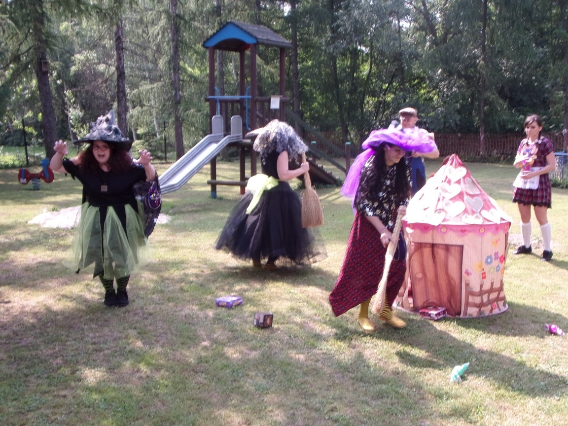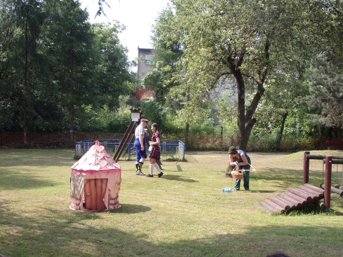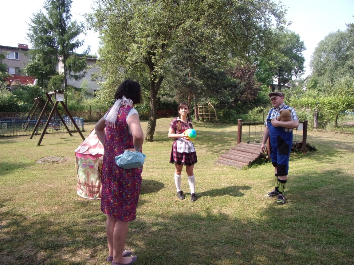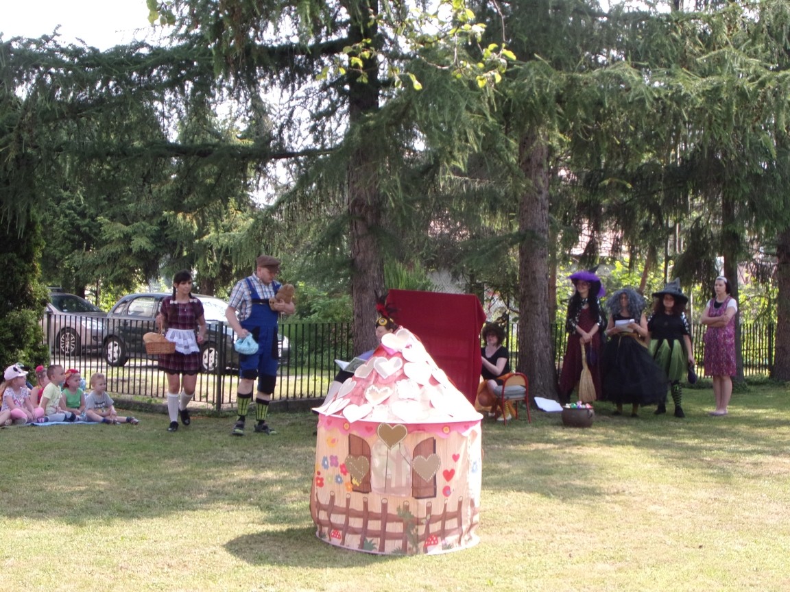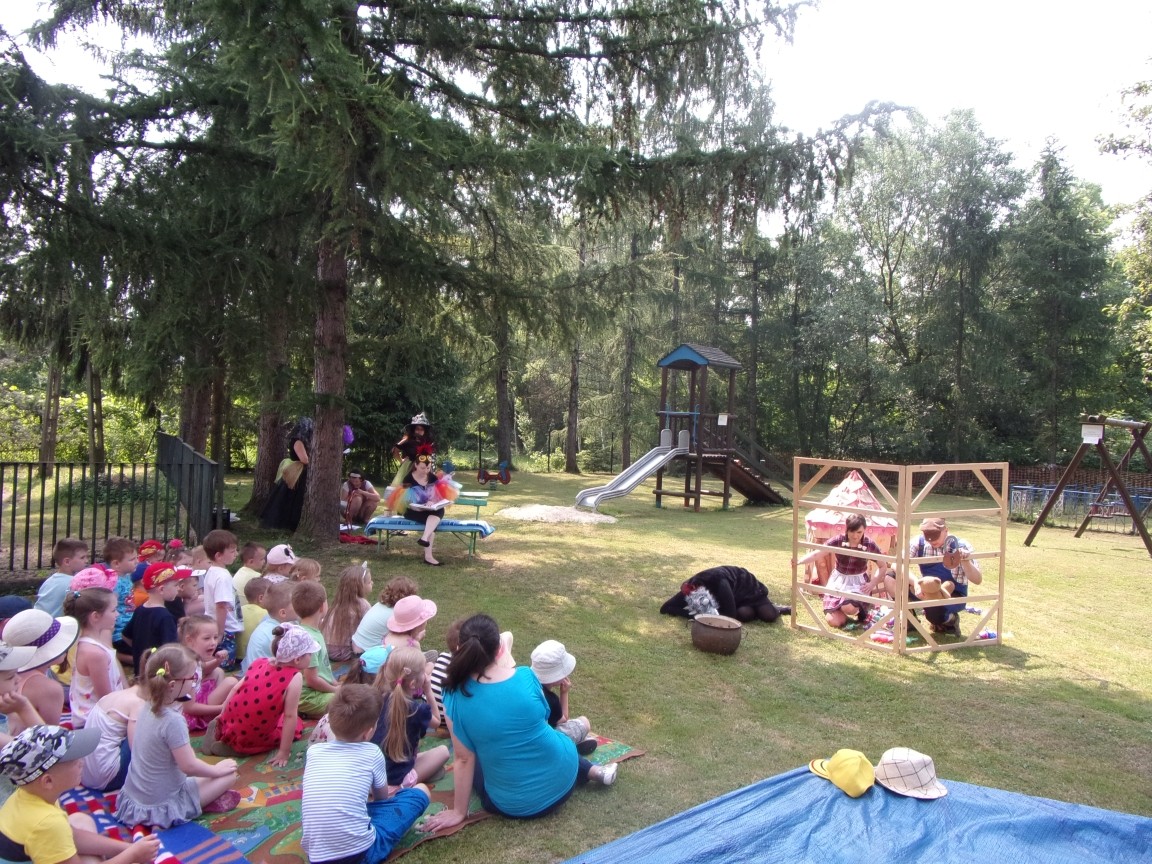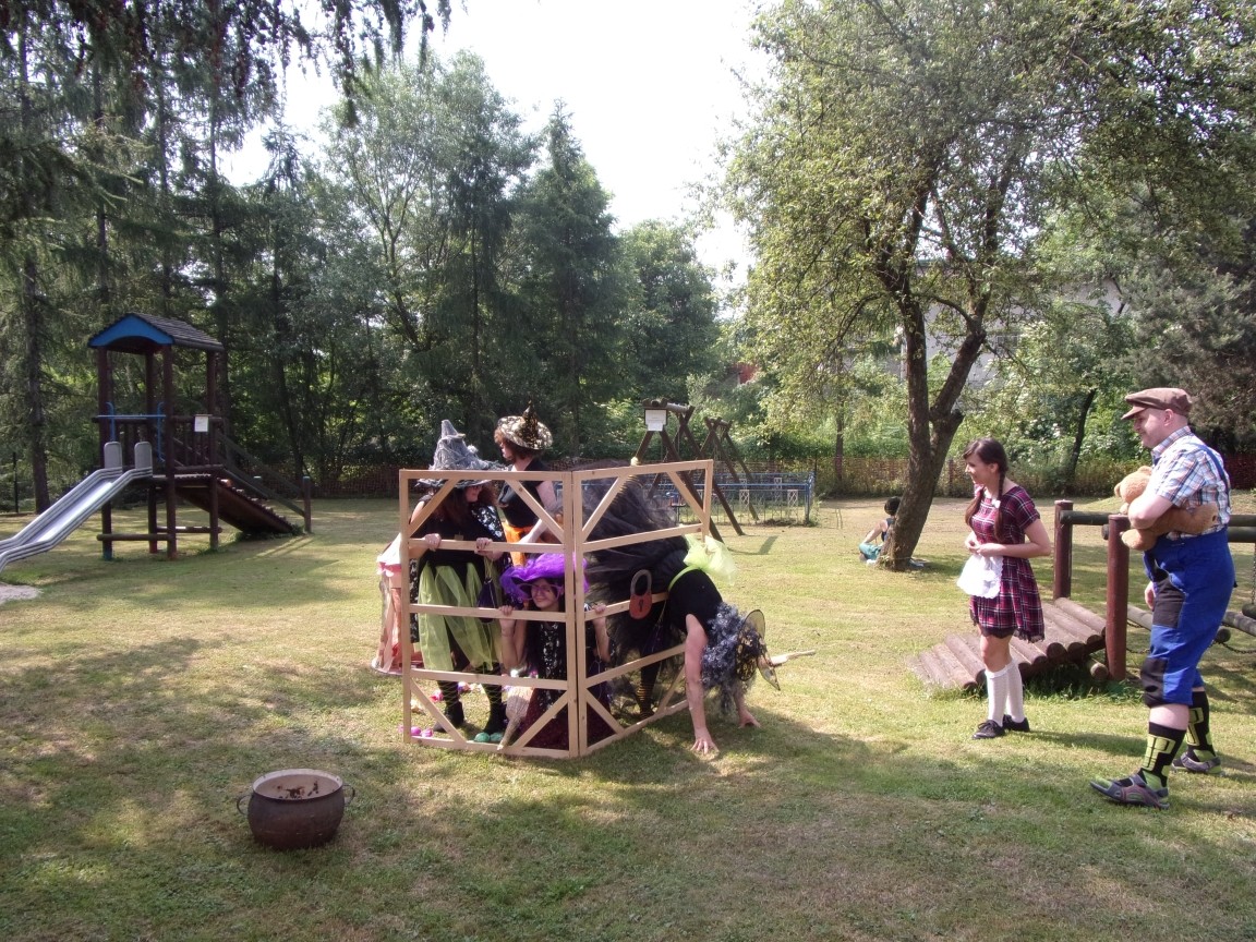 A co działo się później? Tego ani Jan Brzechwa, ani nawet Bracia Grimm nie mogli przewidzieć w swoich wersjach bajki o Jasiu i Małgosi. Nie jedna ale cztery czarownice wirowały w złowrogim tańcu wokół klatki z uwięzionymi głównymi bohaterami bajki. Wilk, który na szczęście okazał się wegetarianinem, drwal, który omal nie unicestwił naszej autentycznej starej jabłoni w ogrodzie przedszkolnym, narrator w barwach rajskiego ptaka i przede wszystkim rewelacyjna kreacja Jasia i Małgosi. Pomyślicie, że to aktualny repertuar Teatru Polskiego w Bielsku- Białej lub przynajmniej Teatru Lalek „Banialuka”? O nie, drodzy Państwo! Takie przedstawienie zostało opracowane i wystawione na placu zabaw przy Przedszkolu im. Władysława Pieronka w Radziechowach. Przedstawienia teatralne dla przedszkolaków przygotowywane wspólnie przez nauczycielki i rodziców wpisały się już w tradycję przedszkola. Pamiętamy rewelacyjne sztuki z lat poprzednich: „Kopciuszek” i „Czerwony Kapturek”. W tym roku przyszedł czas na bajkę pt. „Jaś i Małgosia”. Nie da się opisać radości dzieci i emocji związanych z odnajdywaniem w nietypowej roli swoich pań wychowawczyń i rodziców. Nadal pozostaję pod ogromnym wrażeniem tego wydarzenia i myślę, że podzielicie Państwo moje zdanie po obejrzeniu fotorelacji.