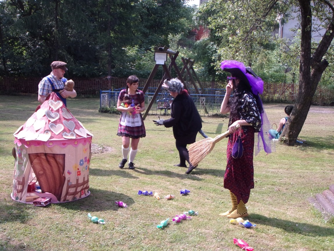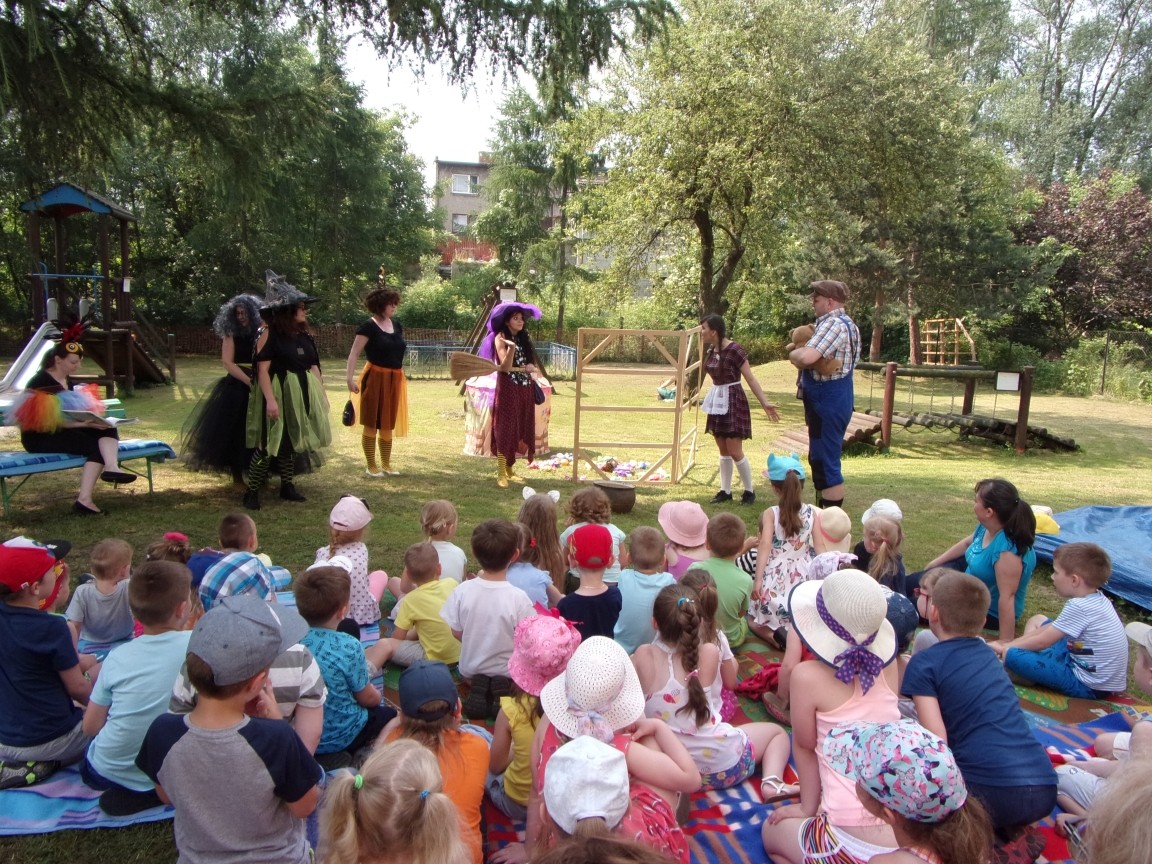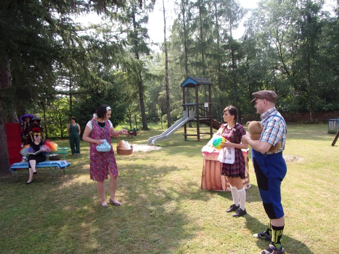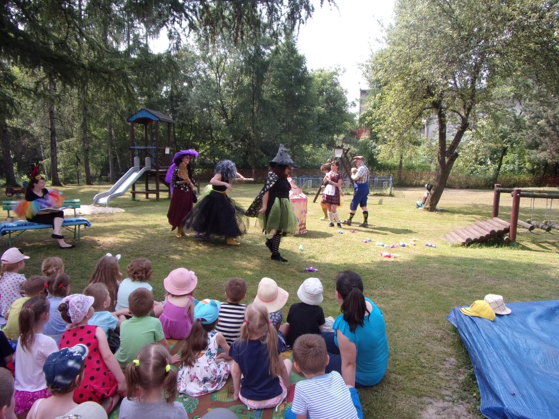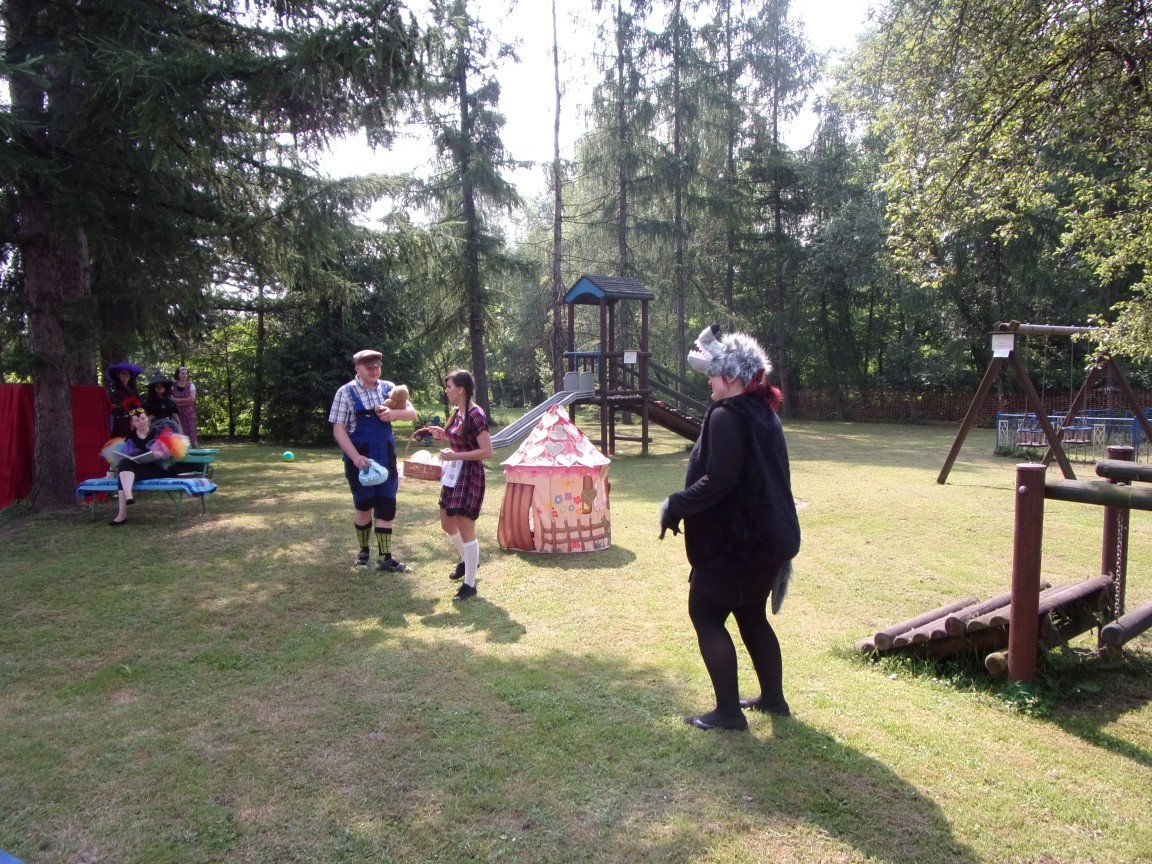 A co działo się później? Tego ani Jan Brzechwa, ani nawet Bracia Grimm nie mogli przewidzieć w swoich wersjach bajki o Jasiu i Małgosi. Nie jedna ale cztery czarownice wirowały w złowrogim tańcu wokół klatki z uwięzionymi głównymi bohaterami bajki. Wilk, który na szczęście okazał się wegetarianinem, drwal, który omal nie unicestwił naszej autentycznej starej jabłoni w ogrodzie przedszkolnym, narrator w barwach rajskiego ptaka i przede wszystkim rewelacyjna kreacja Jasia i Małgosi. Pomyślicie, że to aktualny repertuar Teatru Polskiego w Bielsku- Białej lub przynajmniej Teatru Lalek „Banialuka”? O nie, drodzy Państwo! Takie przedstawienie zostało opracowane i wystawione na placu zabaw przy Przedszkolu im. Władysława Pieronka w Radziechowach. Przedstawienia teatralne dla przedszkolaków przygotowywane wspólnie przez nauczycielki i rodziców wpisały się już w tradycję przedszkola. Pamiętamy rewelacyjne sztuki z lat poprzednich: „Kopciuszek” i „Czerwony Kapturek”. W tym roku przyszedł czas na bajkę pt. „Jaś i Małgosia”. Nie da się opisać radości dzieci i emocji związanych z odnajdywaniem w nietypowej roli swoich pań wychowawczyń i rodziców. Nadal pozostaję pod ogromnym wrażeniem tego wydarzenia i myślę, że podzielicie Państwo moje zdanie po obejrzeniu fotorelacji.