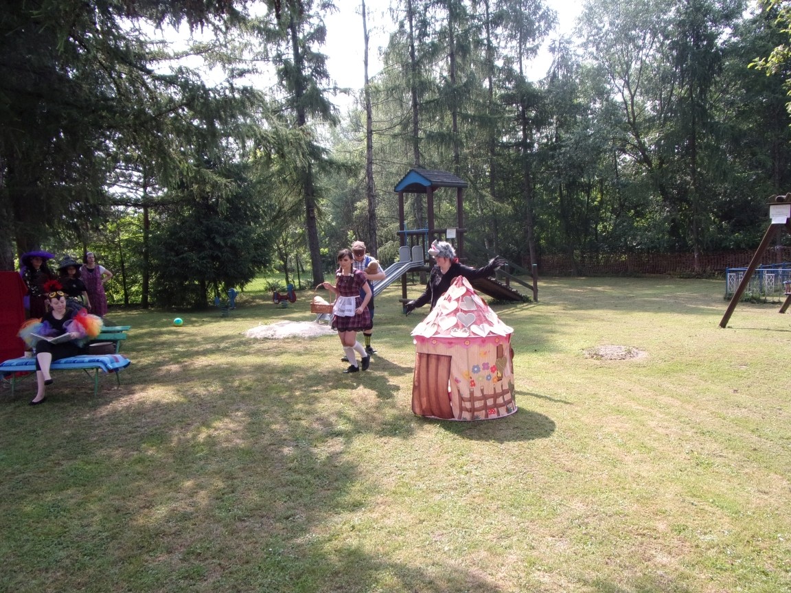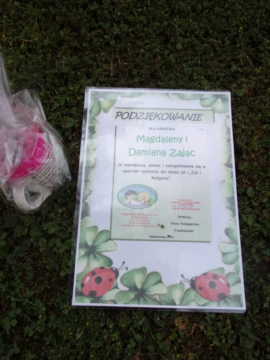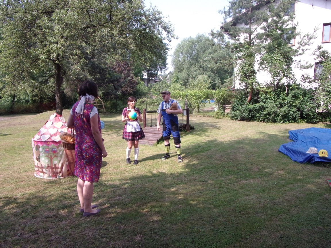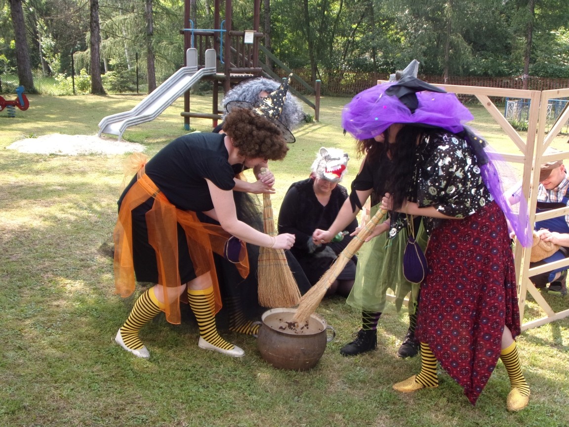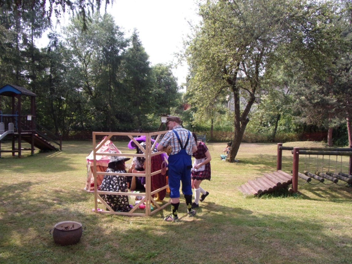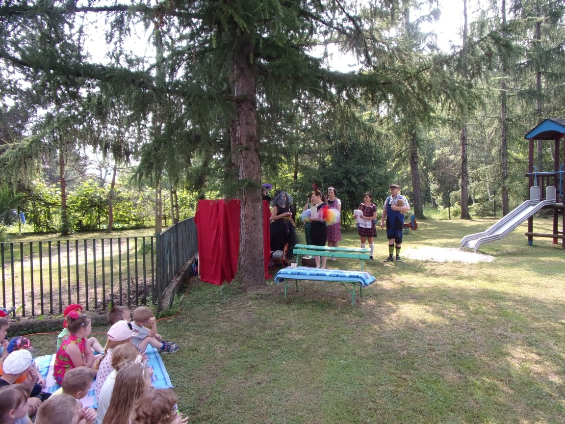 A co działo się później? Tego ani Jan Brzechwa, ani nawet Bracia Grimm nie mogli przewidzieć w swoich wersjach bajki o Jasiu i Małgosi. Nie jedna ale cztery czarownice wirowały w złowrogim tańcu wokół klatki z uwięzionymi głównymi bohaterami bajki. Wilk, który na szczęście okazał się wegetarianinem, drwal, który omal nie unicestwił naszej autentycznej starej jabłoni w ogrodzie przedszkolnym, narrator w barwach rajskiego ptaka i przede wszystkim rewelacyjna kreacja Jasia i Małgosi. Pomyślicie, że to aktualny repertuar Teatru Polskiego w Bielsku- Białej lub przynajmniej Teatru Lalek „Banialuka”? O nie, drodzy Państwo! Takie przedstawienie zostało opracowane i wystawione na placu zabaw przy Przedszkolu im. Władysława Pieronka w Radziechowach. Przedstawienia teatralne dla przedszkolaków przygotowywane wspólnie przez nauczycielki i rodziców wpisały się już w tradycję przedszkola. Pamiętamy rewelacyjne sztuki z lat poprzednich: „Kopciuszek” i „Czerwony Kapturek”. W tym roku przyszedł czas na bajkę pt. „Jaś i Małgosia”. Nie da się opisać radości dzieci i emocji związanych z odnajdywaniem w nietypowej roli swoich pań wychowawczyń i rodziców. Nadal pozostaję pod ogromnym wrażeniem tego wydarzenia i myślę, że podzielicie Państwo moje zdanie po obejrzeniu fotorelacji.
