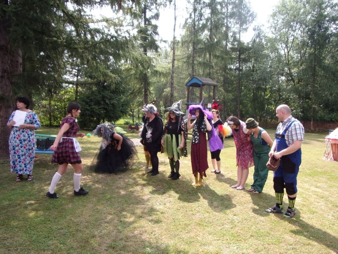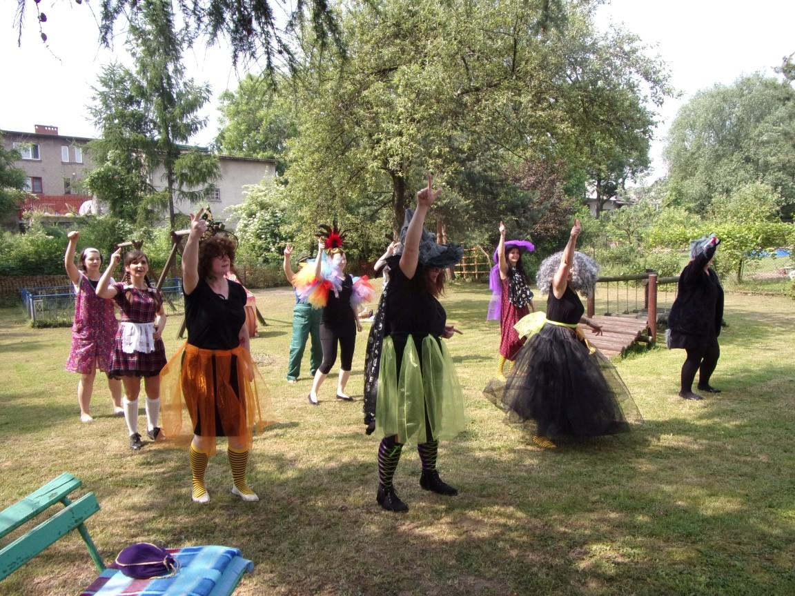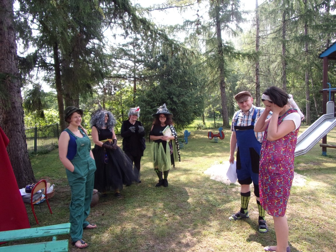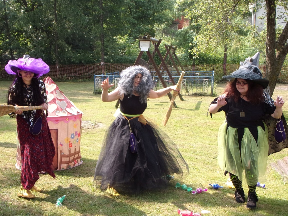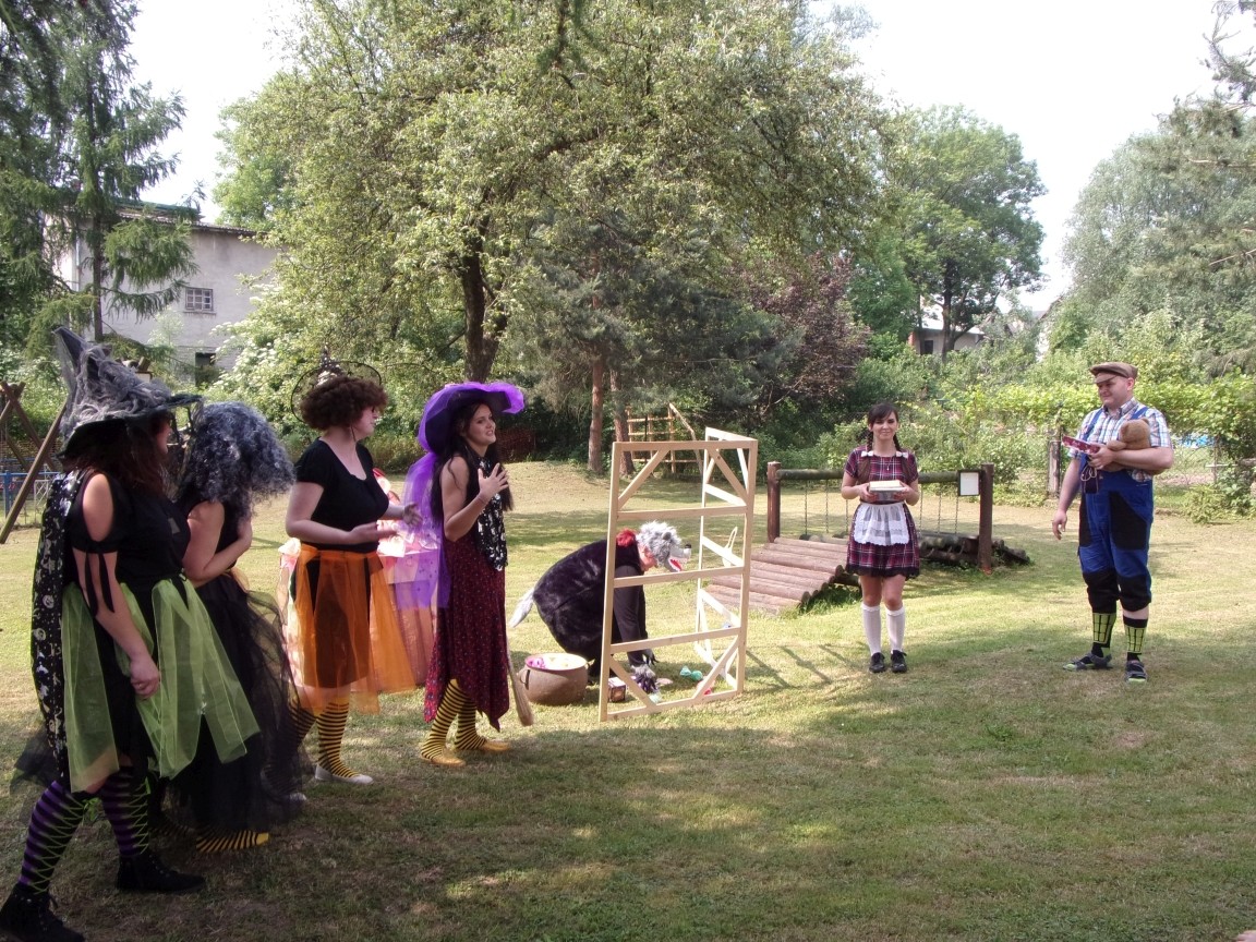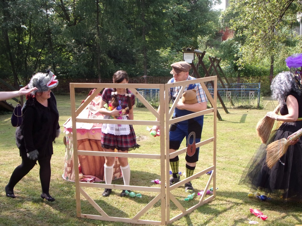 A co działo się później? Tego ani Jan Brzechwa, ani nawet Bracia Grimm nie mogli przewidzieć w swoich wersjach bajki o Jasiu i Małgosi. Nie jedna ale cztery czarownice wirowały w złowrogim tańcu wokół klatki z uwięzionymi głównymi bohaterami bajki. Wilk, który na szczęście okazał się wegetarianinem, drwal, który omal nie unicestwił naszej autentycznej starej jabłoni w ogrodzie przedszkolnym, narrator w barwach rajskiego ptaka i przede wszystkim rewelacyjna kreacja Jasia i Małgosi. Pomyślicie, że to aktualny repertuar Teatru Polskiego w Bielsku- Białej lub przynajmniej Teatru Lalek „Banialuka”? O nie, drodzy Państwo! Takie przedstawienie zostało opracowane i wystawione na placu zabaw przy Przedszkolu im. Władysława Pieronka w Radziechowach. Przedstawienia teatralne dla przedszkolaków przygotowywane wspólnie przez nauczycielki i rodziców wpisały się już w tradycję przedszkola. Pamiętamy rewelacyjne sztuki z lat poprzednich: „Kopciuszek” i „Czerwony Kapturek”. W tym roku przyszedł czas na bajkę pt. „Jaś i Małgosia”. Nie da się opisać radości dzieci i emocji związanych z odnajdywaniem w nietypowej roli swoich pań wychowawczyń i rodziców. Nadal pozostaję pod ogromnym wrażeniem tego wydarzenia i myślę, że podzielicie Państwo moje zdanie po obejrzeniu fotorelacji.