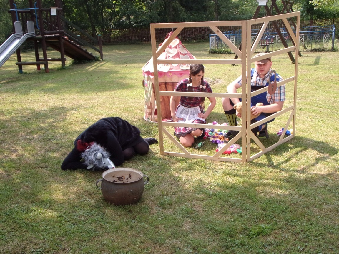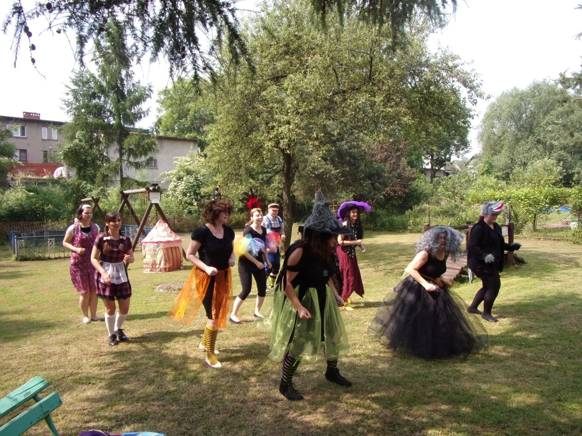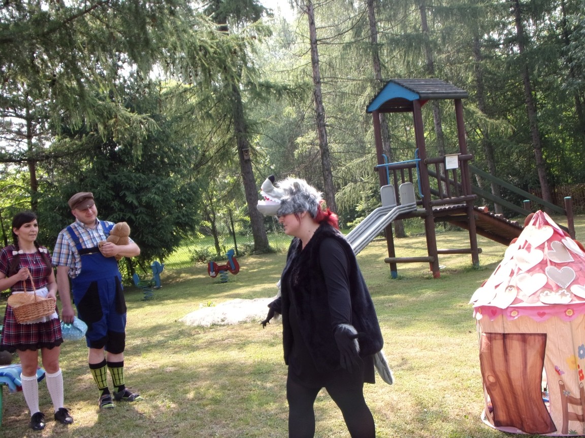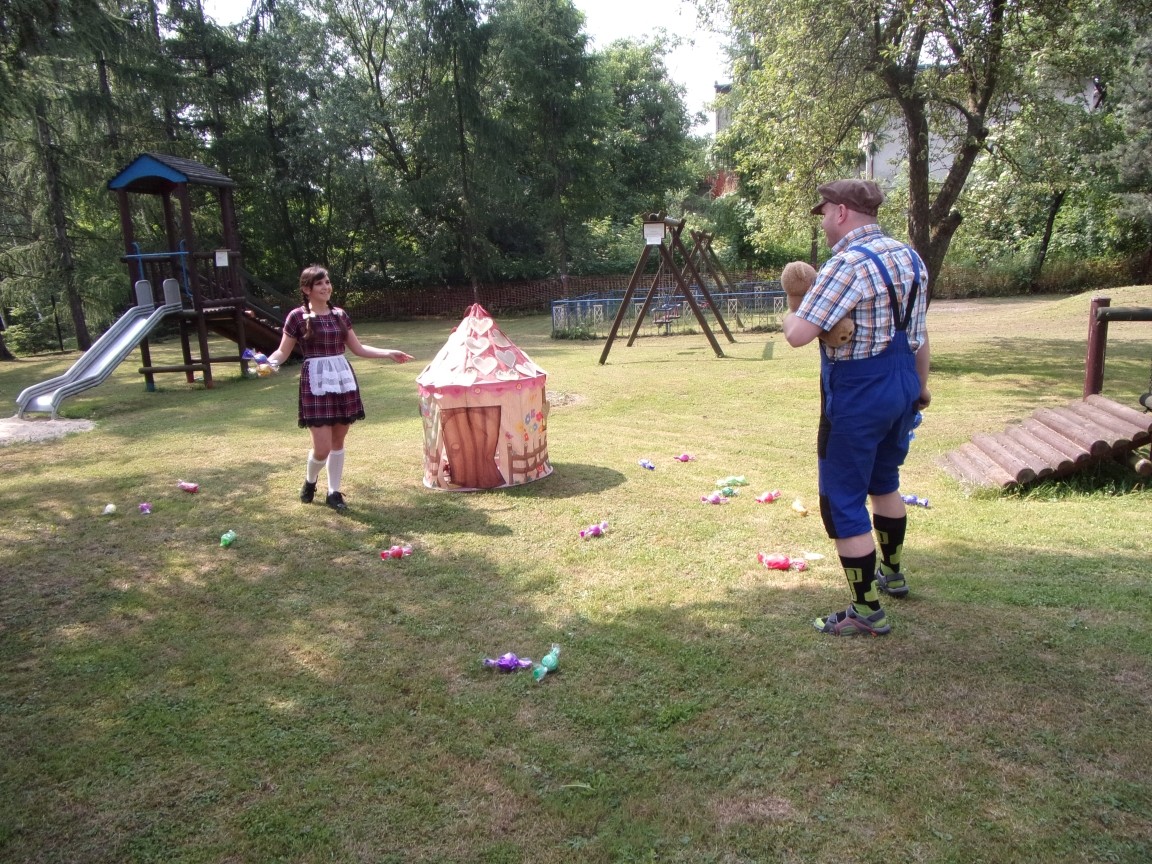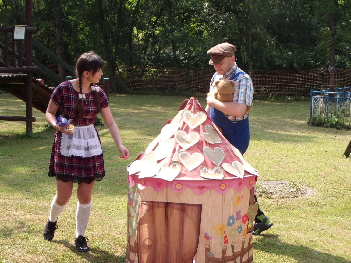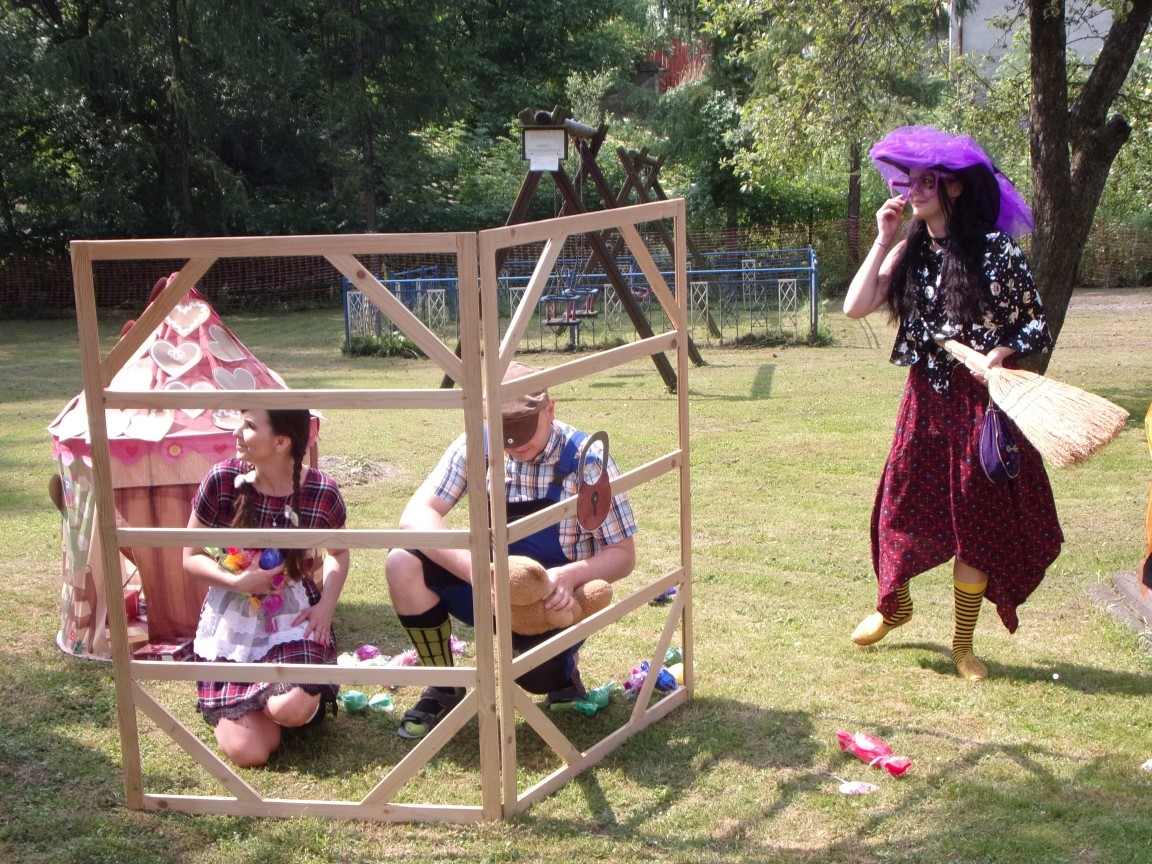 A co działo się później? Tego ani Jan Brzechwa, ani nawet Bracia Grimm nie mogli przewidzieć w swoich wersjach bajki o Jasiu i Małgosi. Nie jedna ale cztery czarownice wirowały w złowrogim tańcu wokół klatki z uwięzionymi głównymi bohaterami bajki. Wilk, który na szczęście okazał się wegetarianinem, drwal, który omal nie unicestwił naszej autentycznej starej jabłoni w ogrodzie przedszkolnym, narrator w barwach rajskiego ptaka i przede wszystkim rewelacyjna kreacja Jasia i Małgosi. Pomyślicie, że to aktualny repertuar Teatru Polskiego w Bielsku- Białej lub przynajmniej Teatru Lalek „Banialuka”? O nie, drodzy Państwo! Takie przedstawienie zostało opracowane i wystawione na placu zabaw przy Przedszkolu im. Władysława Pieronka w Radziechowach. Przedstawienia teatralne dla przedszkolaków przygotowywane wspólnie przez nauczycielki i rodziców wpisały się już w tradycję przedszkola. Pamiętamy rewelacyjne sztuki z lat poprzednich: „Kopciuszek” i „Czerwony Kapturek”. W tym roku przyszedł czas na bajkę pt. „Jaś i Małgosia”. Nie da się opisać radości dzieci i emocji związanych z odnajdywaniem w nietypowej roli swoich pań wychowawczyń i rodziców. Nadal pozostaję pod ogromnym wrażeniem tego wydarzenia i myślę, że podzielicie Państwo moje zdanie po obejrzeniu fotorelacji.