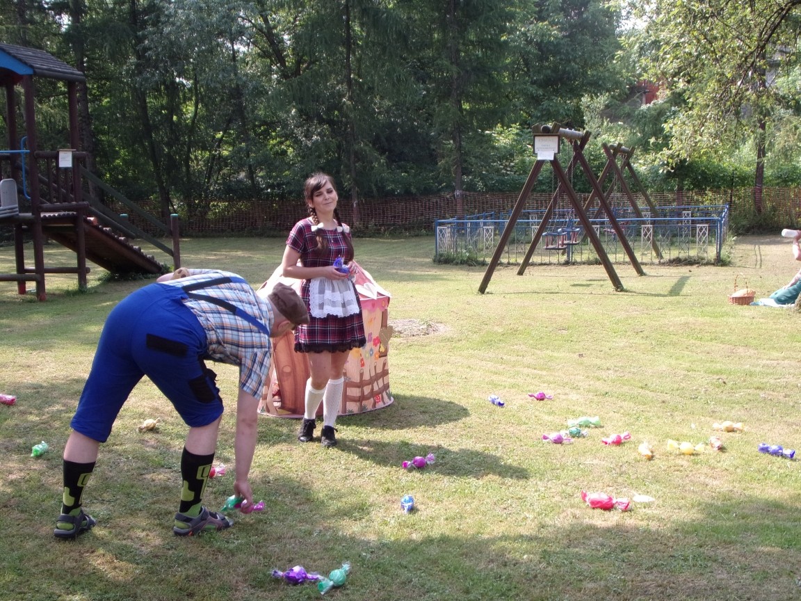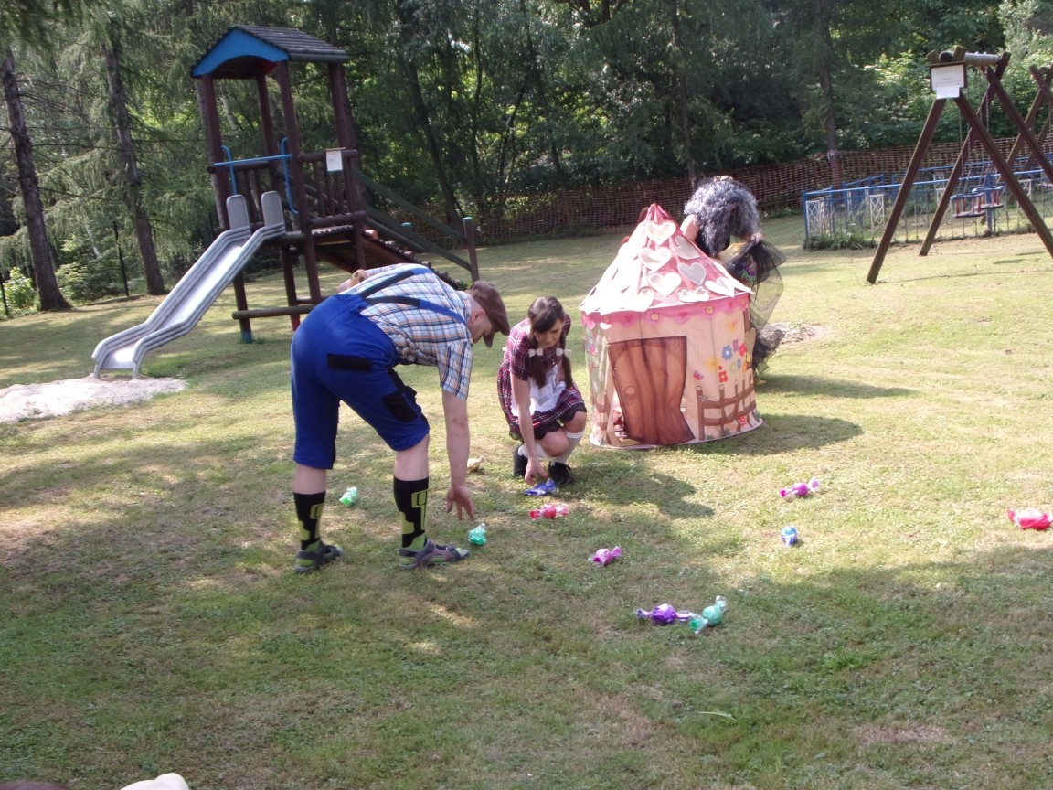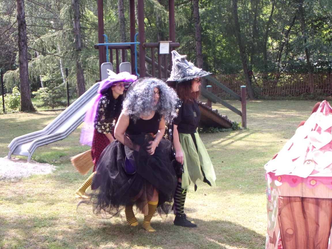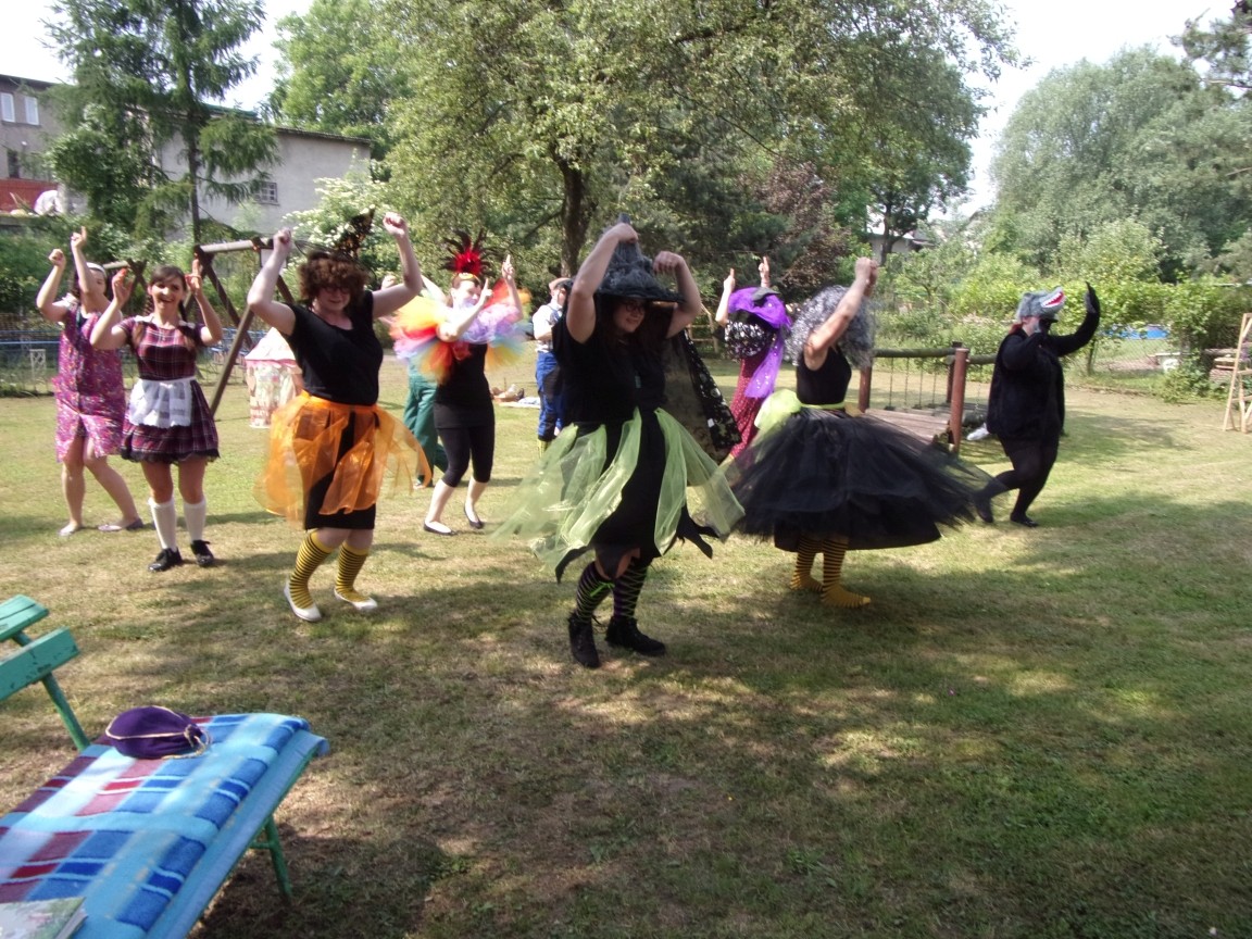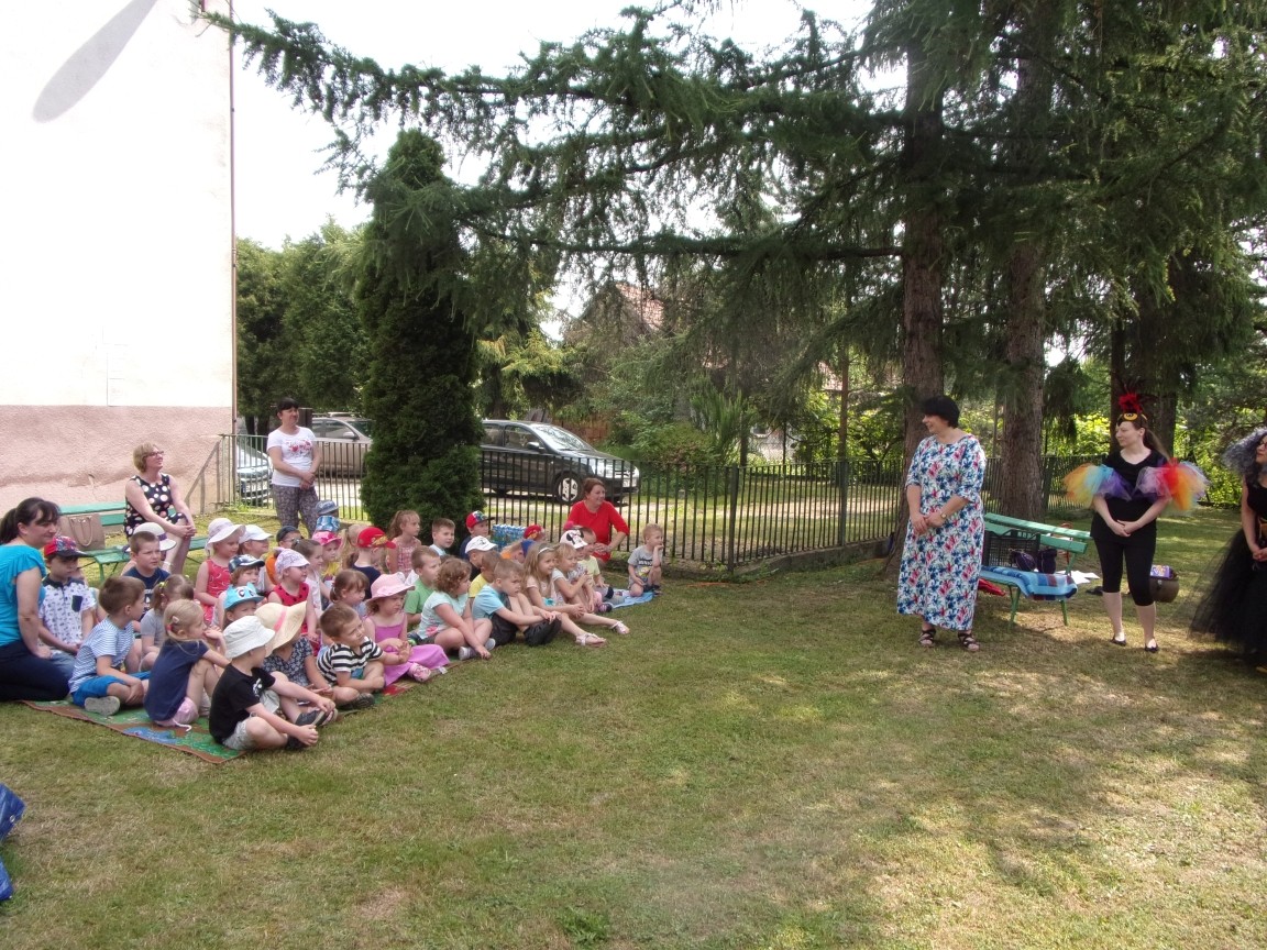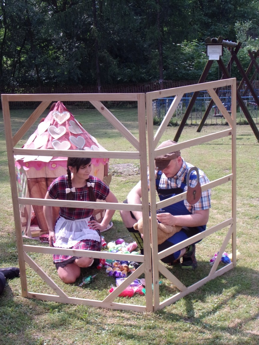 A co działo się później? Tego ani Jan Brzechwa, ani nawet Bracia Grimm nie mogli przewidzieć w swoich wersjach bajki o Jasiu i Małgosi. Nie jedna ale cztery czarownice wirowały w złowrogim tańcu wokół klatki z uwięzionymi głównymi bohaterami bajki. Wilk, który na szczęście okazał się wegetarianinem, drwal, który omal nie unicestwił naszej autentycznej starej jabłoni w ogrodzie przedszkolnym, narrator w barwach rajskiego ptaka i przede wszystkim rewelacyjna kreacja Jasia i Małgosi. Pomyślicie, że to aktualny repertuar Teatru Polskiego w Bielsku- Białej lub przynajmniej Teatru Lalek „Banialuka”? O nie, drodzy Państwo! Takie przedstawienie zostało opracowane i wystawione na placu zabaw przy Przedszkolu im. Władysława Pieronka w Radziechowach. Przedstawienia teatralne dla przedszkolaków przygotowywane wspólnie przez nauczycielki i rodziców wpisały się już w tradycję przedszkola. Pamiętamy rewelacyjne sztuki z lat poprzednich: „Kopciuszek” i „Czerwony Kapturek”. W tym roku przyszedł czas na bajkę pt. „Jaś i Małgosia”. Nie da się opisać radości dzieci i emocji związanych z odnajdywaniem w nietypowej roli swoich pań wychowawczyń i rodziców. Nadal pozostaję pod ogromnym wrażeniem tego wydarzenia i myślę, że podzielicie Państwo moje zdanie po obejrzeniu fotorelacji.