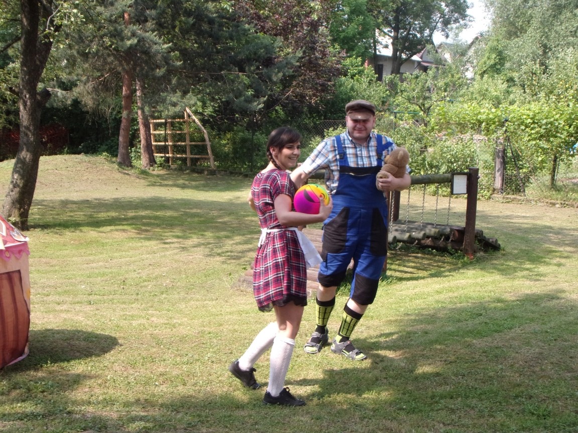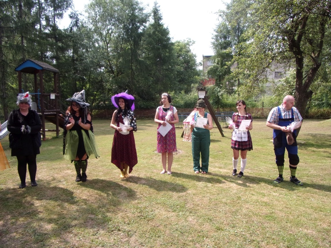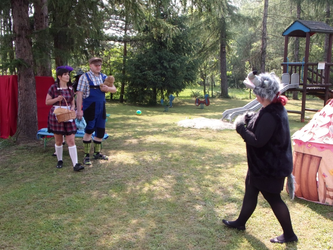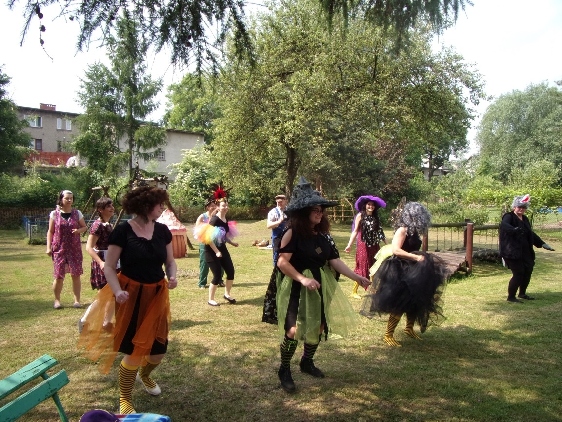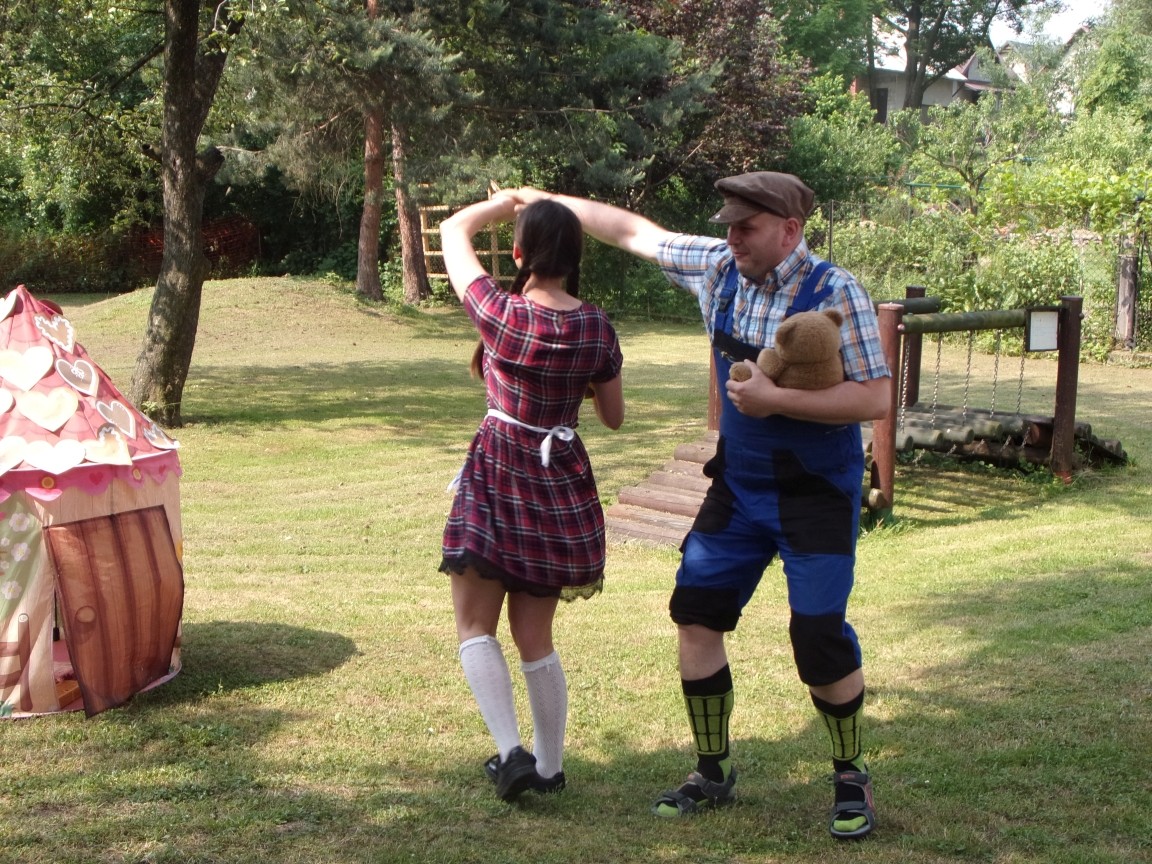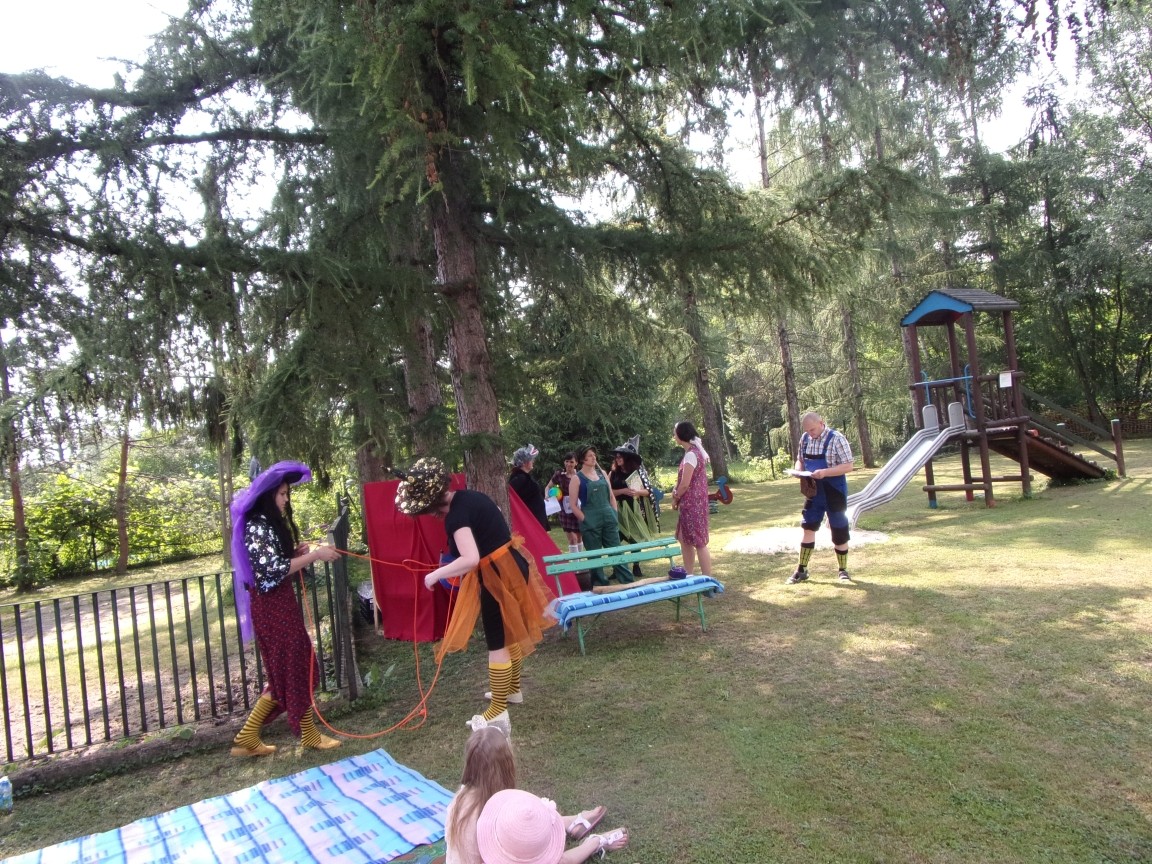 A co działo się później? Tego ani Jan Brzechwa, ani nawet Bracia Grimm nie mogli przewidzieć w swoich wersjach bajki o Jasiu i Małgosi. Nie jedna ale cztery czarownice wirowały w złowrogim tańcu wokół klatki z uwięzionymi głównymi bohaterami bajki. Wilk, który na szczęście okazał się wegetarianinem, drwal, który omal nie unicestwił naszej autentycznej starej jabłoni w ogrodzie przedszkolnym, narrator w barwach rajskiego ptaka i przede wszystkim rewelacyjna kreacja Jasia i Małgosi. Pomyślicie, że to aktualny repertuar Teatru Polskiego w Bielsku- Białej lub przynajmniej Teatru Lalek „Banialuka”? O nie, drodzy Państwo! Takie przedstawienie zostało opracowane i wystawione na placu zabaw przy Przedszkolu im. Władysława Pieronka w Radziechowach. Przedstawienia teatralne dla przedszkolaków przygotowywane wspólnie przez nauczycielki i rodziców wpisały się już w tradycję przedszkola. Pamiętamy rewelacyjne sztuki z lat poprzednich: „Kopciuszek” i „Czerwony Kapturek”. W tym roku przyszedł czas na bajkę pt. „Jaś i Małgosia”. Nie da się opisać radości dzieci i emocji związanych z odnajdywaniem w nietypowej roli swoich pań wychowawczyń i rodziców. Nadal pozostaję pod ogromnym wrażeniem tego wydarzenia i myślę, że podzielicie Państwo moje zdanie po obejrzeniu fotorelacji.