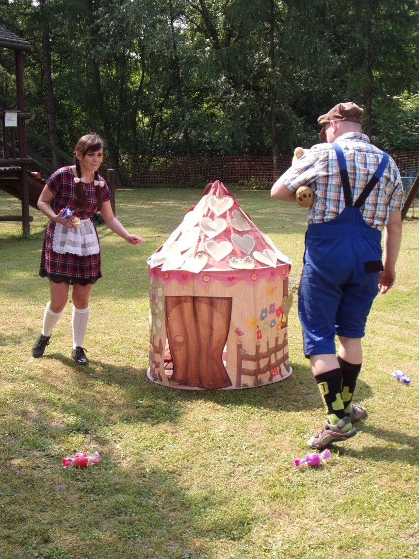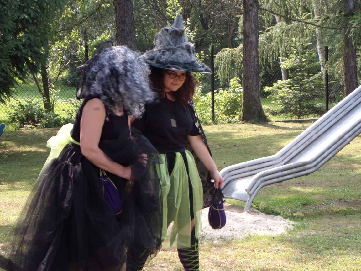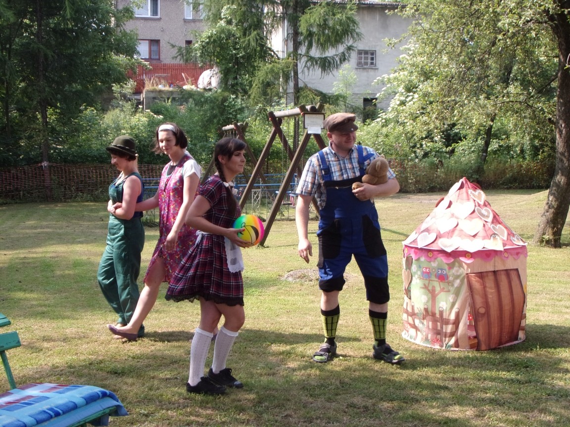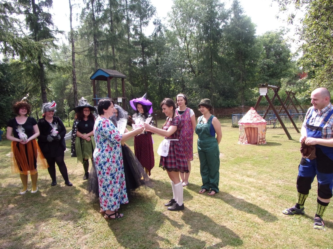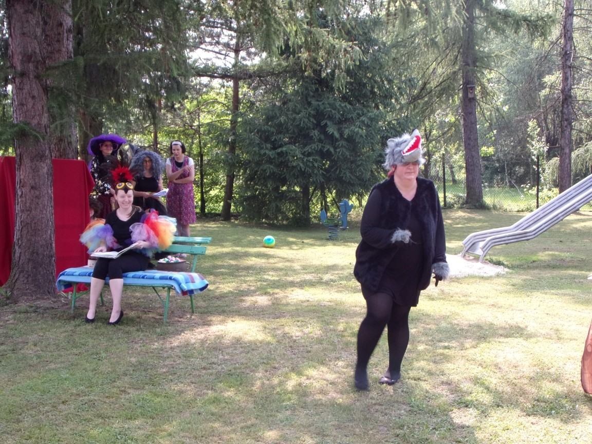 A co działo się później? Tego ani Jan Brzechwa, ani nawet Bracia Grimm nie mogli przewidzieć w swoich wersjach bajki o Jasiu i Małgosi. Nie jedna ale cztery czarownice wirowały w złowrogim tańcu wokół klatki z uwięzionymi głównymi bohaterami bajki. Wilk, który na szczęście okazał się wegetarianinem, drwal, który omal nie unicestwił naszej autentycznej starej jabłoni w ogrodzie przedszkolnym, narrator w barwach rajskiego ptaka i przede wszystkim rewelacyjna kreacja Jasia i Małgosi. Pomyślicie, że to aktualny repertuar Teatru Polskiego w Bielsku- Białej lub przynajmniej Teatru Lalek „Banialuka”? O nie, drodzy Państwo! Takie przedstawienie zostało opracowane i wystawione na placu zabaw przy Przedszkolu im. Władysława Pieronka w Radziechowach. Przedstawienia teatralne dla przedszkolaków przygotowywane wspólnie przez nauczycielki i rodziców wpisały się już w tradycję przedszkola. Pamiętamy rewelacyjne sztuki z lat poprzednich: „Kopciuszek” i „Czerwony Kapturek”. W tym roku przyszedł czas na bajkę pt. „Jaś i Małgosia”. Nie da się opisać radości dzieci i emocji związanych z odnajdywaniem w nietypowej roli swoich pań wychowawczyń i rodziców. Nadal pozostaję pod ogromnym wrażeniem tego wydarzenia i myślę, że podzielicie Państwo moje zdanie po obejrzeniu fotorelacji.