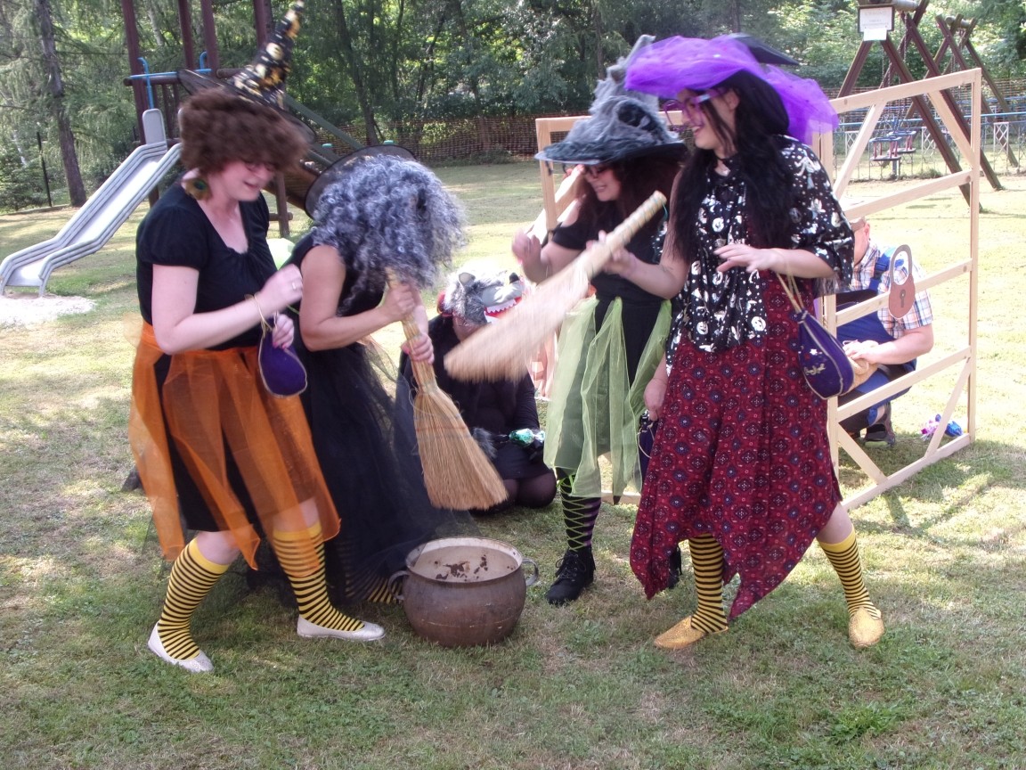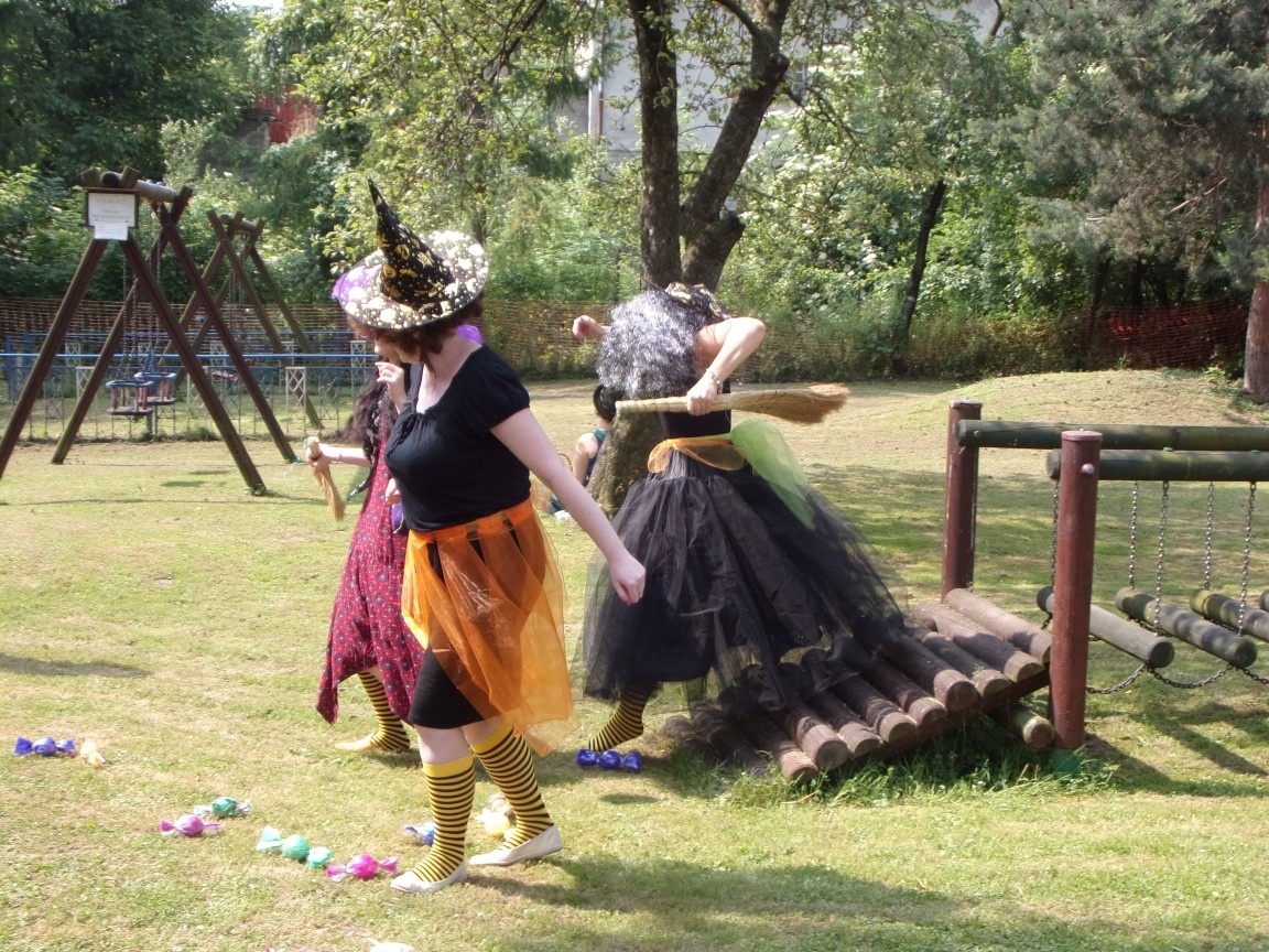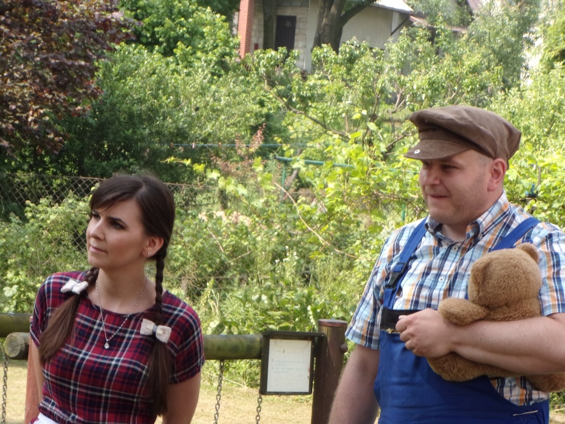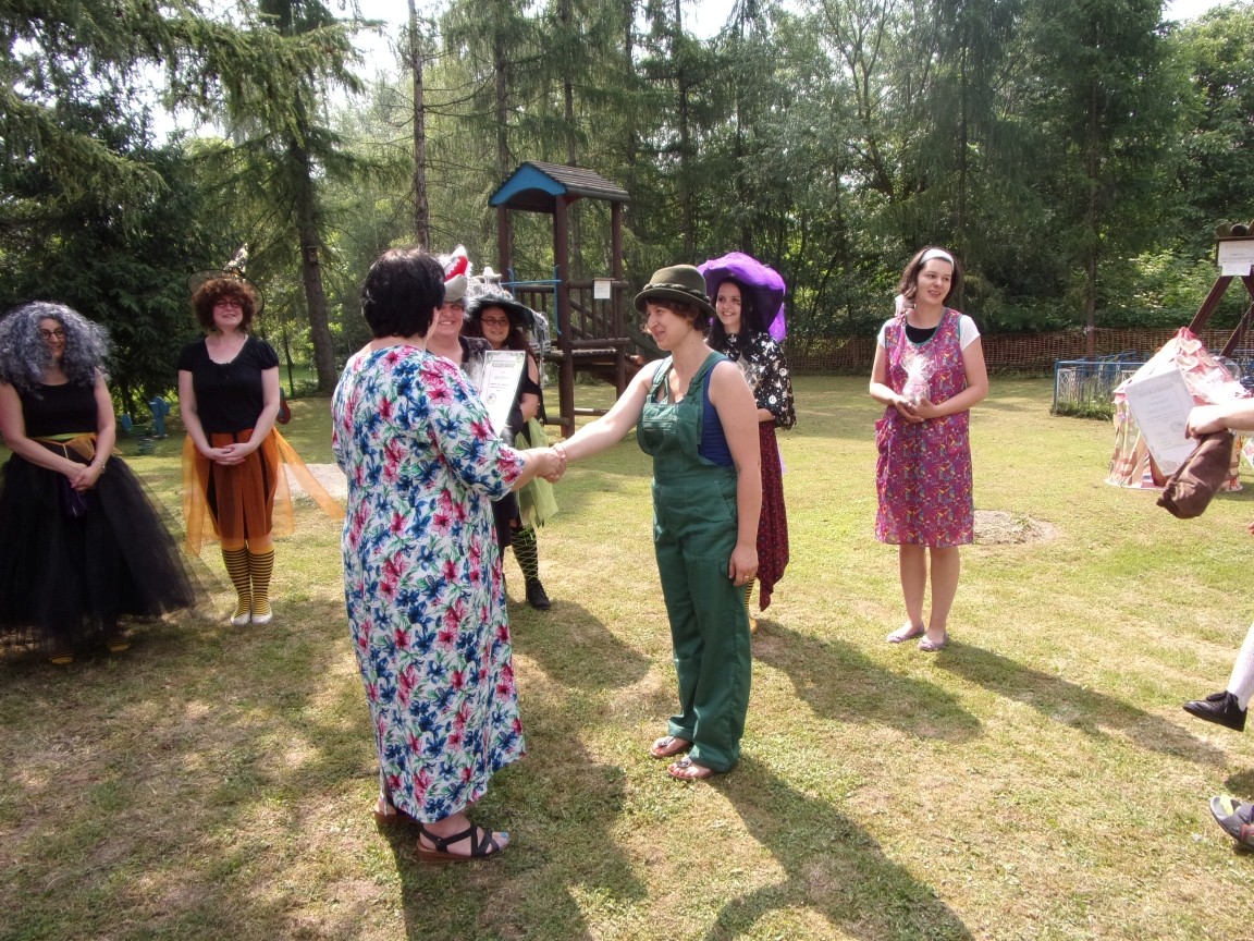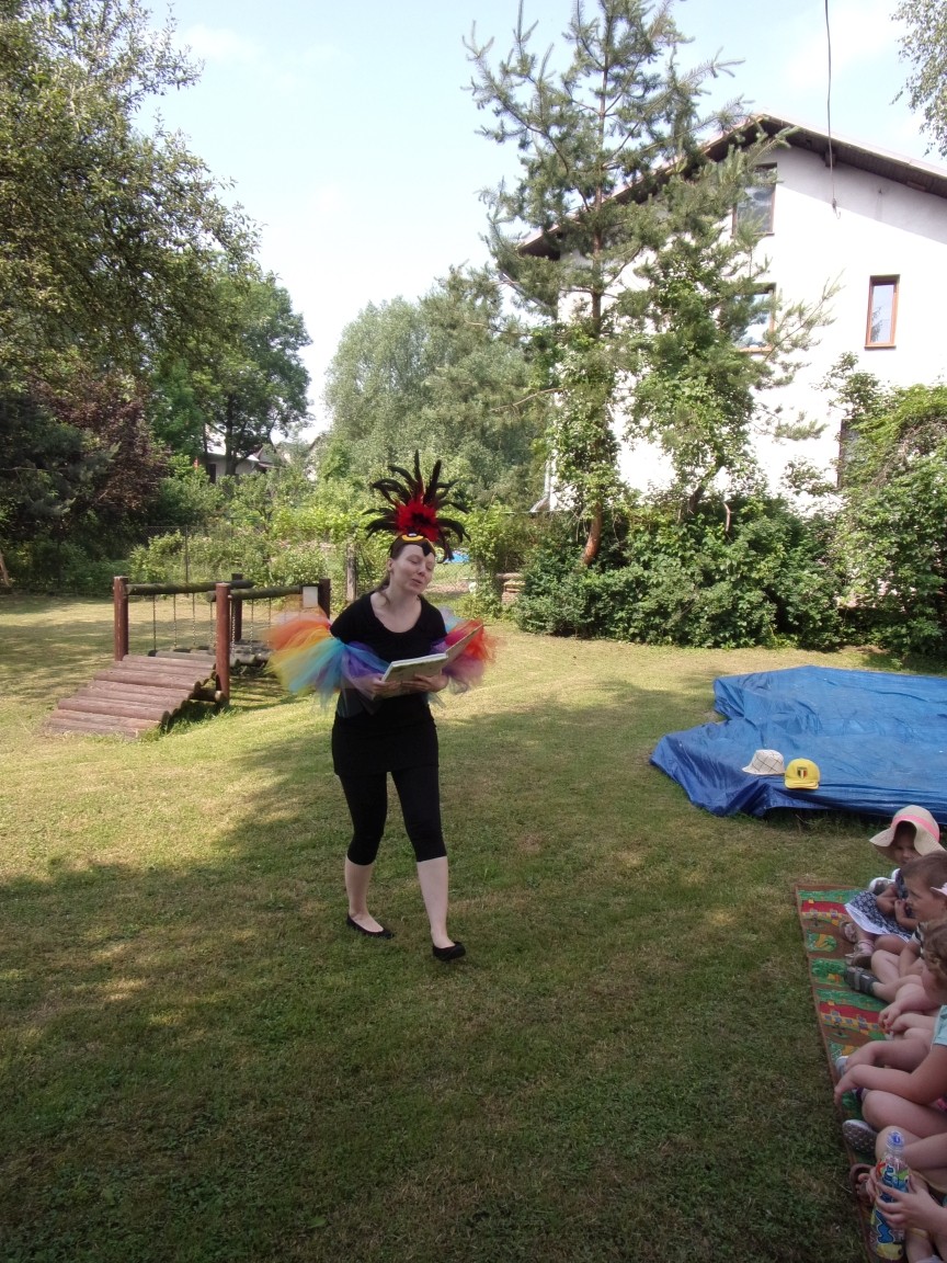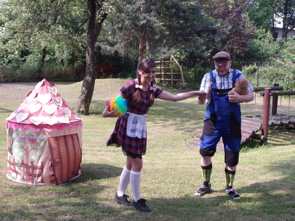 A co działo się później? Tego ani Jan Brzechwa, ani nawet Bracia Grimm nie mogli przewidzieć w swoich wersjach bajki o Jasiu i Małgosi. Nie jedna ale cztery czarownice wirowały w złowrogim tańcu wokół klatki z uwięzionymi głównymi bohaterami bajki. Wilk, który na szczęście okazał się wegetarianinem, drwal, który omal nie unicestwił naszej autentycznej starej jabłoni w ogrodzie przedszkolnym, narrator w barwach rajskiego ptaka i przede wszystkim rewelacyjna kreacja Jasia i Małgosi. Pomyślicie, że to aktualny repertuar Teatru Polskiego w Bielsku- Białej lub przynajmniej Teatru Lalek „Banialuka”? O nie, drodzy Państwo! Takie przedstawienie zostało opracowane i wystawione na placu zabaw przy Przedszkolu im. Władysława Pieronka w Radziechowach. Przedstawienia teatralne dla przedszkolaków przygotowywane wspólnie przez nauczycielki i rodziców wpisały się już w tradycję przedszkola. Pamiętamy rewelacyjne sztuki z lat poprzednich: „Kopciuszek” i „Czerwony Kapturek”. W tym roku przyszedł czas na bajkę pt. „Jaś i Małgosia”. Nie da się opisać radości dzieci i emocji związanych z odnajdywaniem w nietypowej roli swoich pań wychowawczyń i rodziców. Nadal pozostaję pod ogromnym wrażeniem tego wydarzenia i myślę, że podzielicie Państwo moje zdanie po obejrzeniu fotorelacji.