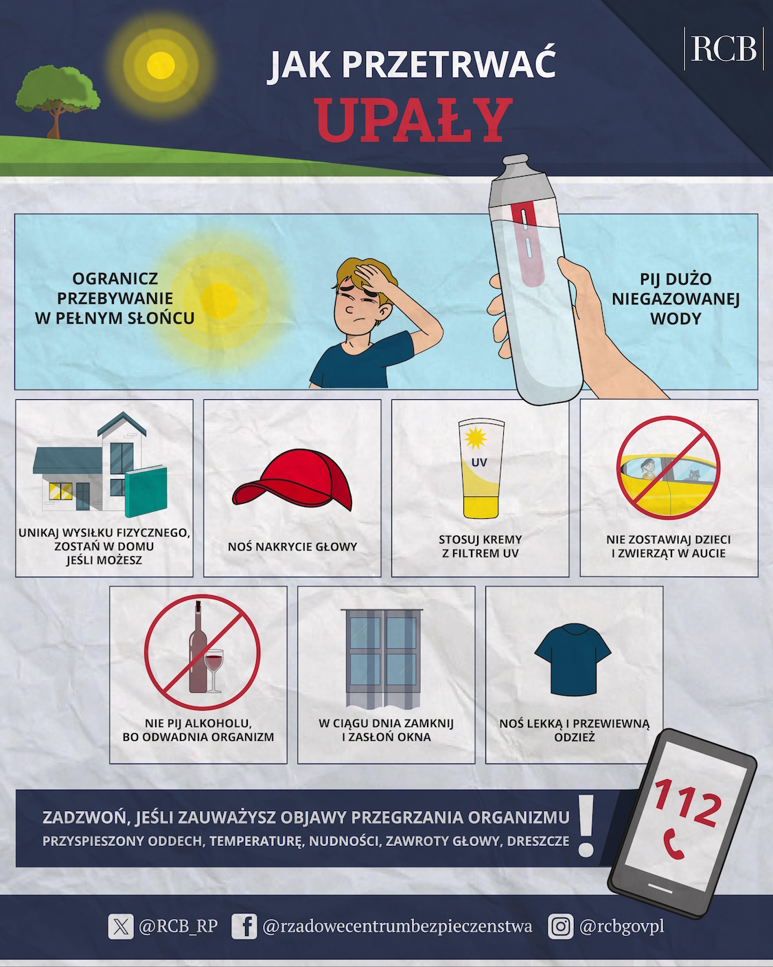 Wraz ze wzrostem temperatur znacząco wzrasta ryzyko odwodnienia oraz przegrzania organizmu. Upał może doprowadzić do wystąpienia udaru słonecznego lub cieplnego, który jest stanem zagrażającym zdrowiu, a nawet życiu. Jego objawy to m.in: