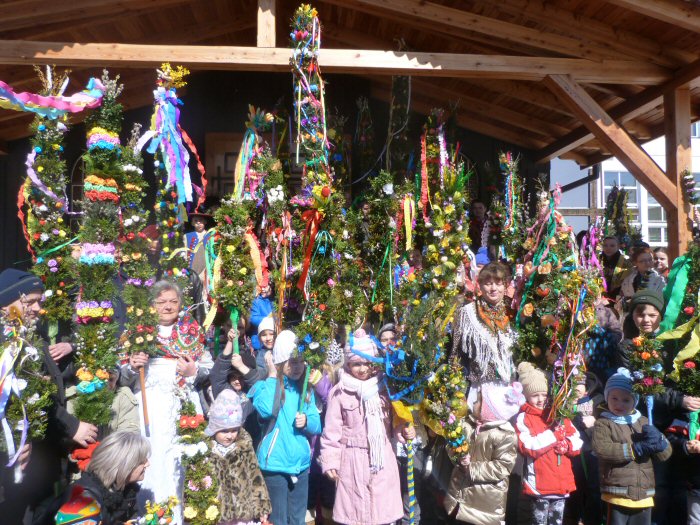 - palmy tradycyjne (kocanki, kwiaty bibułkowe lub żywe, kopytnik, jabłko, jałowiec, drzewko oliwne czyli tuja, bukszpan, kokoc (drzewo różańcowe) cis, jemioła, barwinek lub inne zielone dodatki),