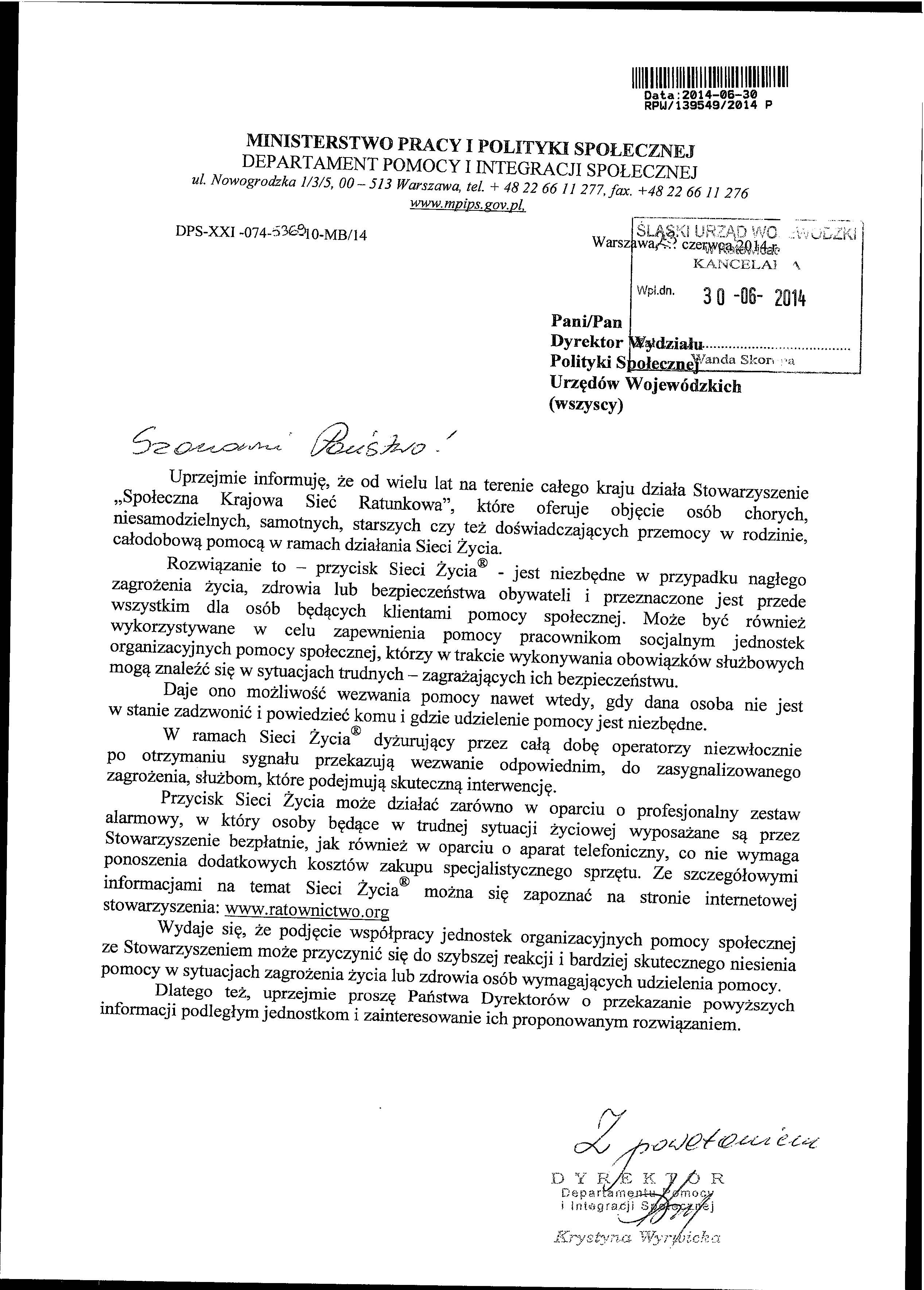 Uprzejmie informuję, że od wielu lat na terenie całego kraju działa Stowarzyszenie „Społeczna Krajowa Sieć Ratunkowa", które oferuje objęcie osób chorych, niesamodzielnych, samotnych, starszych czy też doświadczających przemocy w rodzinie, całodobową pomocą w ramach działania Sieci Życia.