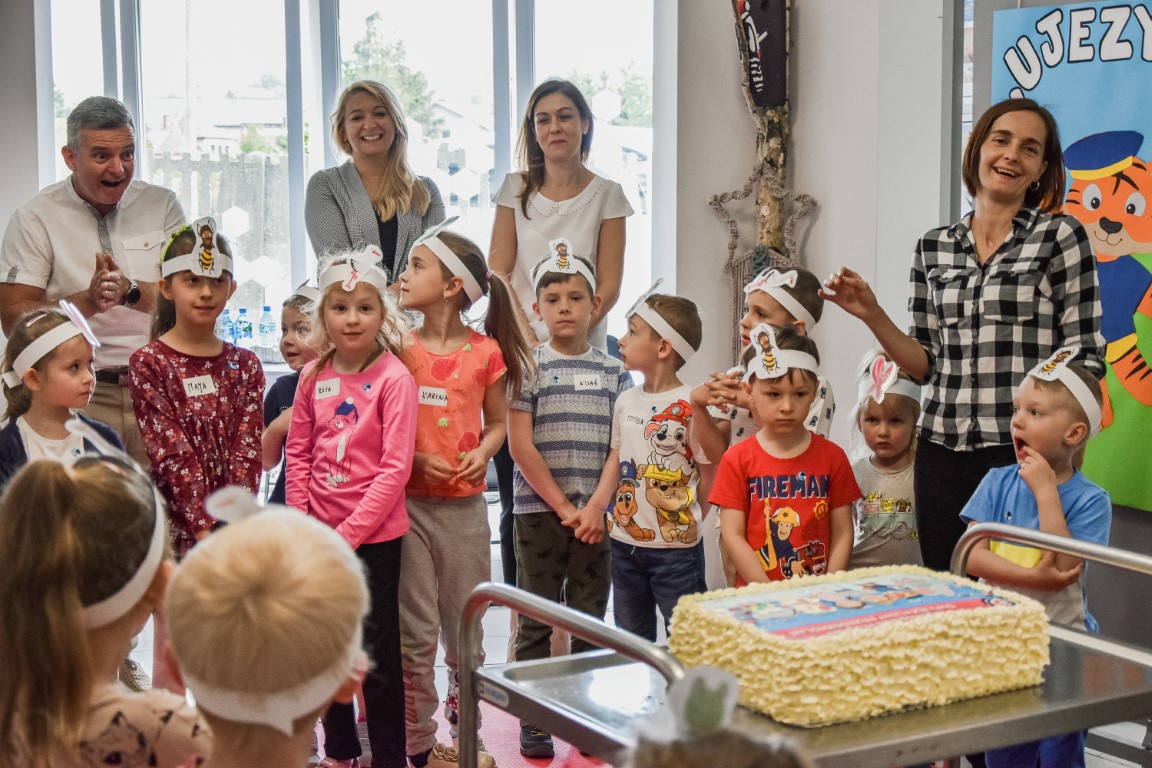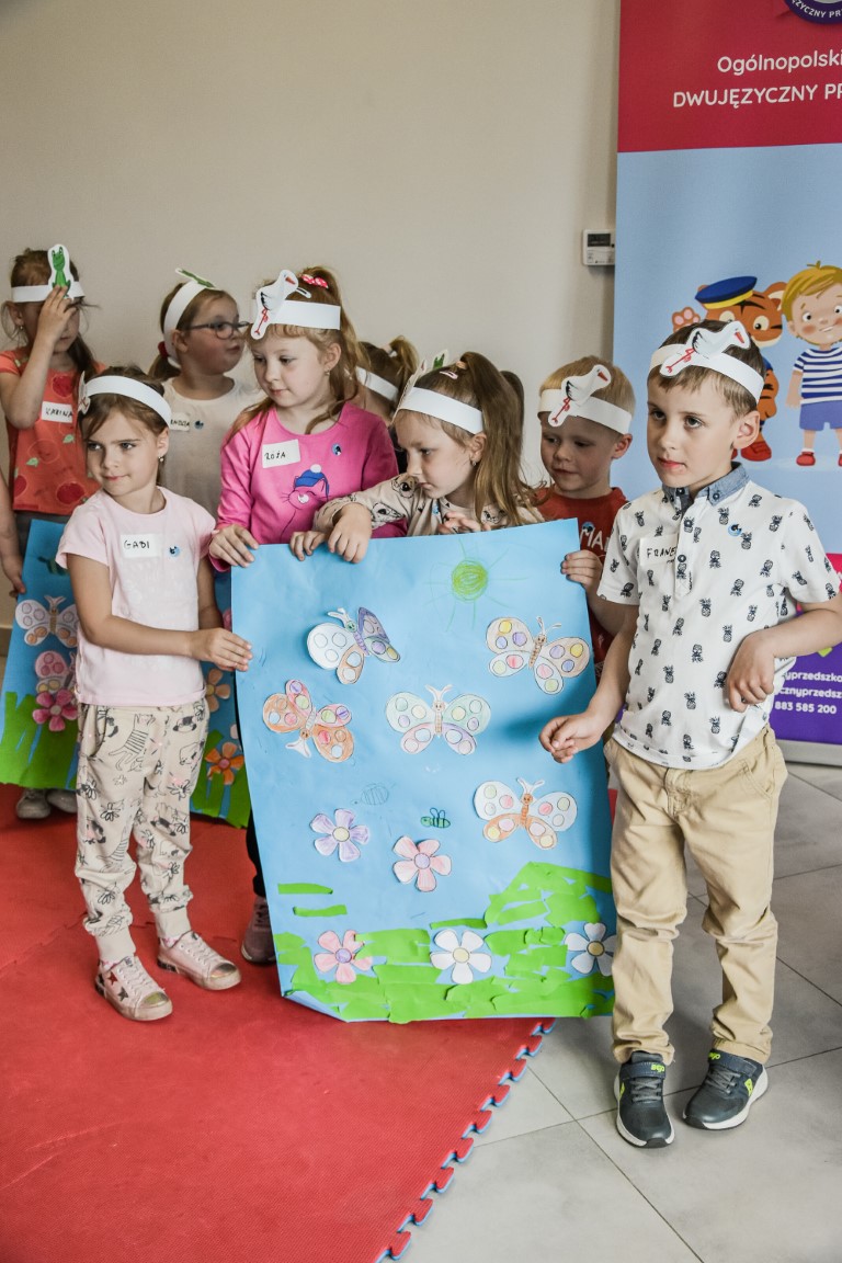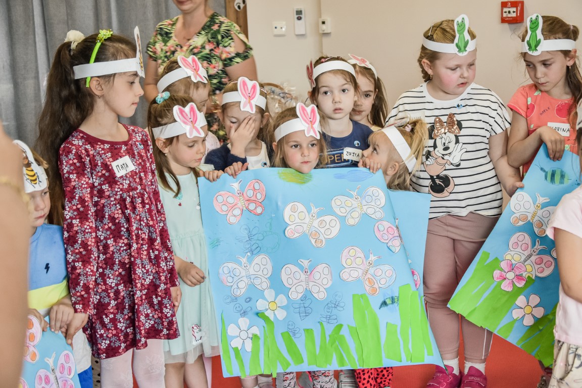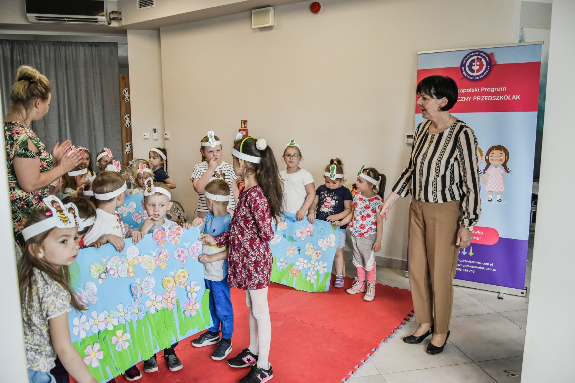 Podczas całego zajęcia panowała bardzo radosna atmosfera, widoczne było u dzieci ogromne zainteresowanie i zaangażowanie w działania. Na zakończenie zajęć dzieci zaprezentowały wykonane w grupach piękne plakaty przedstawiające łąkę, a w nagrodę wszyscy zebrani otrzymali pyszny kawałek tortu upieczonego specjalnie na tą okazję. Ponadto organizatorzy zadbali o upominki dla przedszkolaków i podziękowania dla przybyłych gości. To był wspaniały czas spędzony w radosnej i ciepłej atmosferze, przepełniony emocjami, które na długo pozostaną w świadomości uczestników spotkania.
