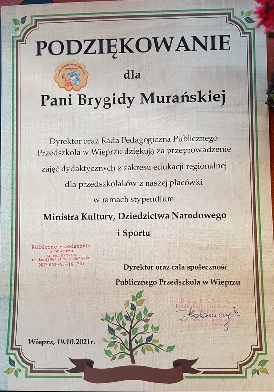 W imieniu całej społeczności Publicznego Przedszkola w Wieprzu serdecznie dziękujemy Pani Brygidzie Murańskiej za poświęcony czas i zaangażowanie w szerzenie wśród dzieci i młodzieży tradycji naszego regionu, a tym samym budzenie w nich poczucia przynależności do naszej pięknej Małej Ojczyzny. Gratulujemy i życzymy dalszych sukcesów.