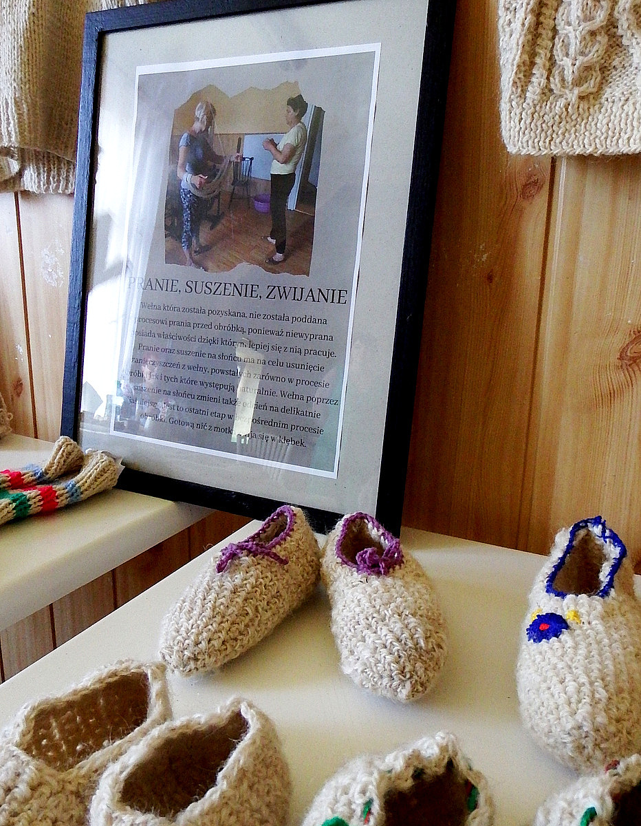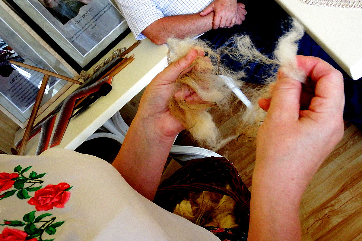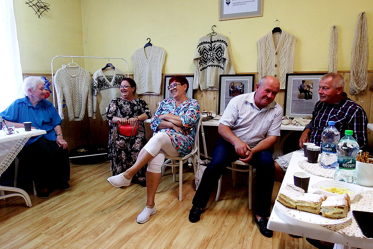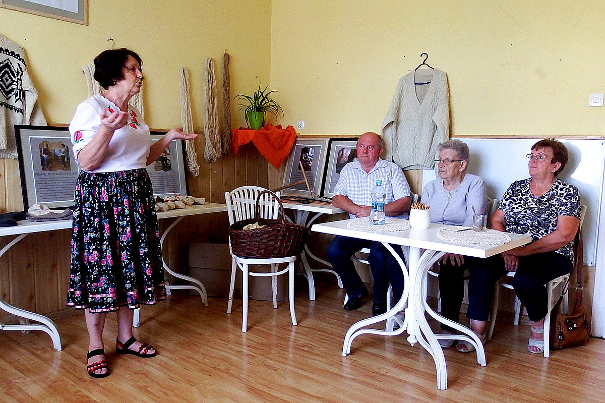 22 lipca 2023 roku odbyło się spotkanie podsumowujące Stypendium Mistrz-Uczeń Narodowego Instytutu Kultury i Dziedzictwa Wsi, które w naszym przypadku dotyczyło przekazania umiejętności tradycyjnej obróbki wełny.. Z tej okazji stypendystki (Jadwiga KLIŚ - mistrz i Genowefa PITRASZKO - uczeń) przygotowały małą wystawę, na której zaprezentowane zostały efekty ich pracy - można było obejrzeć stary sprzęt służący do obróbki, wełnę na każdym etapie jej obróbki - od tej surowej pozyskanej od owcy, przez zgręplowaną, tą w postaci gotowej nici a także już gotowe wyplecione elementy. Na wystawie pojawiły się ilustracje pokazujące poszczególne etapy obróbki wełny, nie zabrakło także krótkiego pokazu przędzenia. Spotkanie odbyło się w kameralnym gronie przyjaciół stypendystek, była to okazja do bardzo ciekawych rozmów i wspomnień. Opowieści Pani Jadwigi o dzieciństwie i czasie spędzonym z ojcem na hali, z perspektywy dzisiejszych czasów wydają się wręcz nieprawdopodobne, momentami można powiedzieć nawet "mrożące krew w żyłach". Wszyscy zebrani byli mocno zasłuchani w historię o dawnych wierzeniach i zwyczajach pasterskich - o tym jak wielką wiedzę na temat przyrody, przewidywania pogody, czy tez leczenia chorób musiał posiadać baca. Mistrzyni opowiedziała także o właściwościach zdrowotnych, które posiada wełna, a konkretnie zawarta w niej lanolina. Czy wiedzieliście, że surową zgręplowaną wełnę możecie stosować pomocniczo jako okład na bóle reumatyczne lub stany zapalne? Bardzo serdecznie dziękujemy wszystkim za poświęcony czas i za obecność