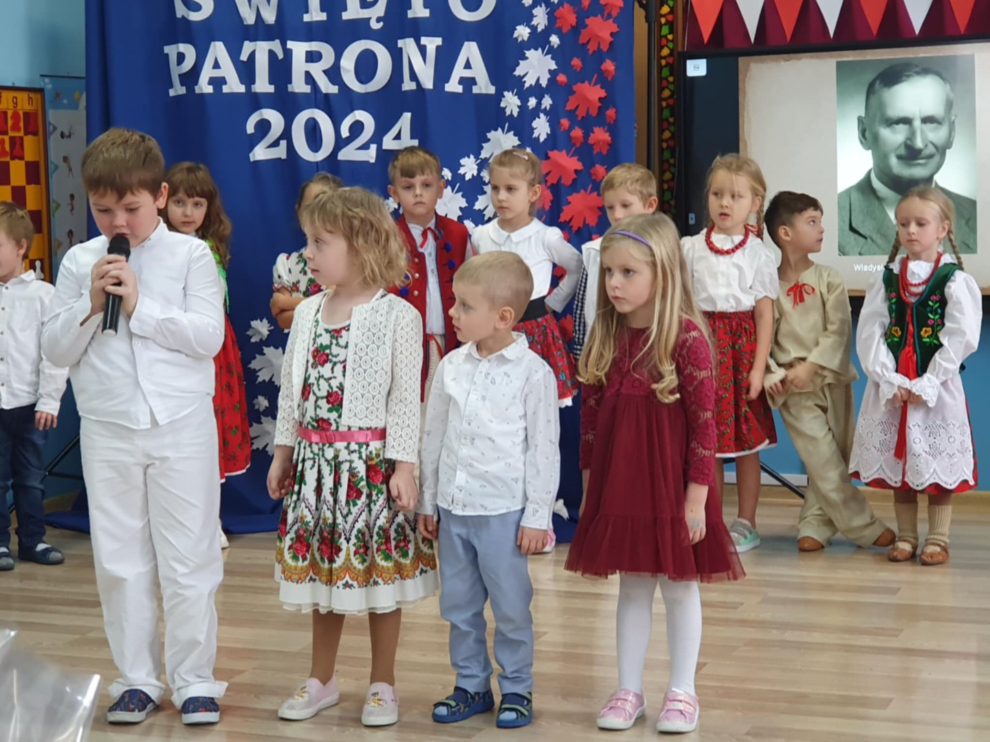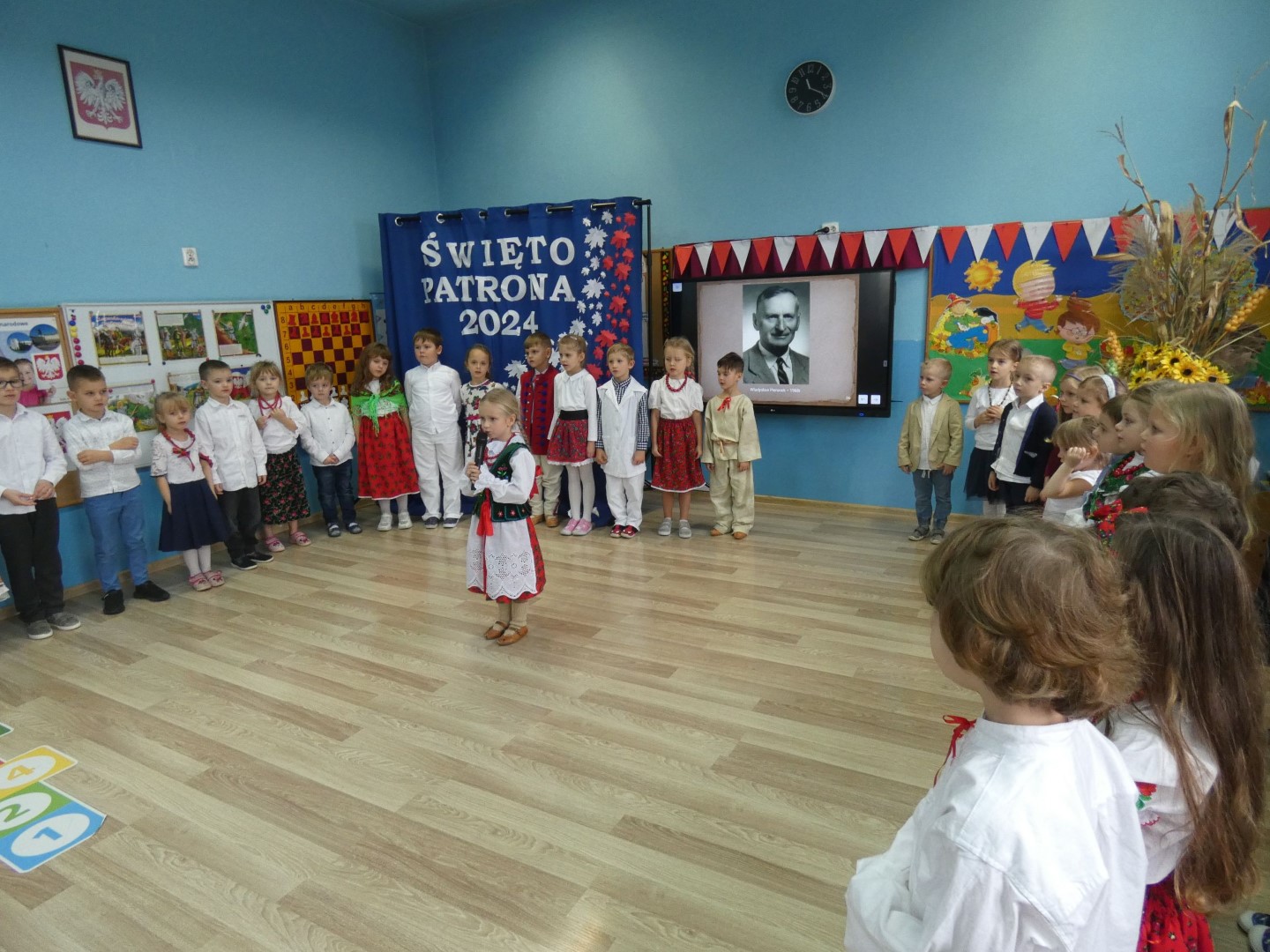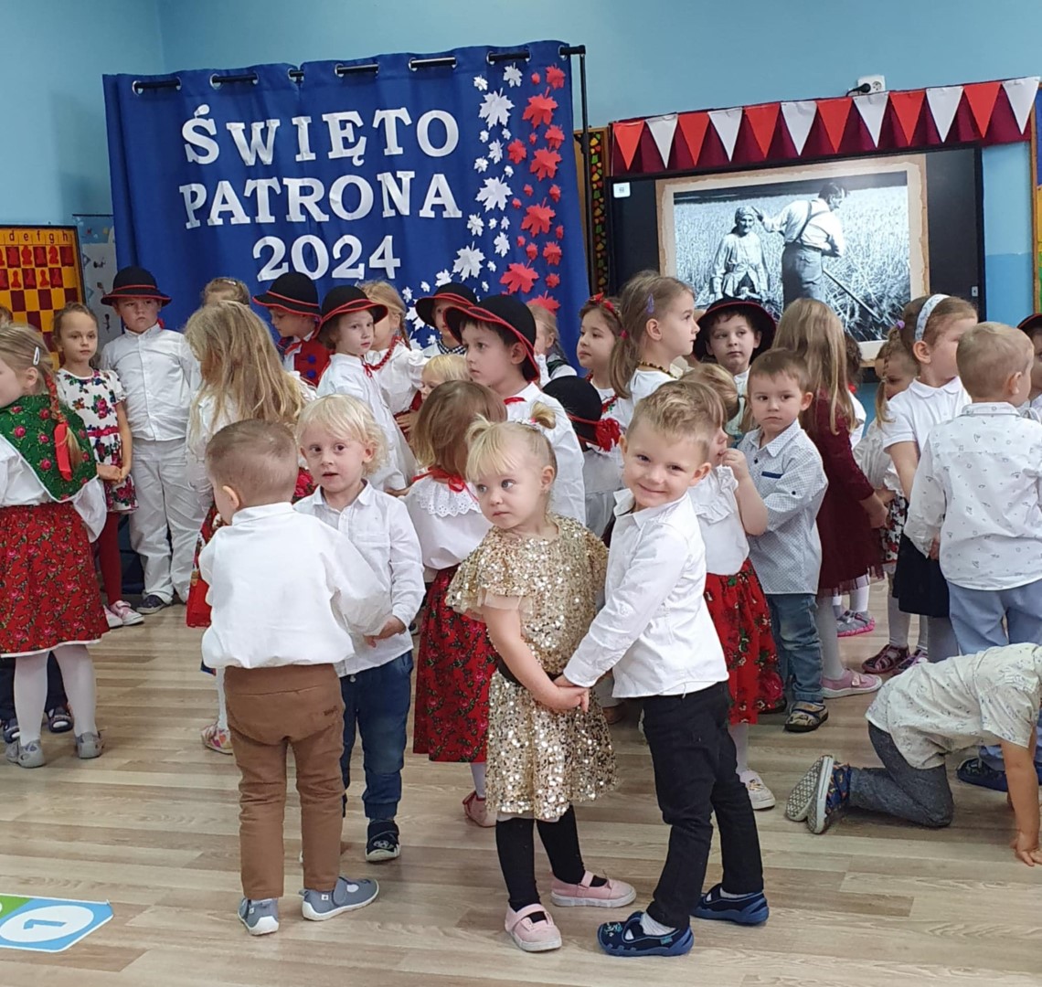 Listopadowe patriotyczne świętowanie przedszkolaków rozpoczęło się już 31 października 2024r. złożeniem kwiatów na nagrobkach Władysława Pieronka i jego bliskich. 7 listopada 2024r. Święto Patrona obchodzili wychowankowie przedszkola przy ul. Głównej z udziałem zaproszonych rodziców i emerytowanych pracowników przedszkola. 8 listopada 2024r. kontynuowaliśmy obchody w przedszkolu przy ul. Świętego Marcina. Świętowała cała społeczność przedszkola: wychowankowie, nauczyciele, pracownicy obsługi i rodzice przedszkolaków. Uroczystość uświetnili swoją obecnością zaproszeni goście: Wójt Gminy Maciej Mika, Ksiądz Dziekan Piotr Pokojnikow, Przewodniczący Rady Gminy Jacek Świniański, Kierownik Referatu Oświaty Małgorzata Piela, Sołtys Radziechów Janina Tlałka, Przewodnicząca Rady Rodziców Dajana Chomicz, Sierżant Wojska Polskiego w stanie spoczynku Krzysztof Bejcar, Prezes Koła Pszczelarzy Tadeusz Ozimiński. Motywem przewodnim części artystycznej były dożynki jako zwieńczenie ciężkiej pracy na roli i wyraz patriotyzmu wyrażanego w codziennym trudzie dla Ojczyzny. Tegoroczne obchody zbiegły się z ogólnopolską akcją „Szkoła do hymnu”, w której wzięli udział wszyscy uczestnicy uroczystości. Święto Patrona zakończono pamiątkowymi zdjęciem wszystkich uczestników. Dziękujemy Radzie Rodziców za sfinansowanie wydania albumów pamiątkowych, ufundowanie kwiatów złożonych na grobach Patrona Przedszkola i jego syna Mieczysława, a także za przygotowanie słodkiego poczęstunku dla uczestników uroczystości.