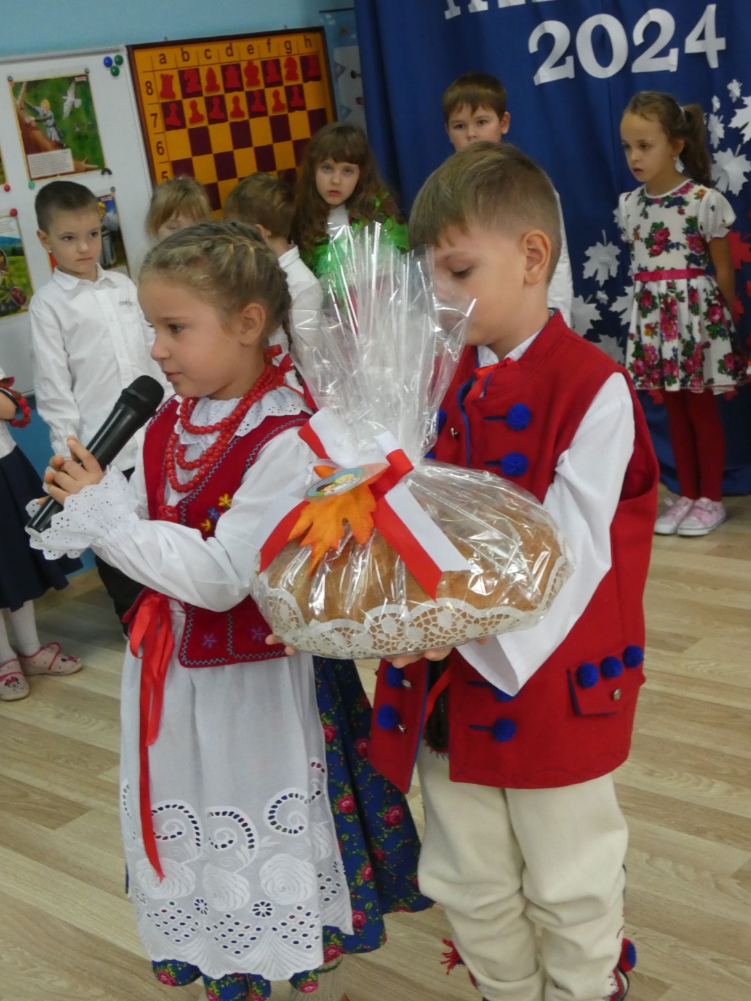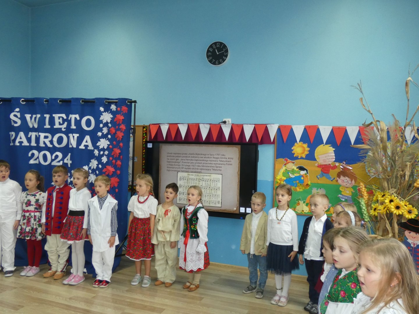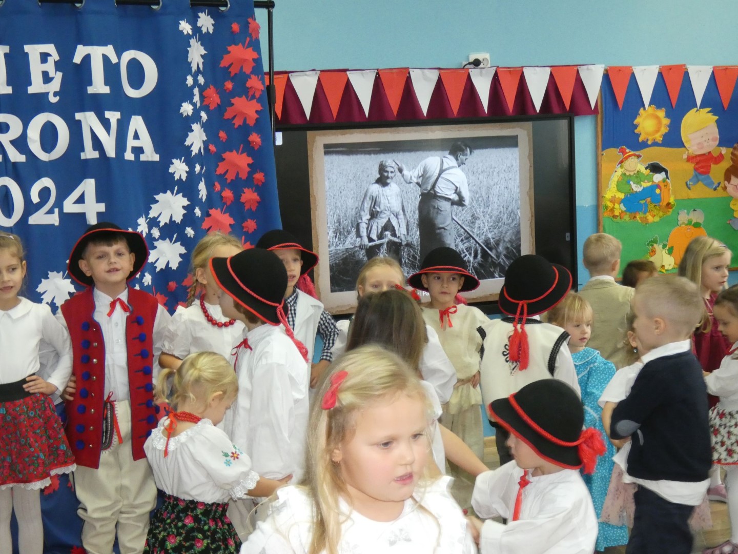 Listopadowe patriotyczne świętowanie przedszkolaków rozpoczęło się już 31 października 2024r. złożeniem kwiatów na nagrobkach Władysława Pieronka i jego bliskich. 7 listopada 2024r. Święto Patrona obchodzili wychowankowie przedszkola przy ul. Głównej z udziałem zaproszonych rodziców i emerytowanych pracowników przedszkola. 8 listopada 2024r. kontynuowaliśmy obchody w przedszkolu przy ul. Świętego Marcina. Świętowała cała społeczność przedszkola: wychowankowie, nauczyciele, pracownicy obsługi i rodzice przedszkolaków. Uroczystość uświetnili swoją obecnością zaproszeni goście: Wójt Gminy Maciej Mika, Ksiądz Dziekan Piotr Pokojnikow, Przewodniczący Rady Gminy Jacek Świniański, Kierownik Referatu Oświaty Małgorzata Piela, Sołtys Radziechów Janina Tlałka, Przewodnicząca Rady Rodziców Dajana Chomicz, Sierżant Wojska Polskiego w stanie spoczynku Krzysztof Bejcar, Prezes Koła Pszczelarzy Tadeusz Ozimiński. Motywem przewodnim części artystycznej były dożynki jako zwieńczenie ciężkiej pracy na roli i wyraz patriotyzmu wyrażanego w codziennym trudzie dla Ojczyzny. Tegoroczne obchody zbiegły się z ogólnopolską akcją „Szkoła do hymnu”, w której wzięli udział wszyscy uczestnicy uroczystości. Święto Patrona zakończono pamiątkowymi zdjęciem wszystkich uczestników. Dziękujemy Radzie Rodziców za sfinansowanie wydania albumów pamiątkowych, ufundowanie kwiatów złożonych na grobach Patrona Przedszkola i jego syna Mieczysława, a także za przygotowanie słodkiego poczęstunku dla uczestników uroczystości.