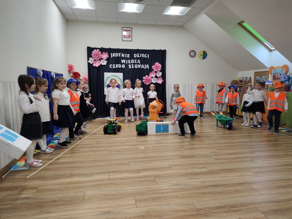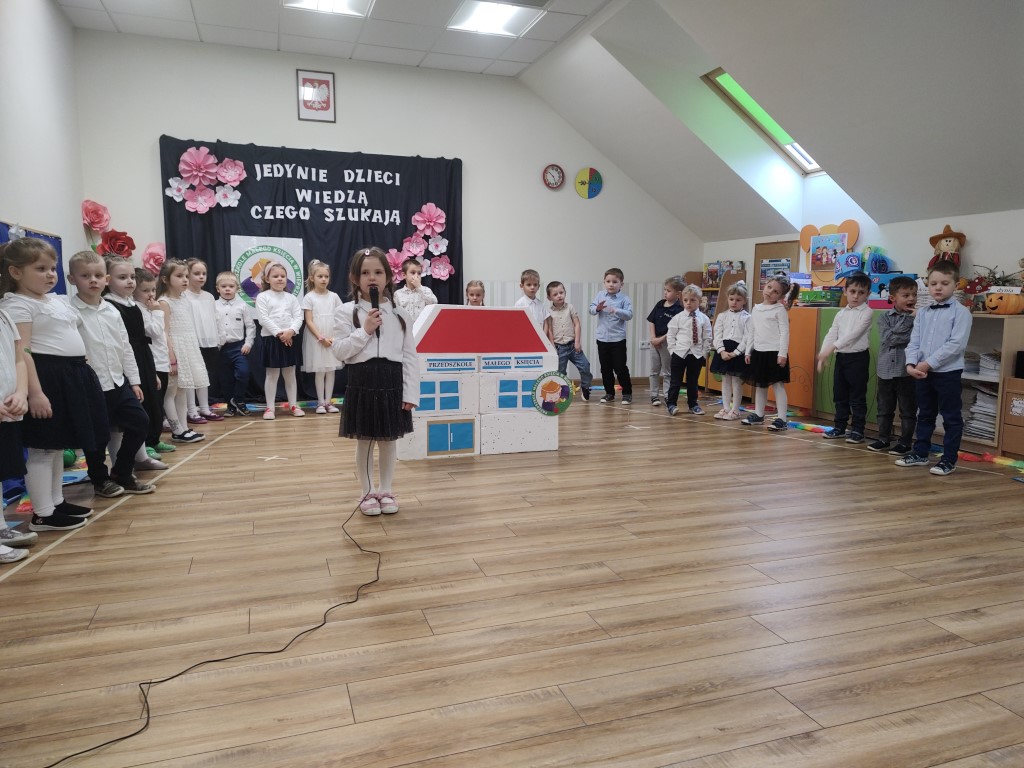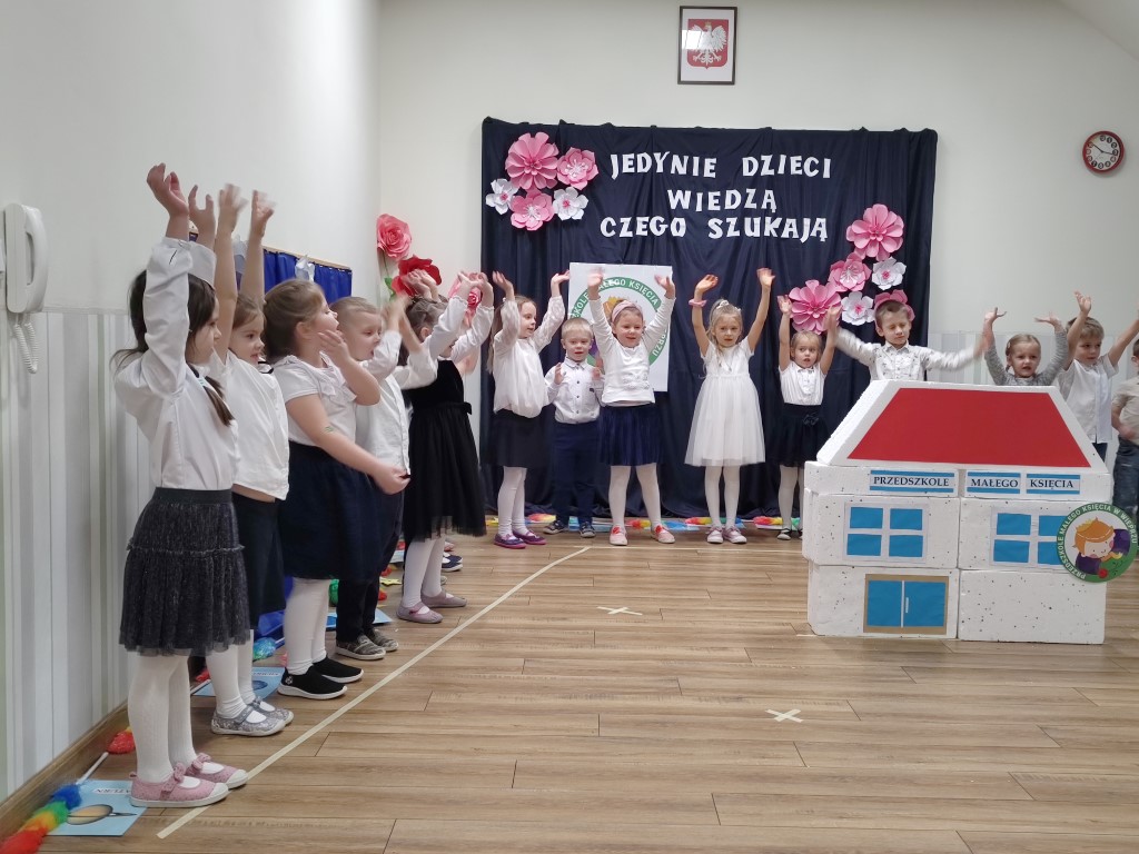 Dla zaproszonych gości, pracowników przedszkola i przedszkolaków grupa Przyjaciele Planet wraz ze swoimi wychowawczyniami Panią M. Więcek i I. Dudek przygotowały montaż słowno – muzyczny pod hasłem „Jedynie dzieci wiedzą czego szukają”, który wprowadził wszystkich obecnych w bardzo radosny nastrój świętowania. Podczas występu dzieci odgrywały scenki związane z budową przedszkola i jego otwarciem, następnie w bardzo trafny sposób przedstawiły treści związane z ich prawami, po czym zaprezentowały swoją wiedzę i umiejętności zdobyte na zajęciach przedszkolnych od początku roku szkolnego.