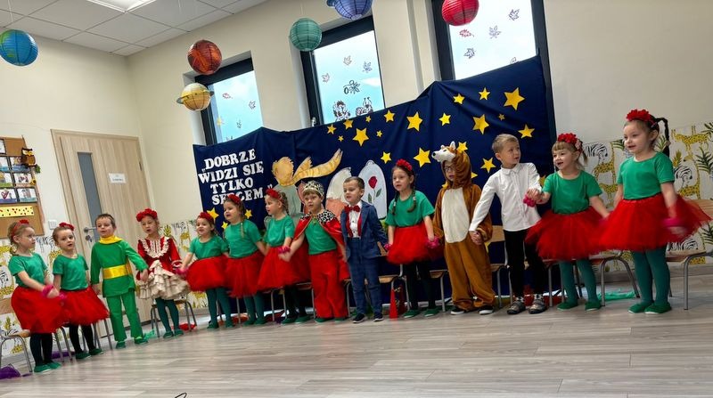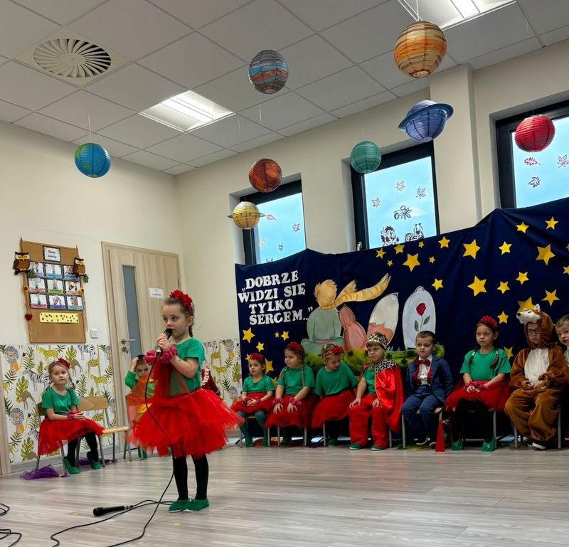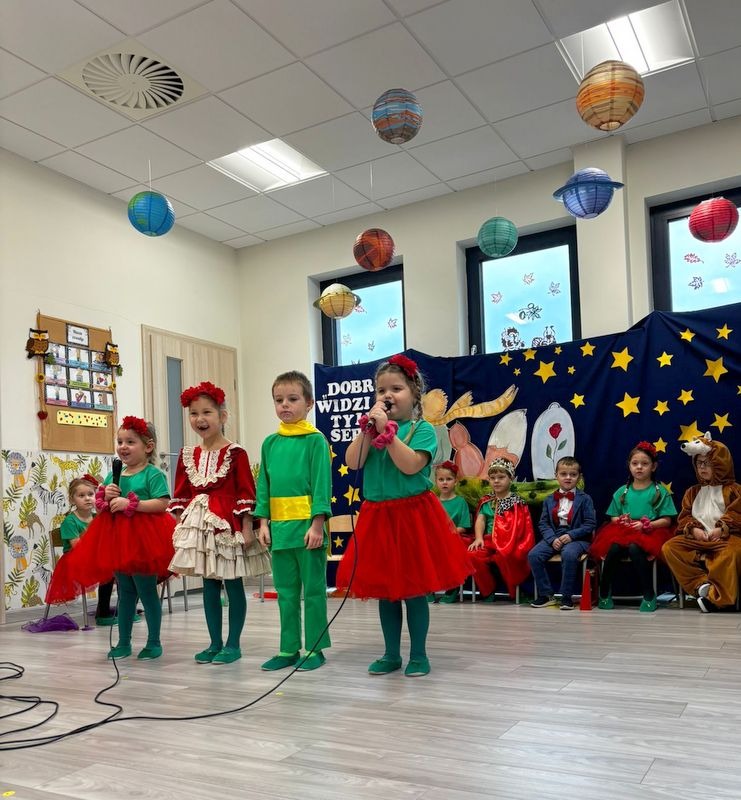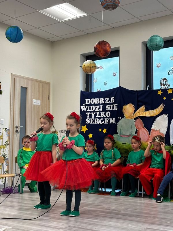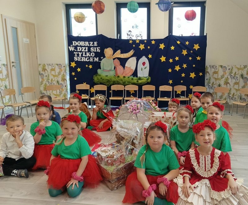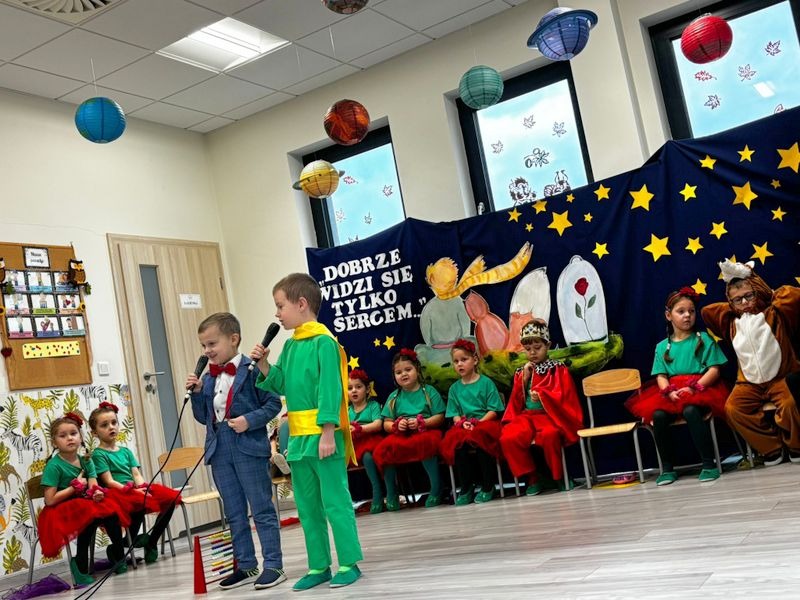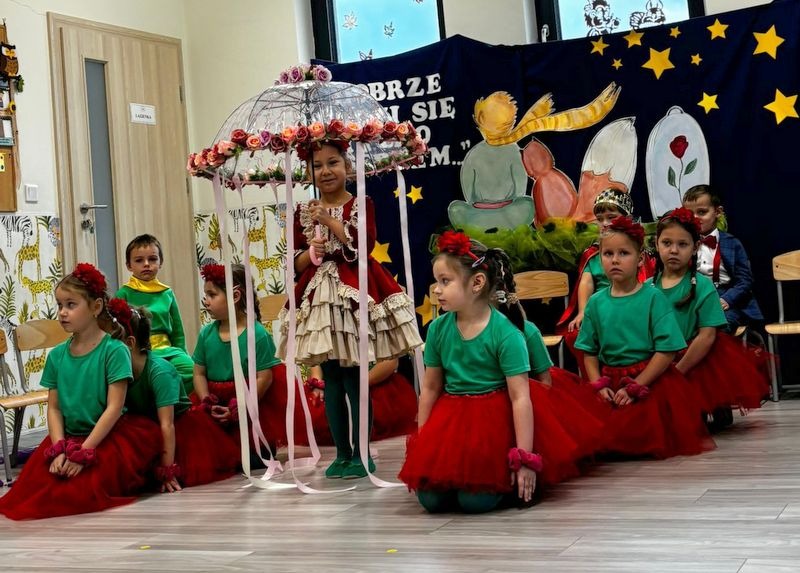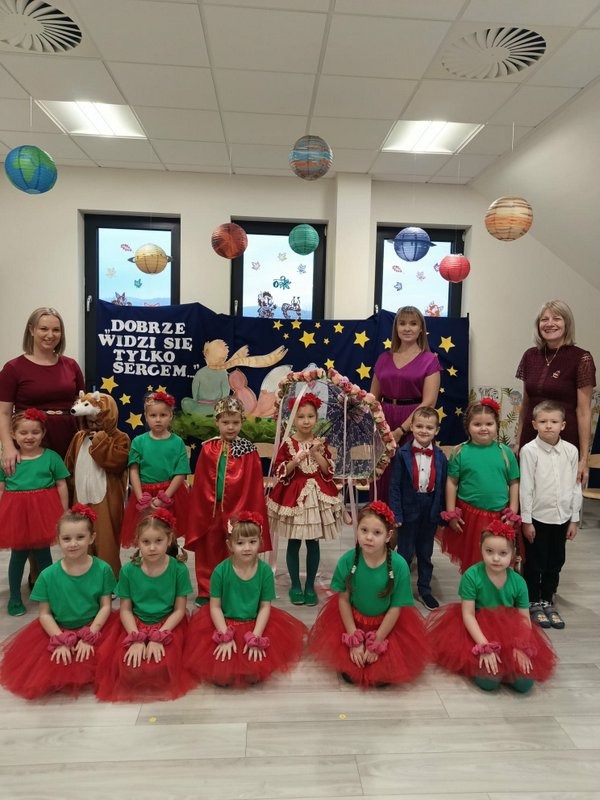 Dla zaproszonych gości, przedszkolaki wraz ze swoimi wychowawczyniami przygotowały piękny montaż słowno – muzyczny, który oparty był na kanwie przygód naszego patrona Małego Księcia, opisanych w książce A. de Saint Exupery’ego, a jego głównym przesłaniem było dążenie do pięknej i trwałej przyjaźni. Kulminacyjnym momentem uroczystości było wspólne z gośćmi odśpiewanie hymnu przedszkola „Piosenka o Małym Księciu”. Na zakończenie części artystycznej goście zostali obdarowani pamiątkowymi upominkami.