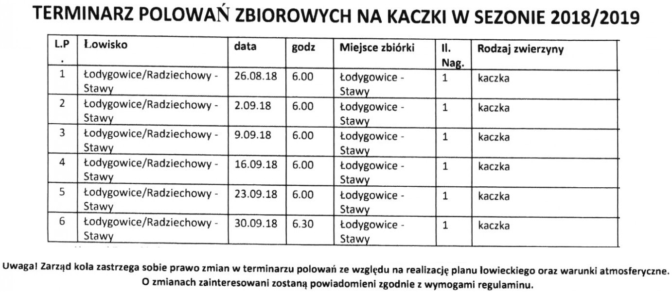 Terminarz polowań Kół Łowieckich na kaczki w sezonie 2018/2019 Dodano: 16.08.2018 r. Kategoria: Ogłoszenia