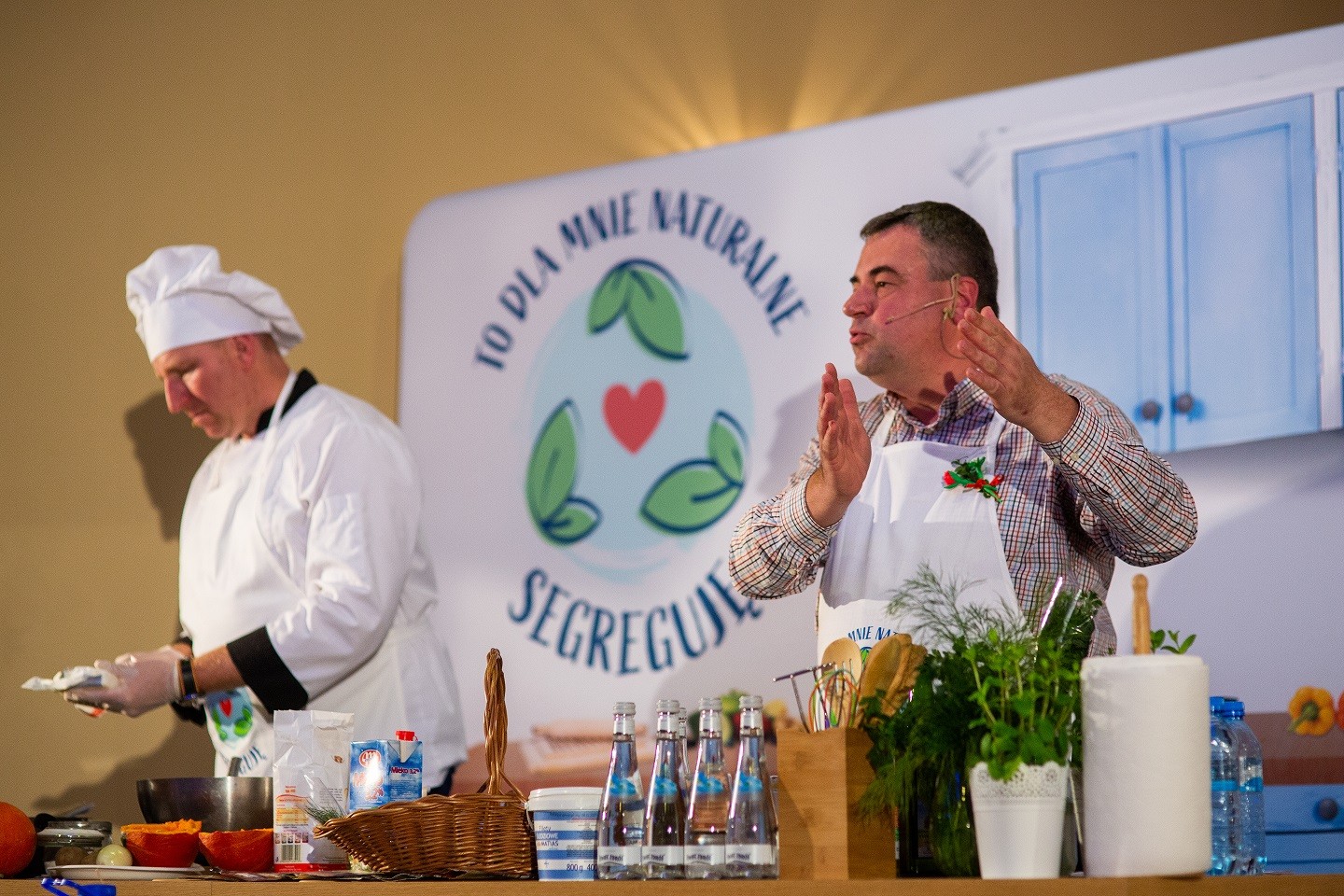 Pokaz kulinarny był dla uczestników spotkania także okazją do tego, aby poznać zasady prawidłowej segregacji odpadów, jakie powstają podczas przyrządzania posiłków. Kucharzowi towarzyszył bowiem Michał Mikołajczyk z Organizacji Odzysku Opakowań Rekopol, który na bieżąco omawiał każdy z odpadów powstających podczas pokazu i wskazywał uczestnikom, do którego kosza powinien trafić. Dzięki temu, uczestnicy poznali zasady prawidłowej segregacji, a także dowiedzieli się, dlaczego jest ona tak istotna.