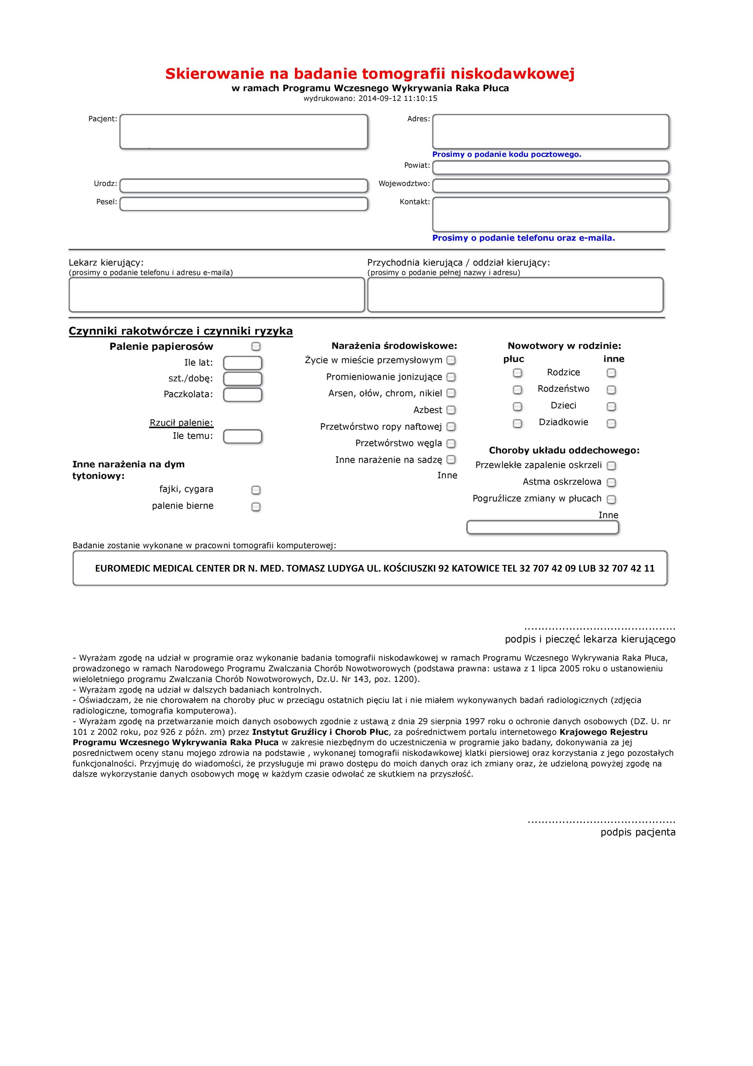 Badania te będą wykonywane od 1 października 2014 do 30 listopada 2014 w pracowni TK EuroMedic Medical Center w Katowicach przy ul. Kościuszki 92 na podstawie załączonego skierowania, codziennie w godzinach 08.00-20.00. Skierowanie może być wystawione przez lekarza rodzinnego, dowolnego lekarza specjalisty lub lekarza Izby Przyjęć naszego Szpitala.