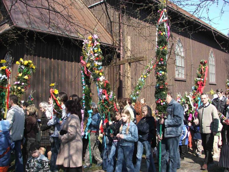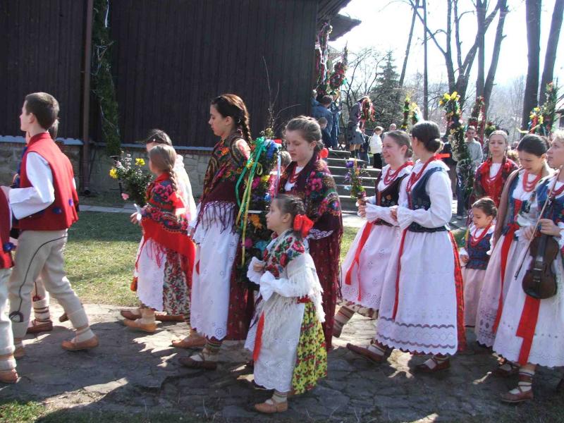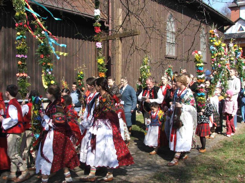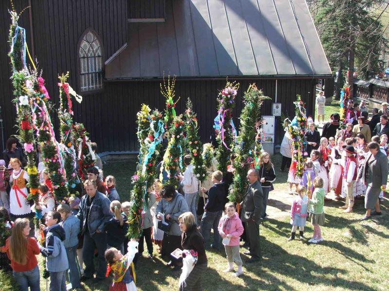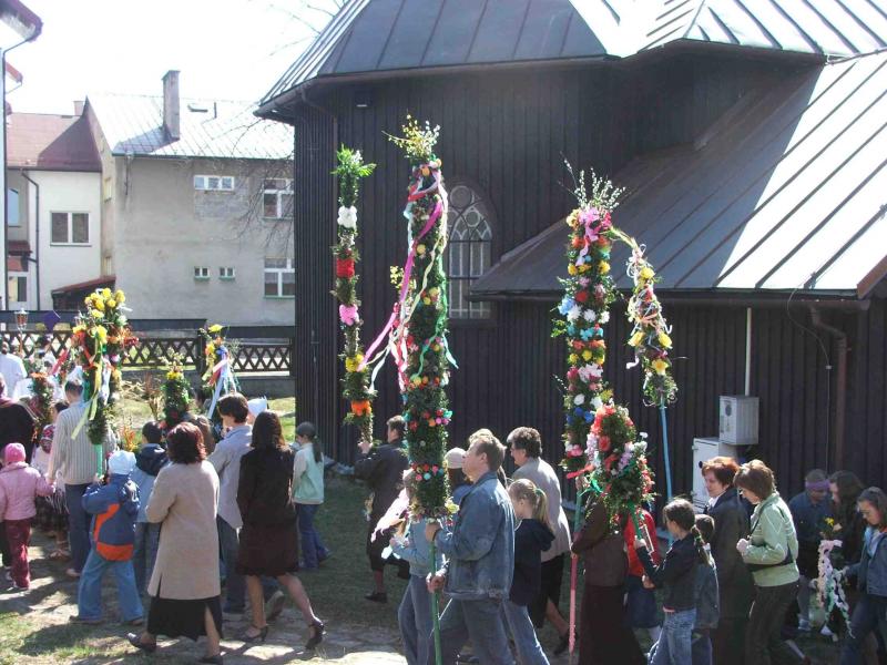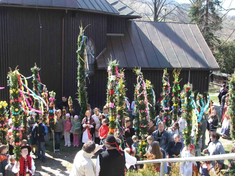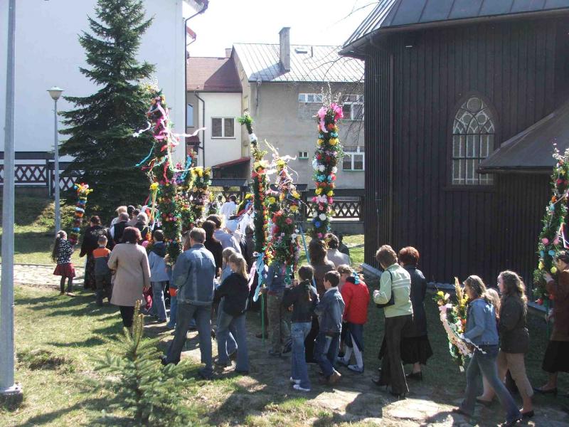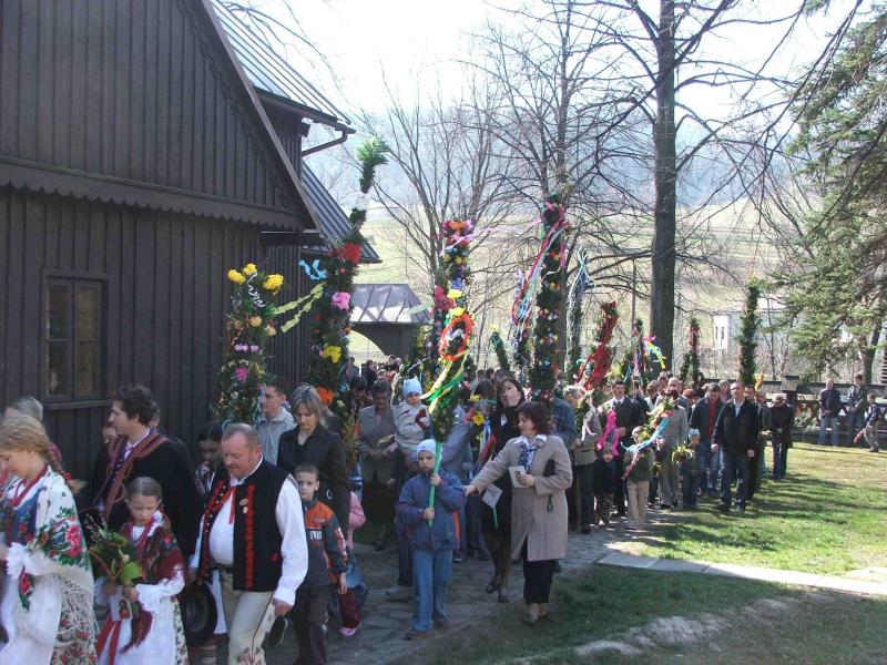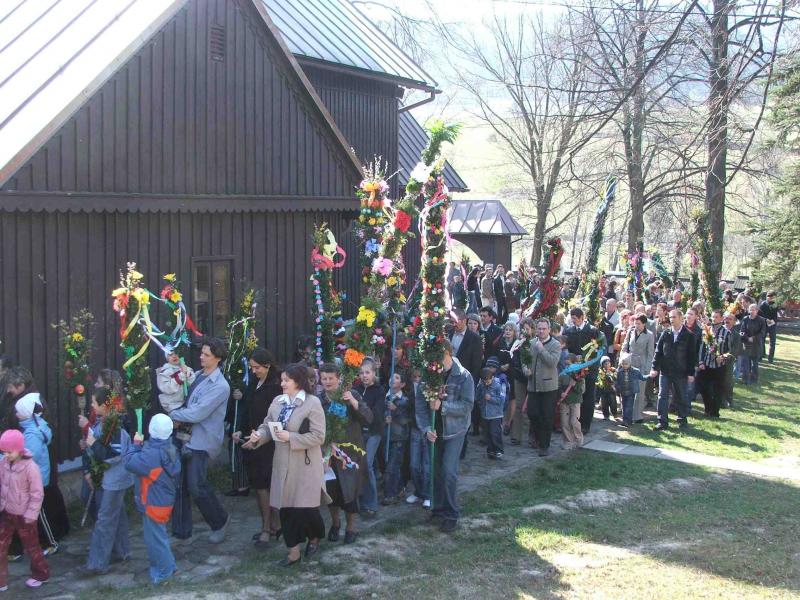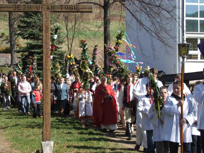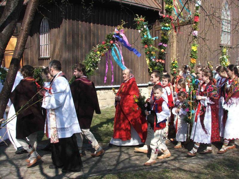 Piękna słoneczna pogoda sprawiła że kolorowe palmy pięknie prezentowały się w czasie procesji na tle zabytkowego kościoła w Juszczynie. Podczas tegorocznego święta parafianie przynieśli do kościoła ok 205 palm.