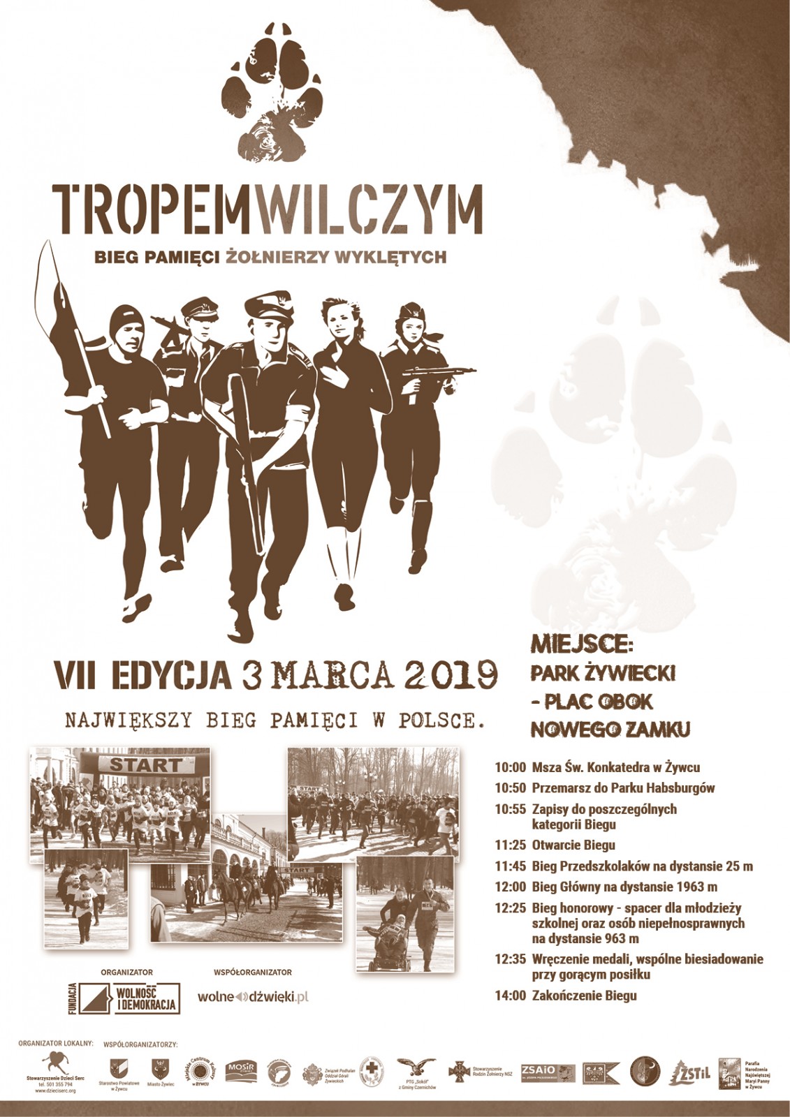 ''Tropem Wilczym. Bieg Pamięci Żołnierzy Wyklętych'' w Żywcu - 3 marca 2019 r. Dodano: 27.02.2019 r. Kategoria: Kultura Organizator: Fundacja Wolność i Demokracja Organizator lokalny: Stowarzyszenie Dzieci Serc - Radziechowy