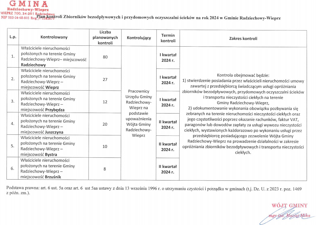 w związku z wejściem w życie nowych przepisów ustawy o utrzymaniu czystości i porządku w gminach (tj. Dz. U. z 2024r., poz, 399 z późn. zm), odgórnie nałożony został na Gminę prowadzenia kontroli wszystkich nieruchomości wyposażonych w zbiorniki bezodpływowe (szamba) oraz przydomowe oczyszczalnie ścieków. Gmina Radziechowy-Wieprz, zgodnie z ww. ustawą, zobowiązana jest do przeprowadzania kontroli właścicieli nieruchomości dotyczących zawartych umów oraz posiadanych dowodów płatności za opróżnianie zbiorników bezodpływowych lub instalacji przydomowych oczyszczalni ścieków.