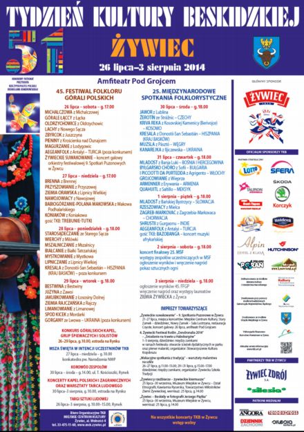 W środę rozpoczynają się natomiast Międzynarodowe Spotkania Folklorystyczne. Zaprezentuje się na nich 14 zespołów z 12 krajów, w tym 3 z Polski. Będą reprezentanci Europy, Azji i Ameryki Północnej. Koncert finałowy Międzynarodowych Spotkań Folklorystycznych odbędzie się w sobotę 2 sierpnia. Rozstrzygnięcia w ramach Festiwalu Folkloru Górali Polskich zostaną ogłoszone w niedzielę 3 sierpnia. Na zwycięzców czekają już Złote, Srebrne i Brązowe Żywieckie Serca. Tegorocznemu Tygodniowi Kultury Beskidzkiej w Żywcu towarzyszy wiele imprez towarzyszących. Organizatorzy zapraszają m.in. na „Żywieckie su wakowanie”, 4. Żywiecki Festiwal Roślin „Dendronalia 2014”, warsztaty malarstwa na szkle, czy wystawę „Żywiec – Beskidy w fotografii Jerzego Piątka”.