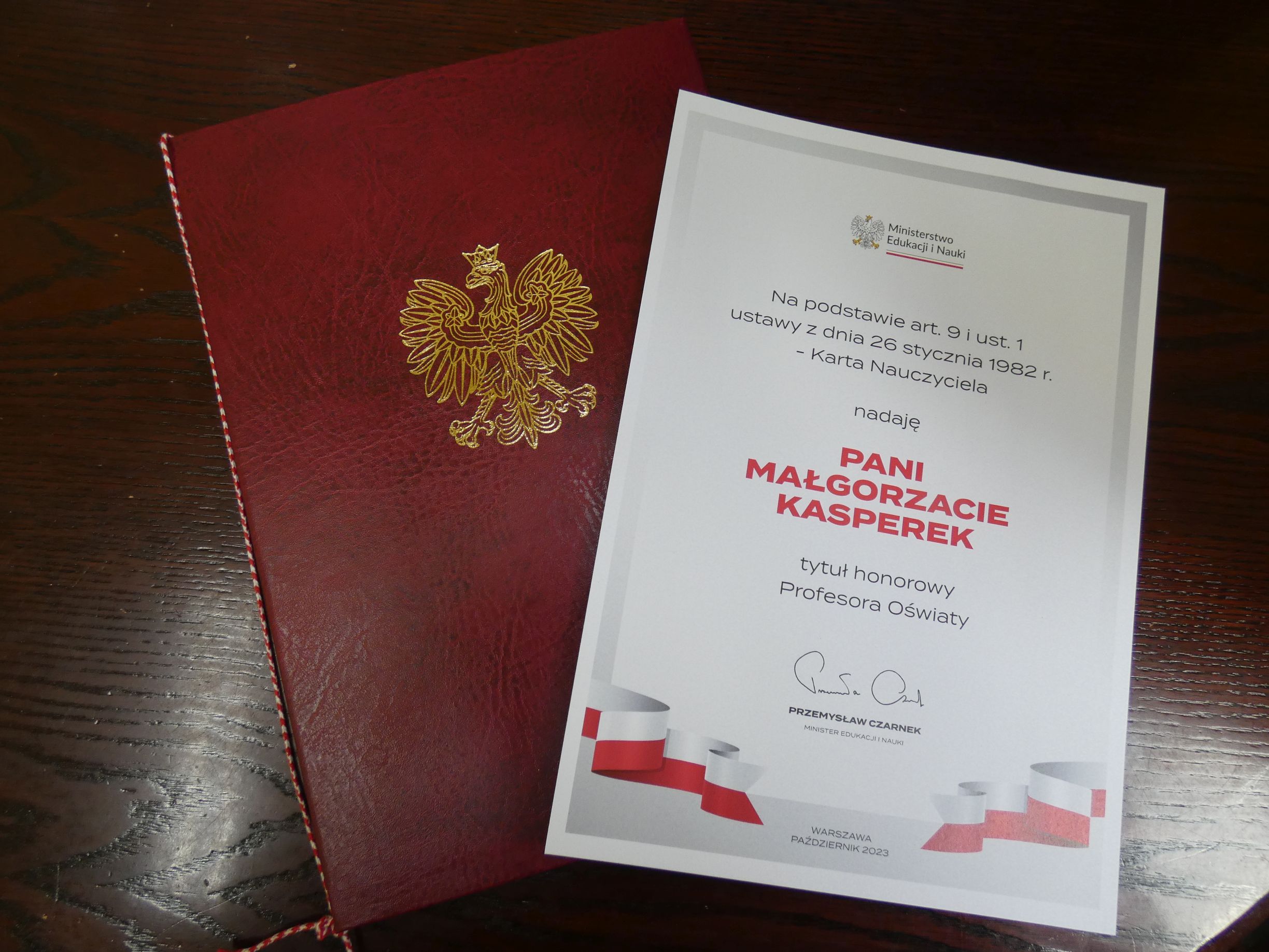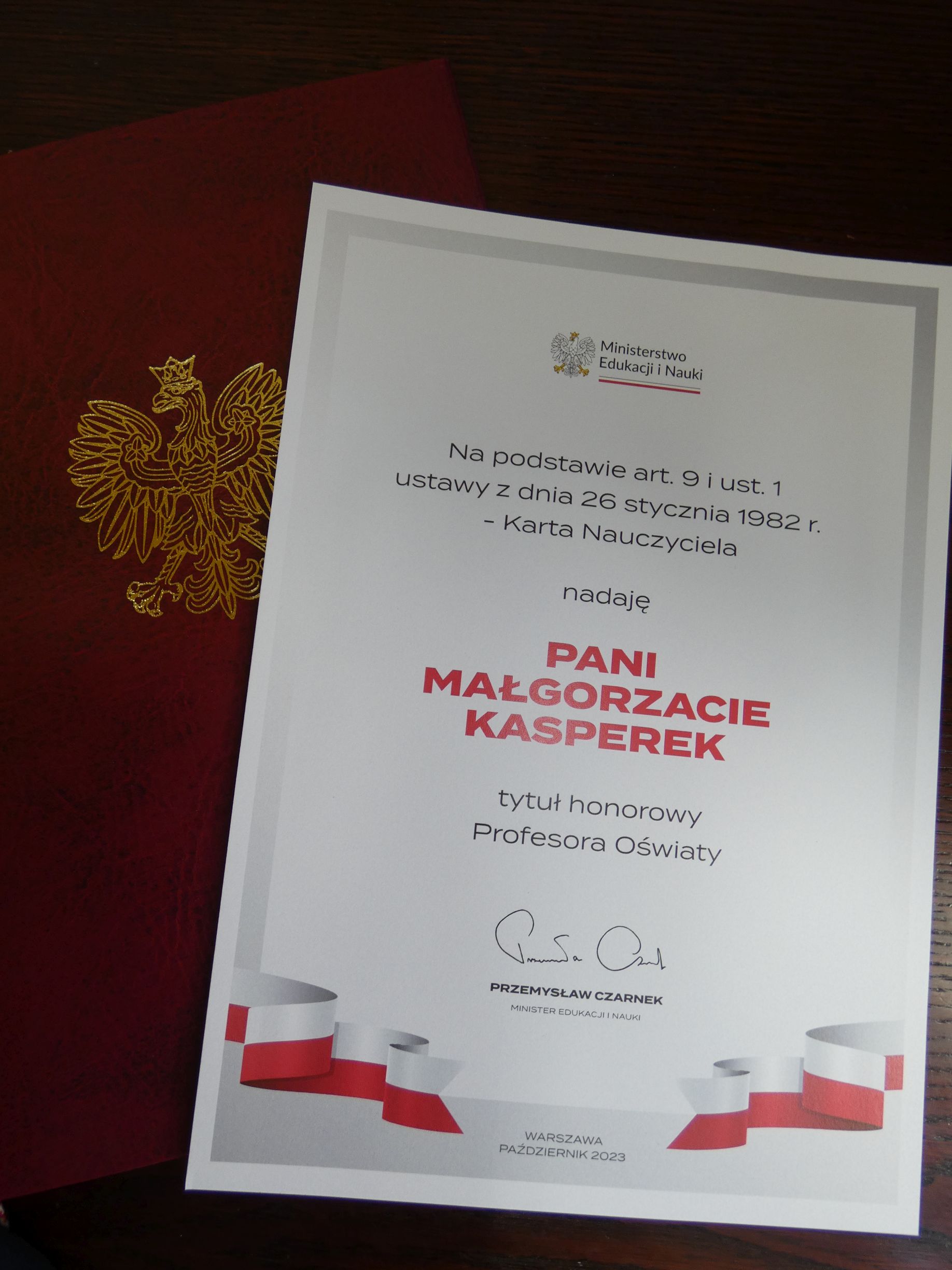Tytuł ten przyznawany jest nauczycielom, którzy przez lata pracy wyróżniali się osiągnięciami dydaktycznymi i wychowawczymi. Dzielili się wiedzą oraz doświadczeniem z innymi nauczycielami, a swoją postawą stworzyli wzorzec nauczyciela i wychowawcy. Tytuł honorowy Profesora Oświaty nadaje Minister Edukacji i Nauki na wniosek Kapituły do spraw Profesorów Oświaty. Kapituła składa się z 16 członków powoływanych przez ministra. Tworzą ją osoby będące uznanymi autorytetami w dziedzinie oświaty. Nadanie tytułu honorowego Profesora Oświaty  zostało wręczone pani dyrektor Małgorzacie Kasperek  przez Ministra Edukacji i Nauki w dniu 13 października 2023r. podczas uroczystości z okazji Dnia Edukacji Narodowej  w Zamku Ujazdowskim w Warszawie.
