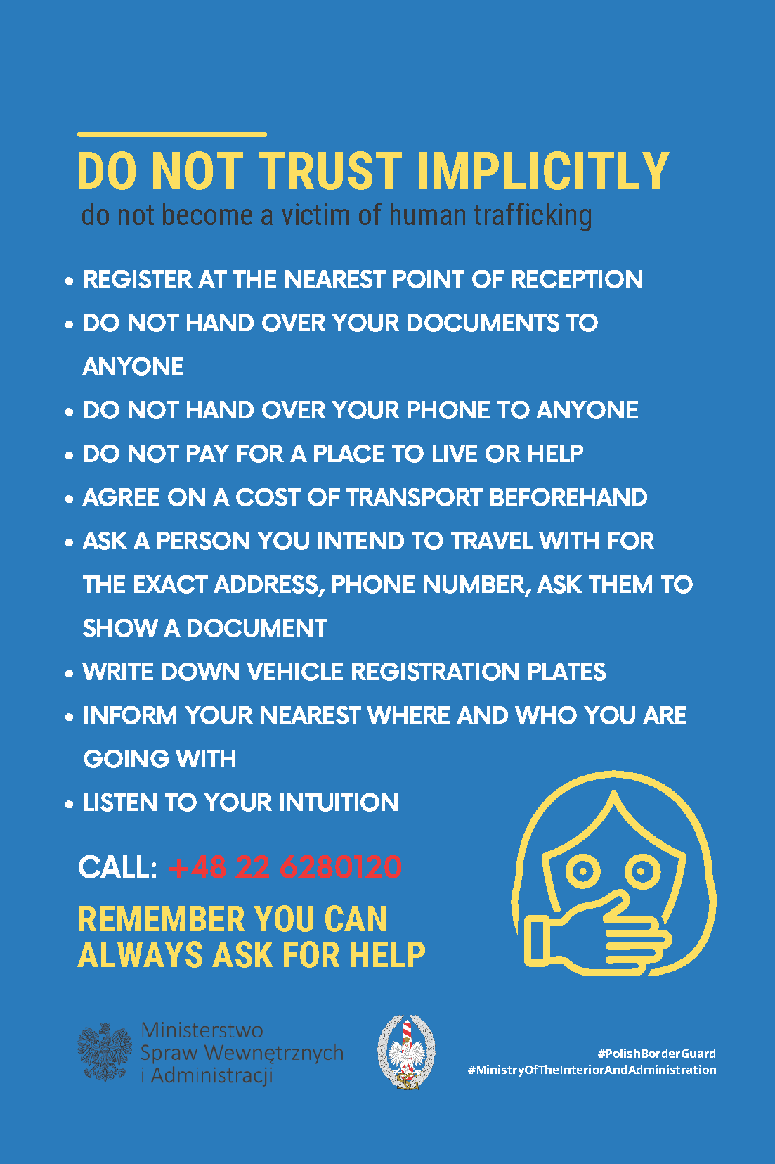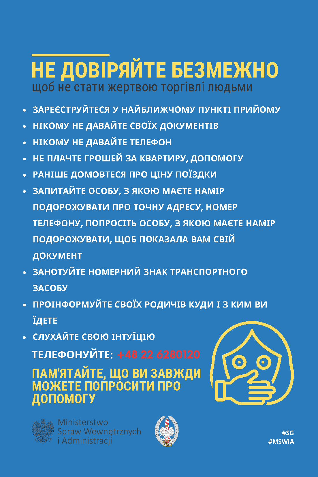 W związku z powyższym Biuro Prezydialne Komendy Głównej Straży Granicznej i Departament Spraw Międzynarodowych i Migracji MSWiA wspólnie opracowali merytorycznie i graficznie ulotkę skierowaną do obywateli Ukrainy przekraczających granice polsko-ukraińską. W przypadku jakiegokolwiek podejrzenia handlu ludźmi - obywatele Ukrainy, jak również wszystkich innych państw mogą prosić o pomoc Krajowe Centrum Informacyjno-Konsultacyjne.