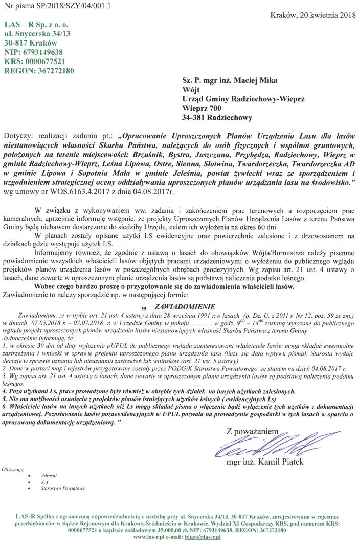 Dotyczy: realizacji zadania pt.: „Opracowanie Uproszczonych Planów Urządzenia Lasu dla lasów niestanowiących własności Skarbu Państwa, należących do osób fizycznych i wspólnot gruntowych, położonych na terenie miejscowości: Brzuśnik, Bystra, Juszczuna, Przybędza, Radziechowy, Wieprz w gminie Radziechowy-Wieprz, Leśna Lipowa, Ostre, Sienna, Słotwina, Twardorzeczka, Twardorzeczka AD w gminie Lipowa i Sopotnia Mała w gminie Jeleśnia, powiat żywiecki wraz ze sporządzeniem i uzgodnieniem strategicznej oceny oddziaływania uproszczonych planów urządzania lasu na środowisko." wg umowy nr WOS.6163.4.2017 z dnia 04.08.2017r.