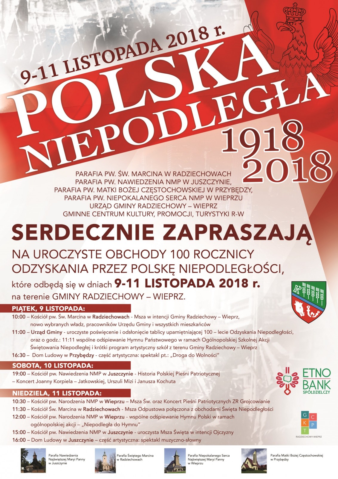 UROCZYSTE OBCHODY 100 ROCZNICY ODZYSKANIA PRZEZ POLSKĘ NIEPODLEGŁOŚCI: 9-11 LISTOPADA 2018r. W GMINIE RADZIECHOWY-WIEPRZ