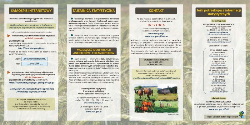W związku z powyższym zwracam się z uprzejmą prośbą o wsparcie Głównego Urzędu Statystycznego w zakresie upowszechniania badań rolniczych wśród rolników. W tym celu w załączeniu przekazuję plakat informujący o realizacji ww. badań z prośbą o umieszczenie go w widocznym miejscu na terenie Urzędu Gminy. Ponadto, w terminie późniejszym, pracownik Urzędu Statystycznego w Katowicach prześle drogą elektroniczną ulotkę informacyjną dotyczącą realizacji ww. badań rolniczych z prośbą o jej zamieszczenie na portalu Urzędu Gminy.