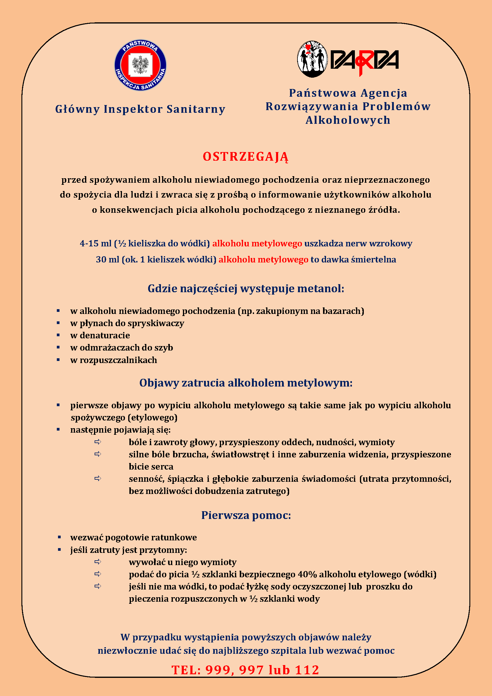 przed spożywaniem alkoholu niewiadomego pochodzenia oraz nieprzeznaczonego do spożycia dla ludzi i zwraca się z prośbą o informowanie pijących alkohol o konsekwencjach picia alkoholu pochodzącego z nieznanego źródła.
