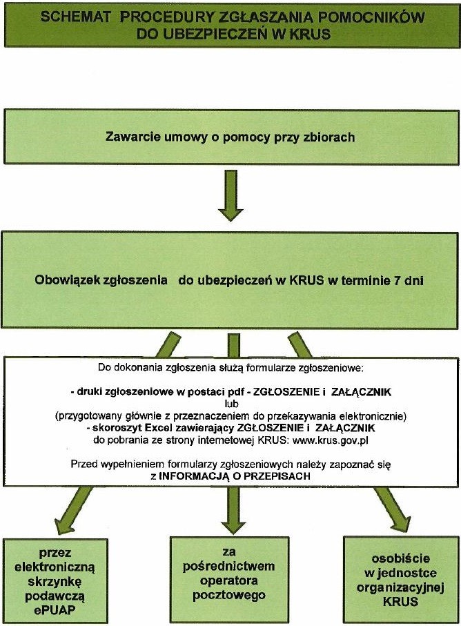 Rolnik jest zobowiązany zgłosić pomocnika do ubezpieczeń w KRUS w ciągu 7 dni od dnia zawarcia umowy o pomocy przy zbiorach, lecz nie później niż przed upływem okresu na który zawarta została ta umowa.