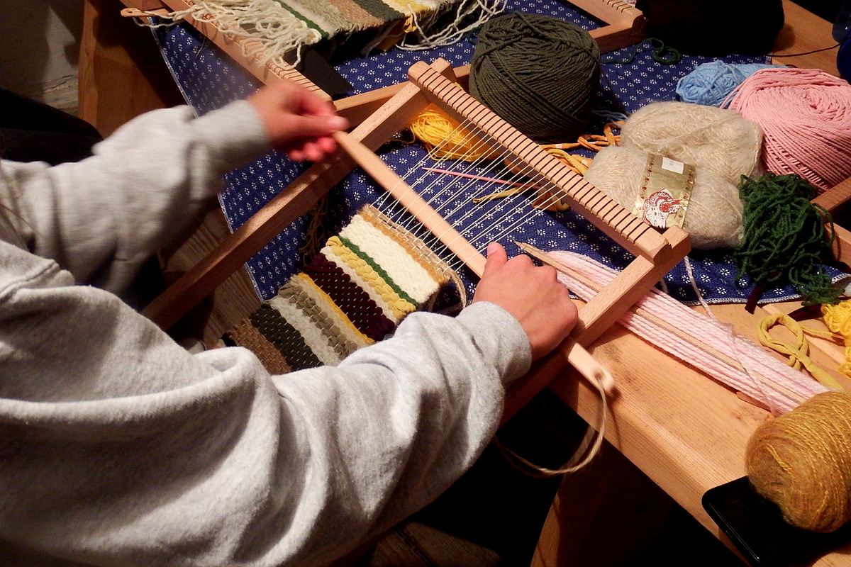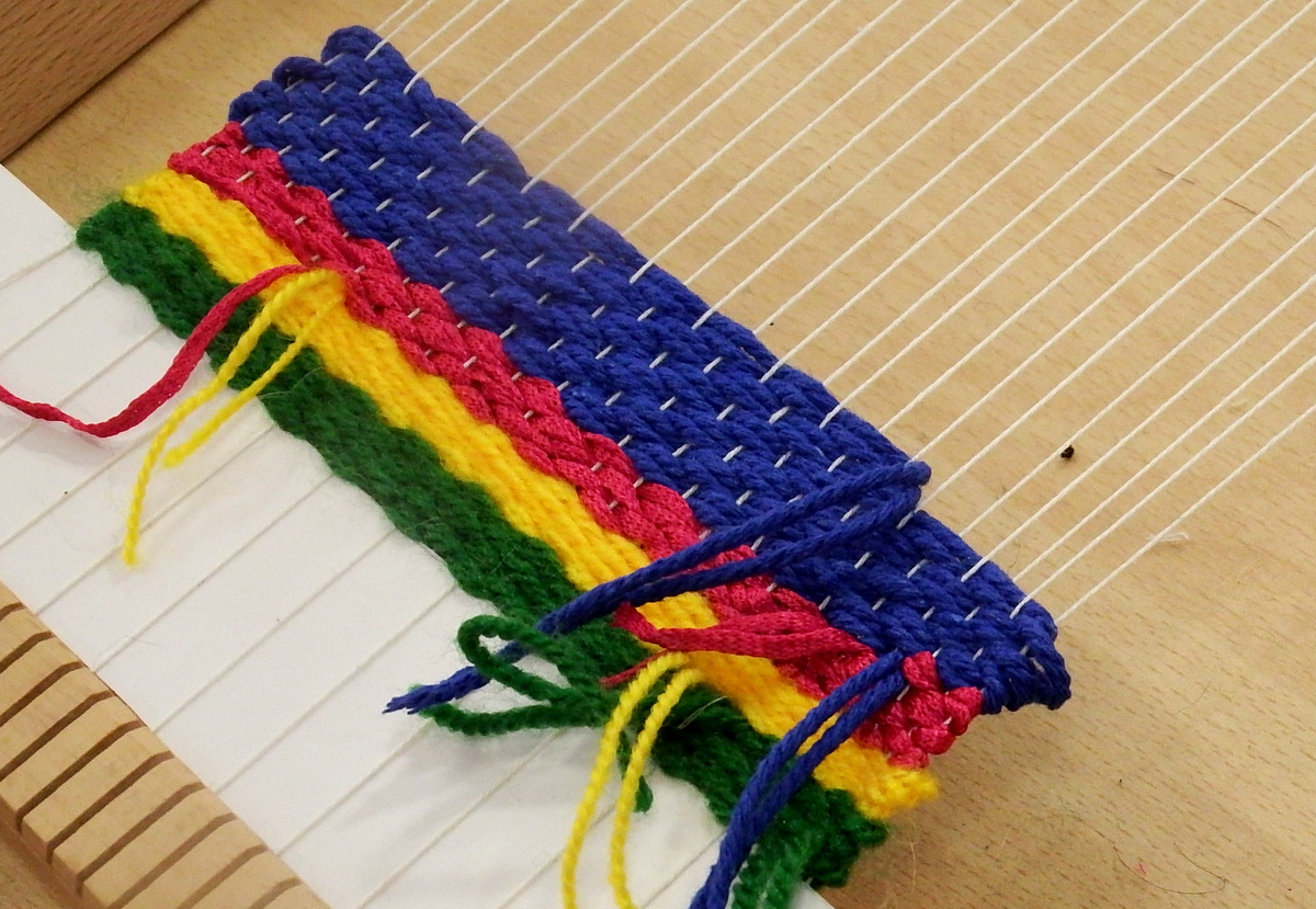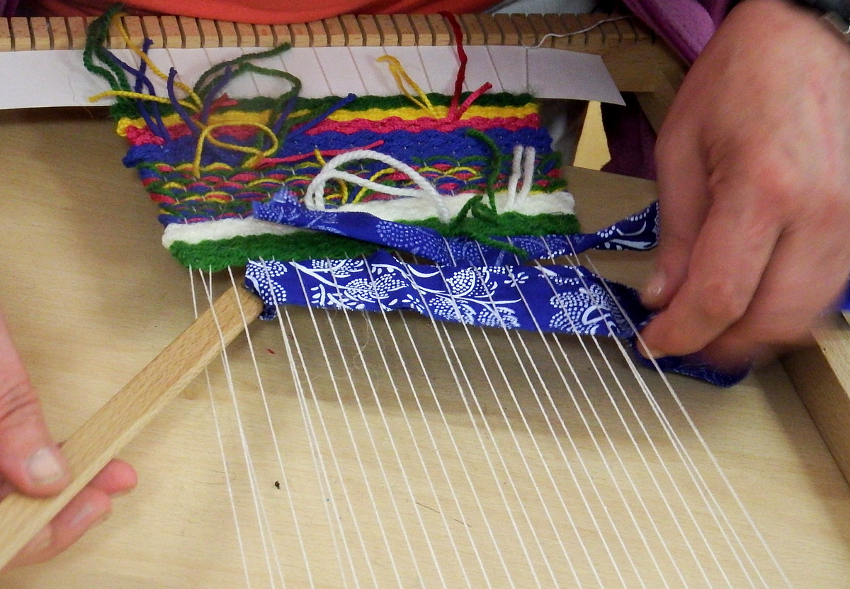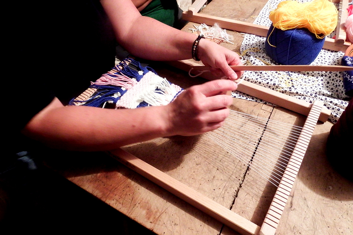 Przybędza - tym razem tkactwo na małych ramkach tkackich. Wykonaliśmy małe kilimy z użyciem materiałów pochodzących z recyklingu.