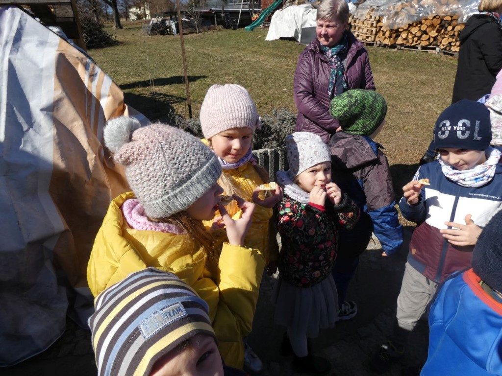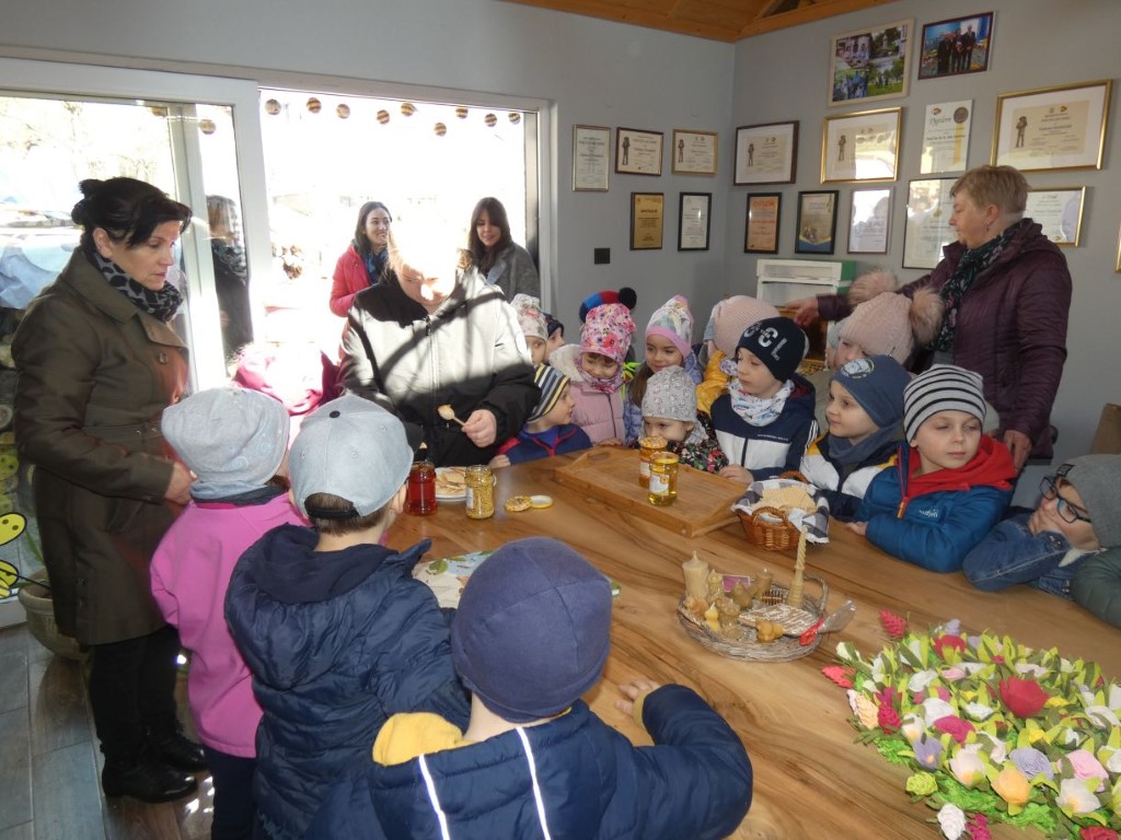 Z takimi między innymi pytaniami przychodzi panu Tadeuszowi zmagać się podczas spotkań z radziechowskimi przedszkolakami. I chociaż nie jest to proste, za każdym razem radzi sobie z odpowiedziami doskonale, starając się jednocześnie o kolejne atrakcje wzbogacające warsztaty. W tym roku mogliśmy obejrzeć wnętrze prawdziwego ula z plastrami miodu i jego mieszkańcami. Tak się złożyło, że w tegorocznej wycieczce do Radziechowskiej Barci towarzyszyły nam nauczycielki ze szkoły CEIP El Quiñón w miejscowości Seseña znajdującej się w prowincji Toledo sąsiadującej z Madrytem. To już trzecia wizyta studyjna hiszpańskich pedagogów w naszym przedszkolu w tym roku szkolnym w ramach unijnego programu Erasmus + dzięki współpracy ze Szkołą Podstawową nr 2 im. Św. Franciszka z Asyżu w Cięcinie. Tradycyjnie już warsztaty pszczelarskie zakończyliśmy degustacją różnego rodzaju miodów i pyłku pszczelego. A wszystkim tym wydarzeniom towarzyszyła piękna wiosenna pogoda, która uatrakcyjniła warsztaty wyprowadzając z uli jej brzęczących mieszkańców.