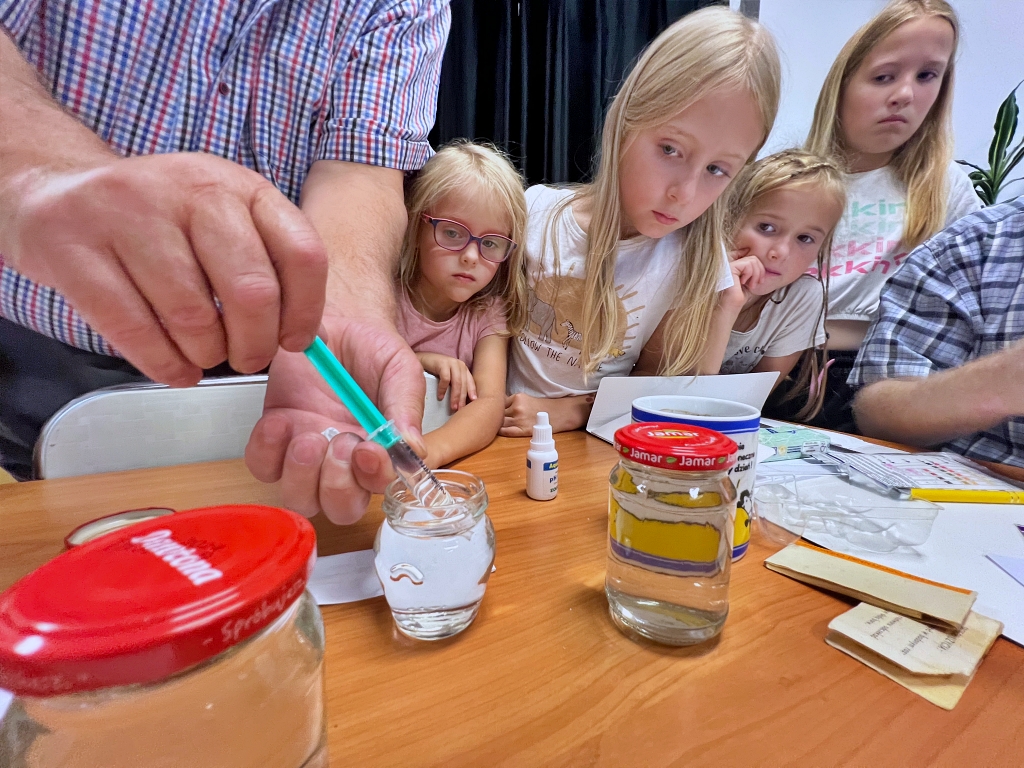 Warsztaty, odbywające się pod hasłem „Woda źródłem życia”, zgromadziły liczne grono dzieci, które z wielkim zaangażowaniem słuchały pana Maurycego i pana Bogusława. Młodzi uczestnicy poznali wiele ciekawostek dotyczących rzeki Soły i jej mieszkańców.