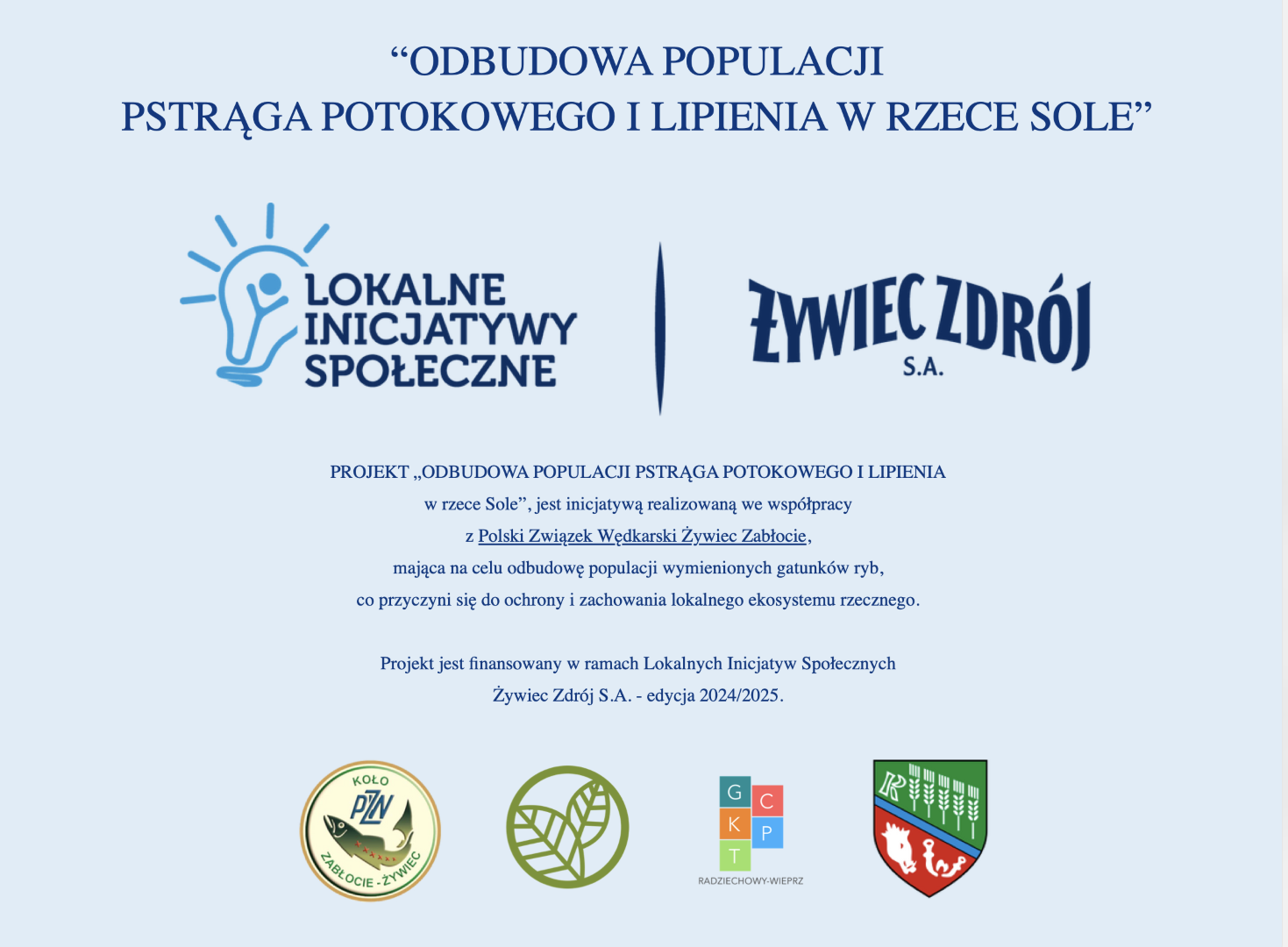 W dniu 7 sierpnia odbyły się warsztaty w ramach projektu „Odbudowa populacji pstrąga oraz lipienia w rzece Sole”, realizowanego w ramach lokalnych inicjatyw społecznych Żywiec Zdrój, edycja 2024/2025. Zajęcia poprowadzili wspaniali przedstawiciele Polskiego Związku Wędkarskiego Zabłocie Żywiec, który wspólnie z Gminnym Centrum Kultury, Promocji i Turystyki realizuje ten ważny dla Gminy Radziechowy-Wieprz projekt.